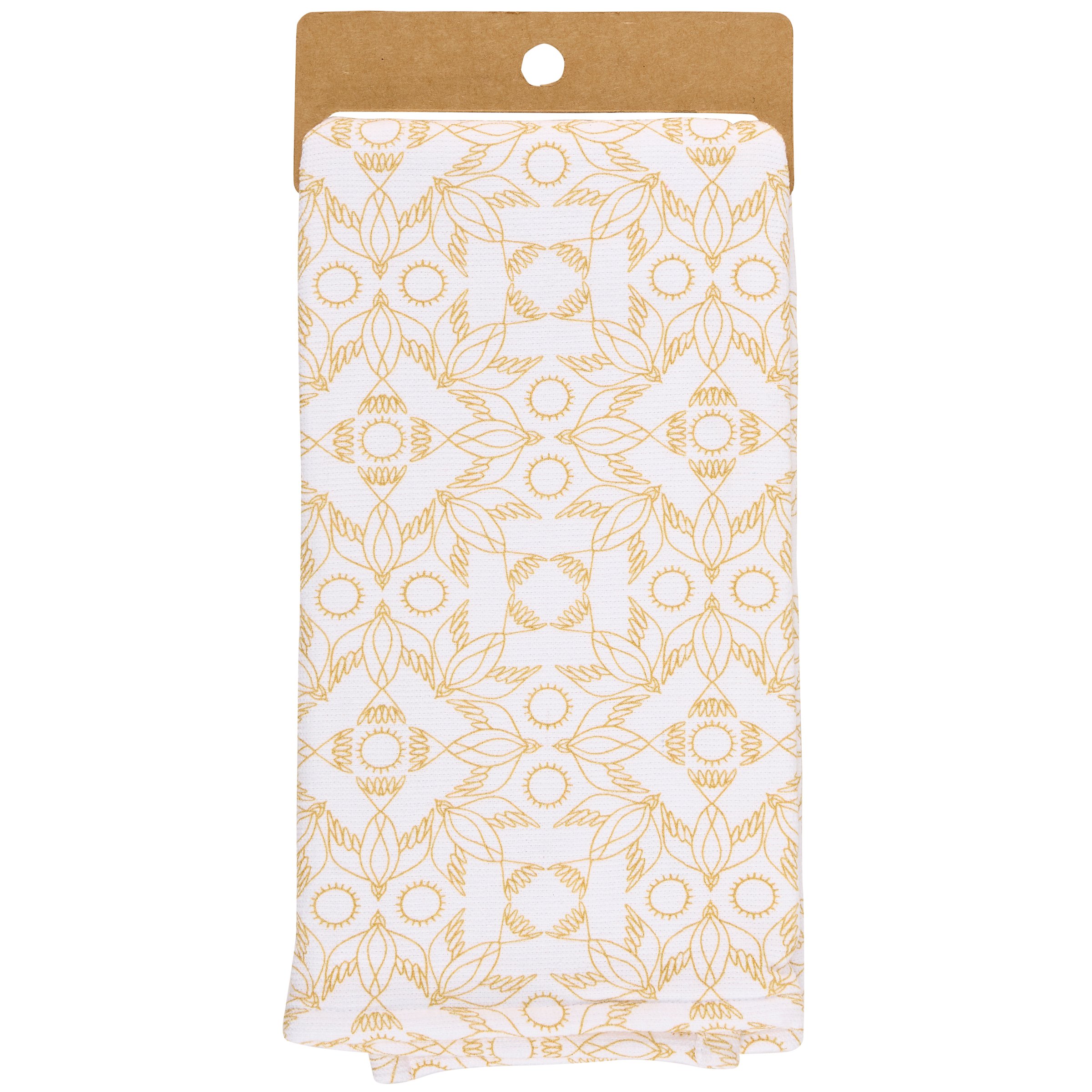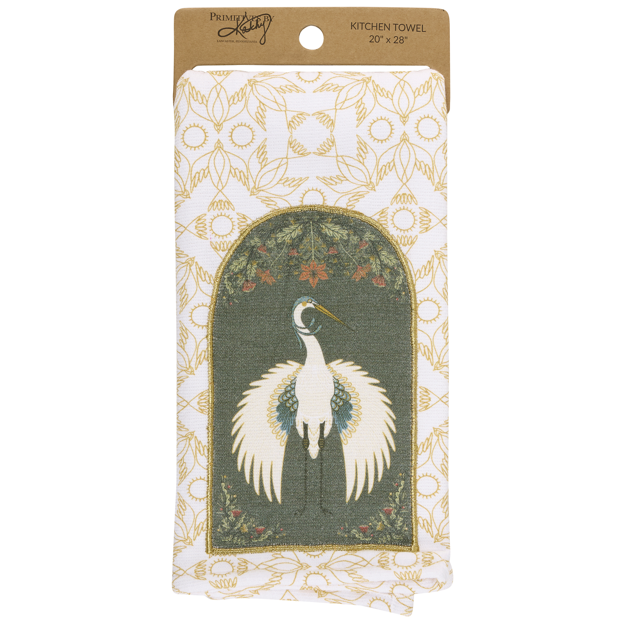 A cotton kitchen towel from our Art Nouveau Collection featuring an art nouveau inspired design with a stitched art panel on an elegant bird pattern. Art panel displays a crane and florals with a metallic gold thread border. Crane kitchen towel features a terrycloth layer on the back for added absorbency. Our Nouveau Crane kitchen towel is conveniently machine-washable for easy cleaning. Nouveau kitchen towel is packaged on a cardboard hanger with hole to easily display on rack. A vintage kitchen accessory perfect for everyday use.