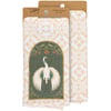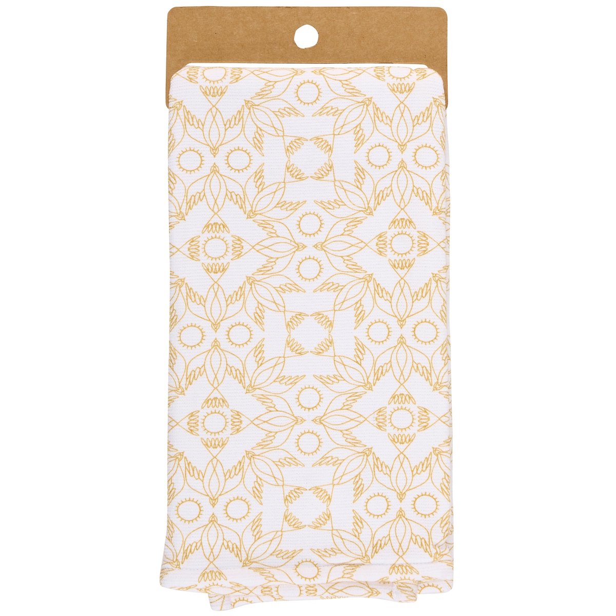 A cotton kitchen towel from our Art Nouveau Collection featuring an art nouveau inspired design with a stitched art panel on an elegant bird pattern. Art panel displays a crane and florals with a metallic gold thread border. Crane kitchen towel features a terrycloth layer on the back for added absorbency. Our Nouveau Crane kitchen towel is conveniently machine-washable for easy cleaning. Nouveau kitchen towel is packaged on a cardboard hanger with hole to easily display on rack. A vintage kitchen accessory perfect for everyday use.