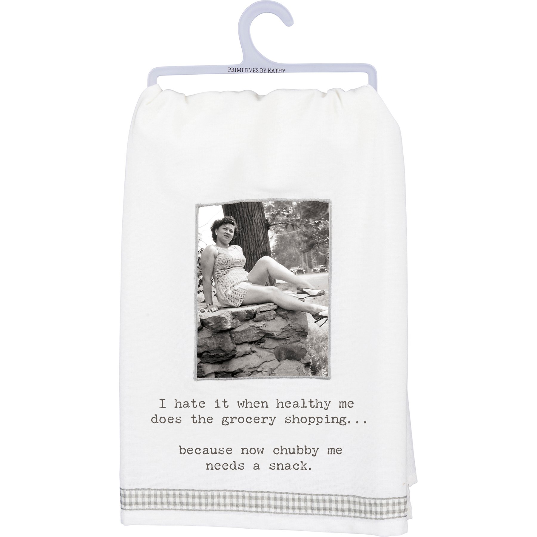 A cotton kitchen towel lending an "I Hate It When Healthy Me Does The Grocery Shopping... Because Now Chubby Me Needs A Snack." sentiment and featuring vintage photography, panel stitched accents, and gingham trim. Complements well with coordinating design pieces for a humorous kitchen décor collection.