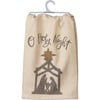 A cotton kitchen towel featuring a hand lettered "Oh Holy Night" sentiment with Nativity scene and burlap star patch. Machine-washable.