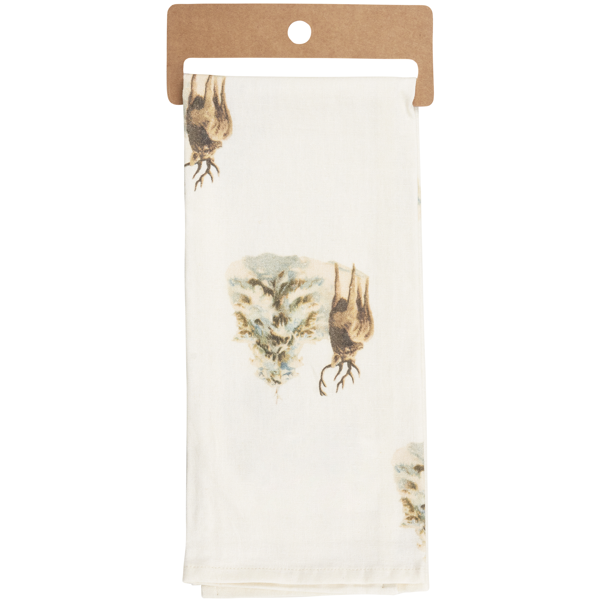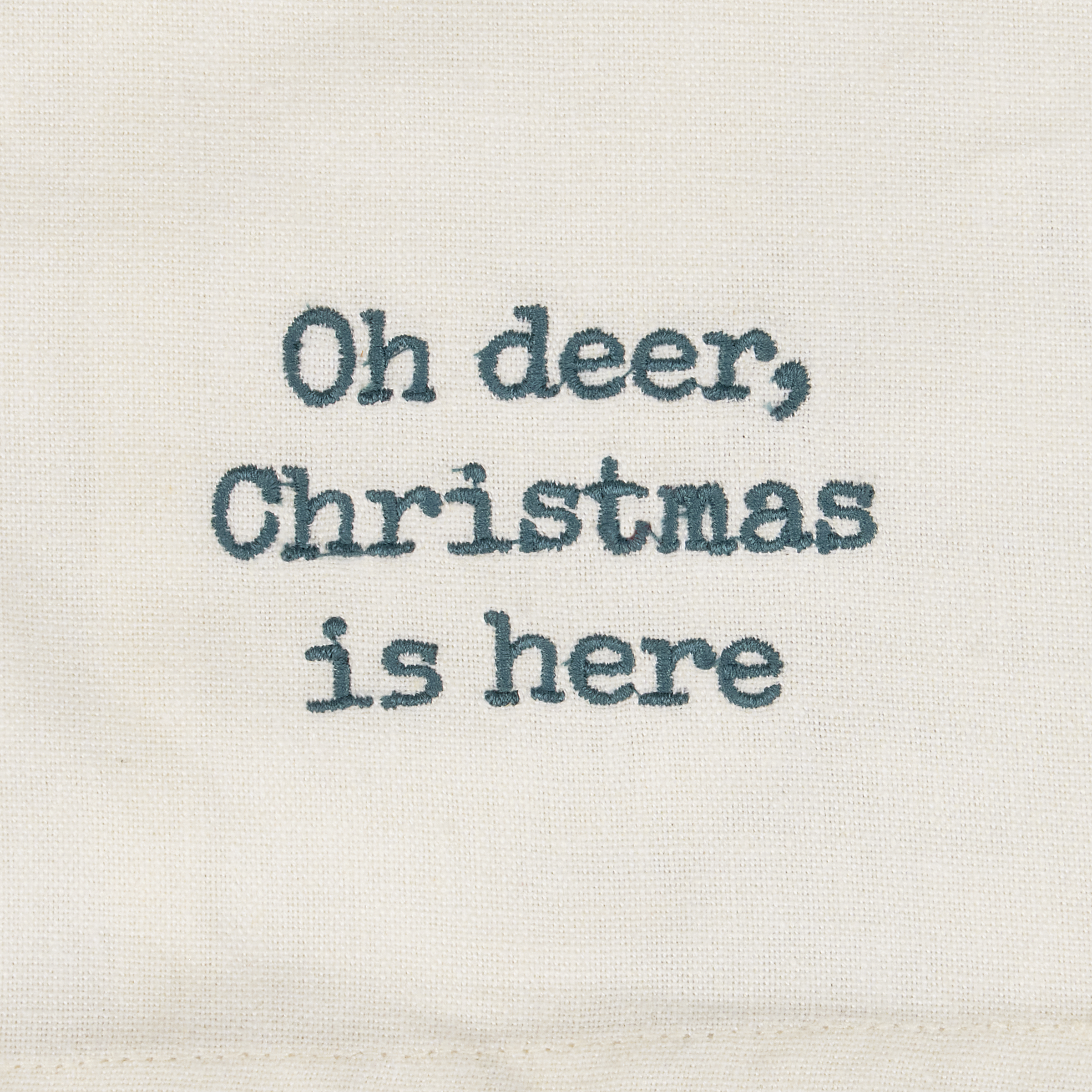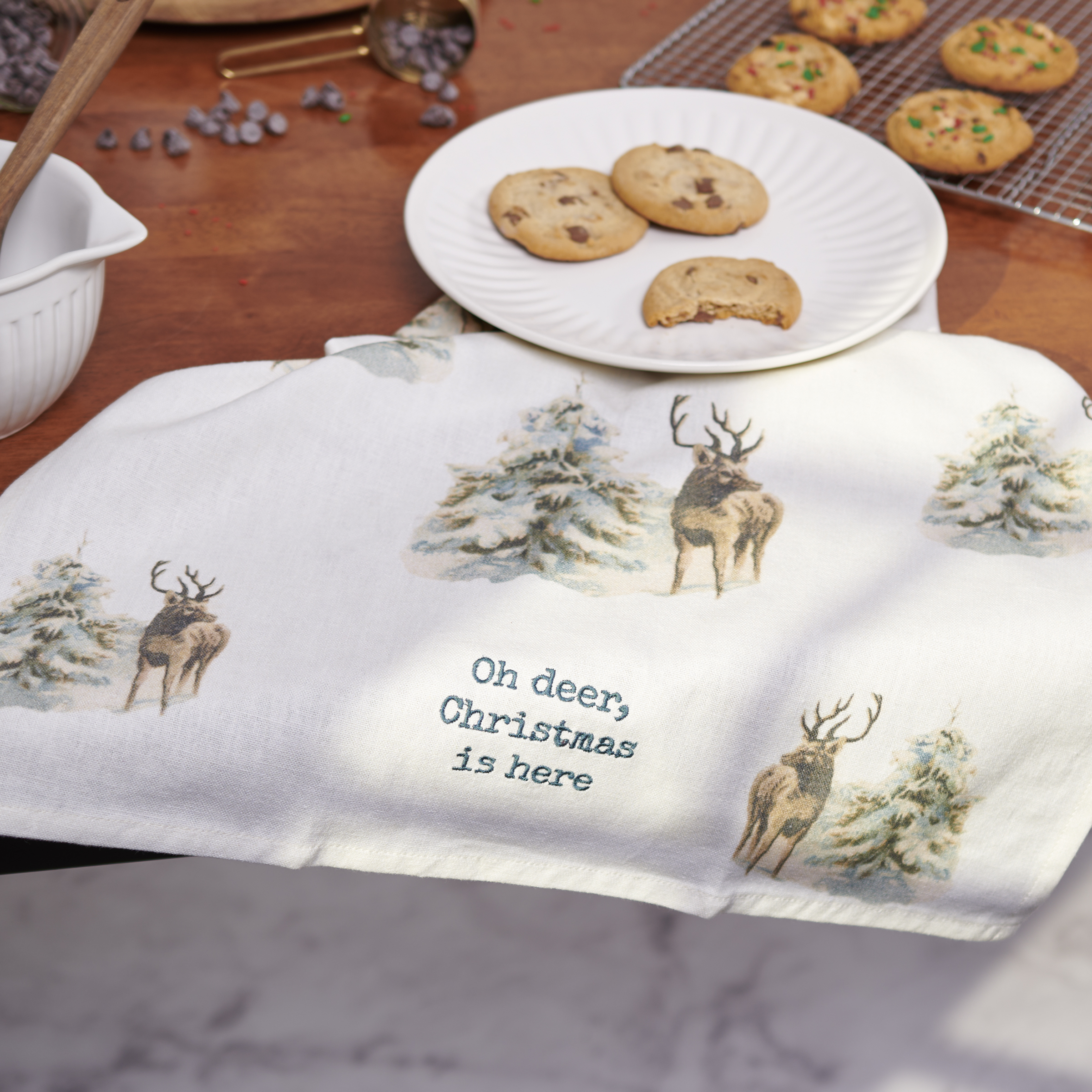 A cotton-linen kitchen towel from our Christmas Collection displaying all-over vintage designs of a deer next to a winter tree with a coordinating Christmas inspired pun that reads "Oh Deer, Christmas Is Here." Sentiment is embroidered for added interest. Our Oh Deer kitchen towel is conveniently machine-washable for easy cleaning. Seasonal kitchen towel is packaged on a cardboard hanger with hole to easily display on rack. A fun Christmas-themed kitchen accessory perfect for seasonal use.