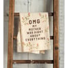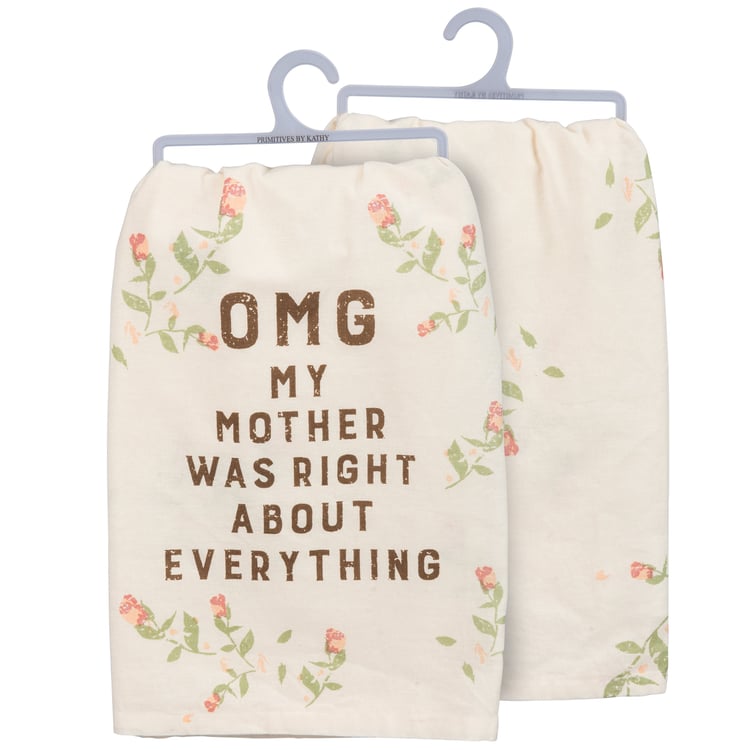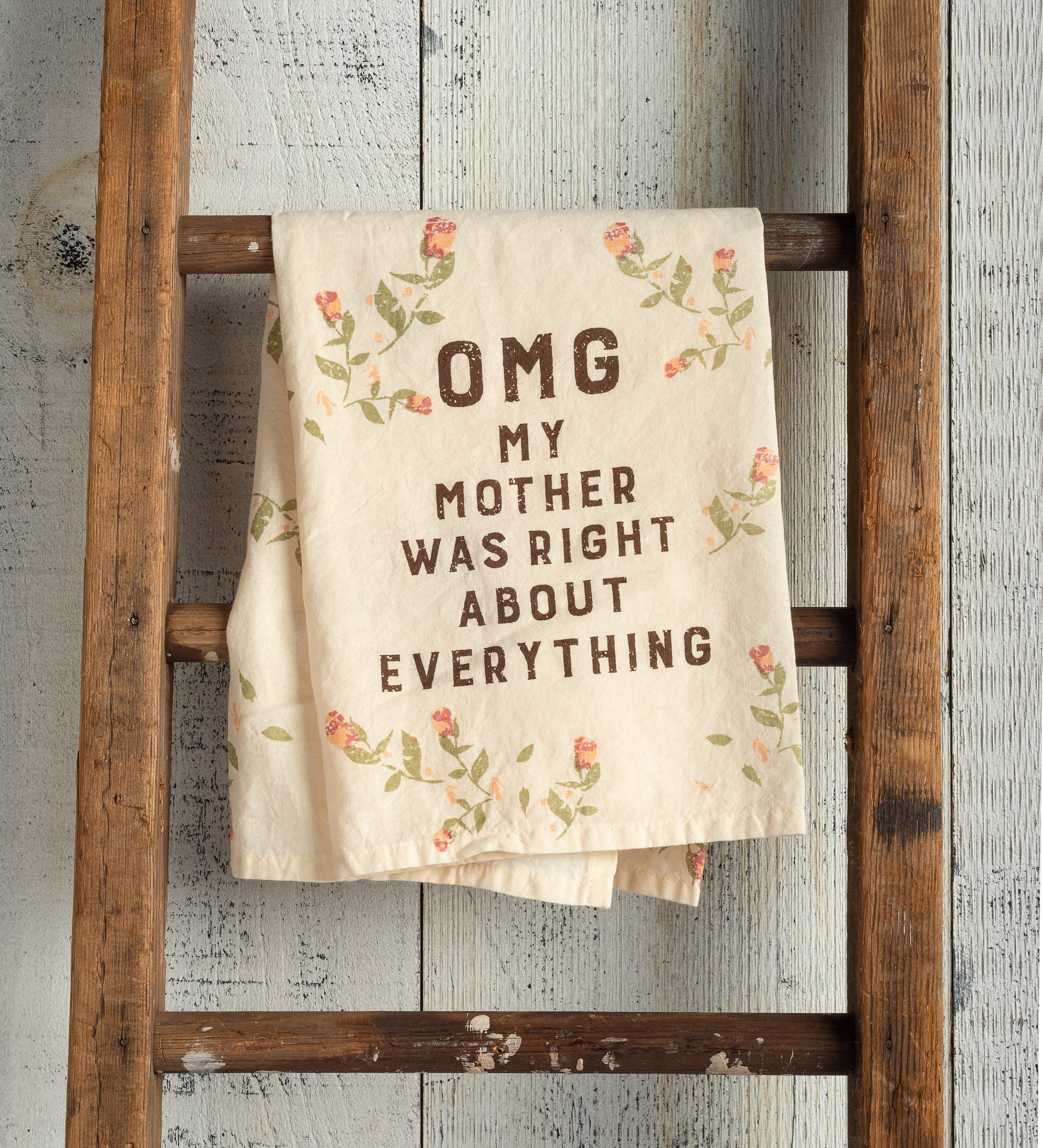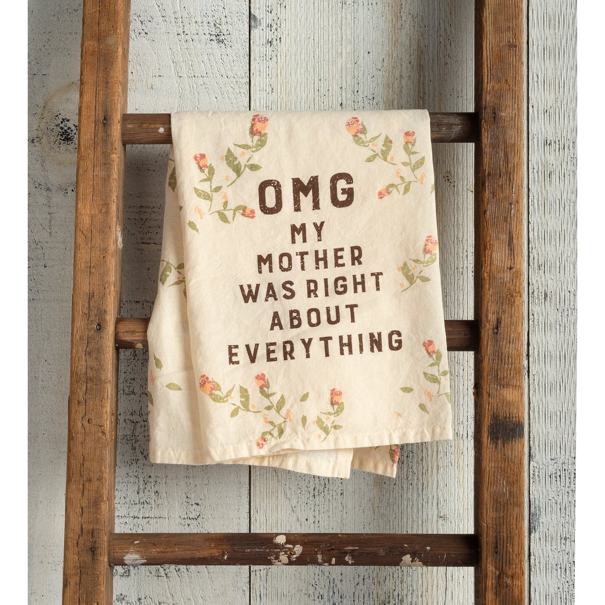 A cotton kitchen towel lending distressed "OMG My Mother Was Right About Everything" sentiment with faded floral designs throughout. Complements well with coordinating design pieces or existing decor. Machine-washable.
