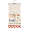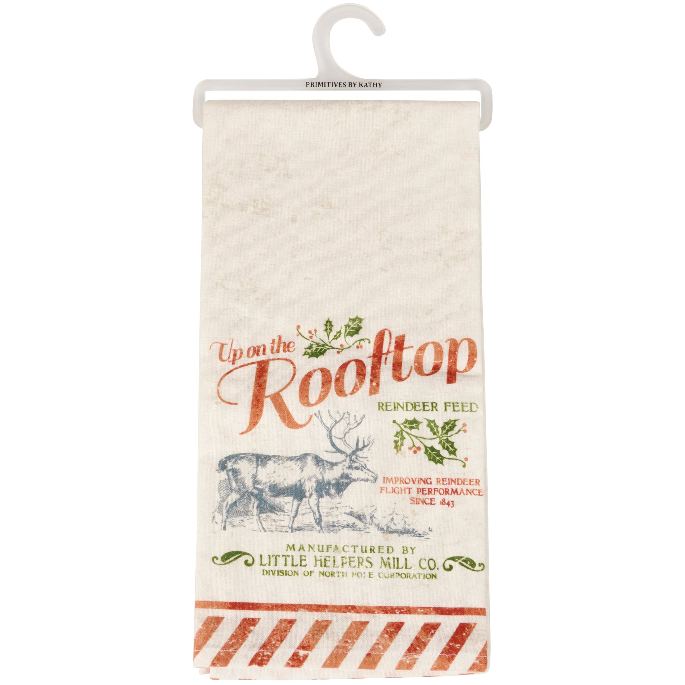 A cotton kitchen towel from our Christmas Collection displaying an "Up On The Rooftop Reindeer Feed" sentiment with a coordinating reindeer feed manufacturer design in a vintage style. Our On The Rooftop kitchen towel is conveniently machine-washable for easy cleaning. Seasonal kitchen towel is packaged on a clear plastic hanger to easily hang on rack. A vintage Christmas-themed kitchen accessory perfect for seasonal use.