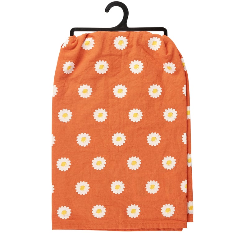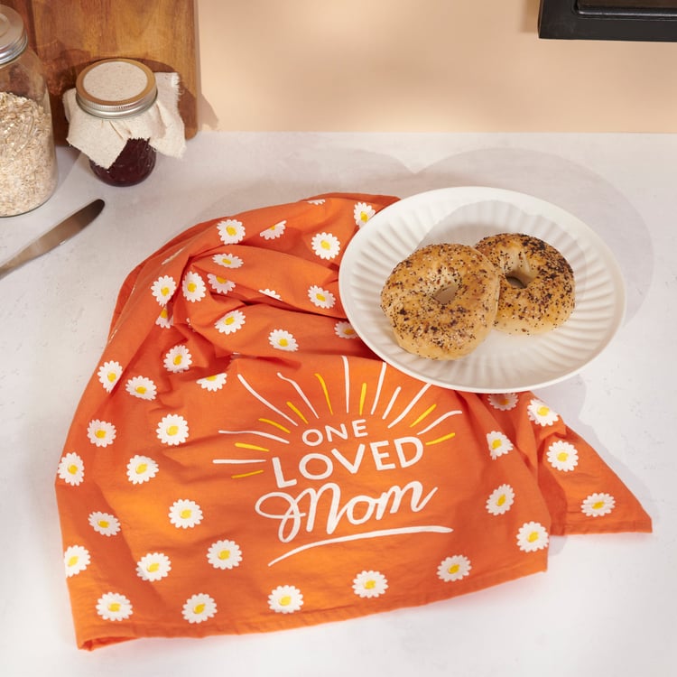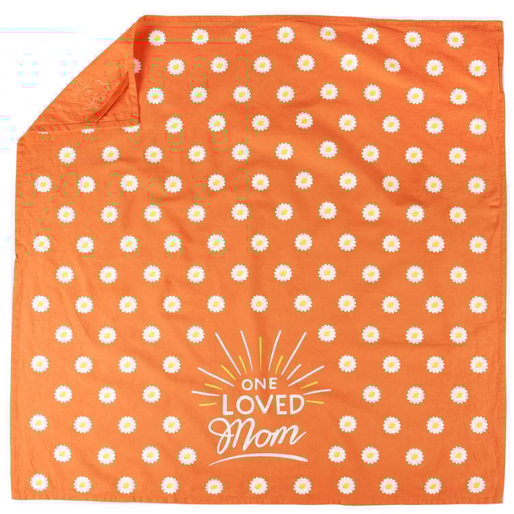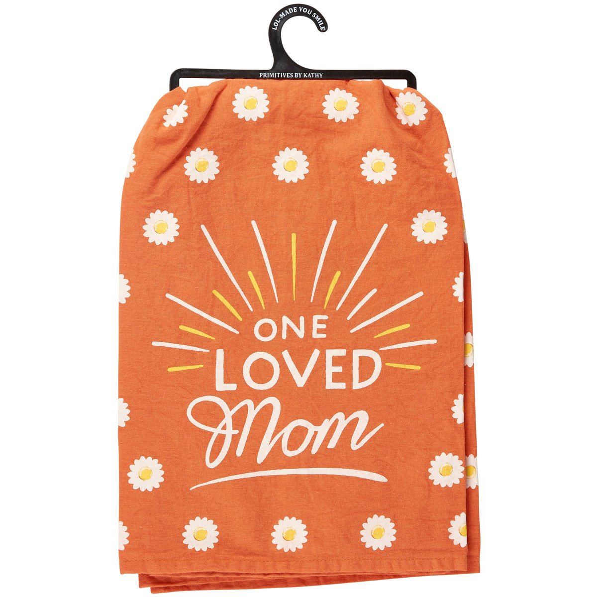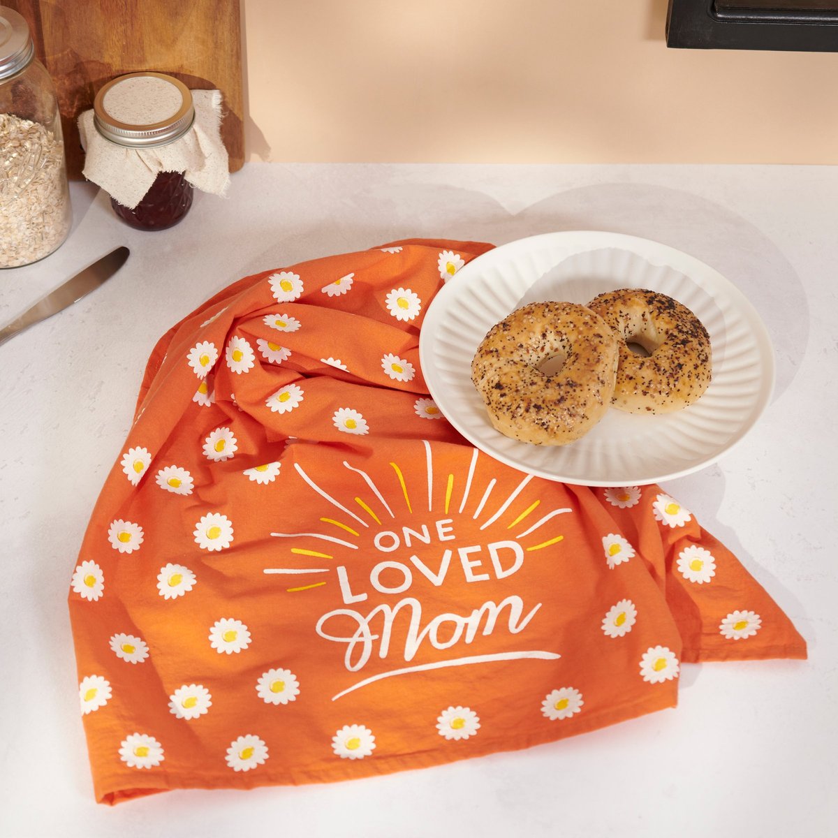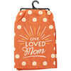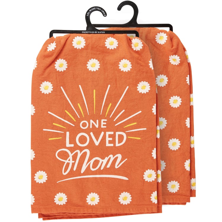 An orange cotton kitchen towel from our Mother's Day Collection displaying a unique hand illustrated mom-themed sentiment that reads "One Loved Mom" with all-over designs of daisies. Our One Loved Mom kitchen towel is machine-washable for convenient cleaning and includes cotton tape loop in corner for hanging. Packaged on a black plastic hanger to easily display on rack. A fun gift perfect for Mother's Day or as an everyday home accessory.