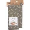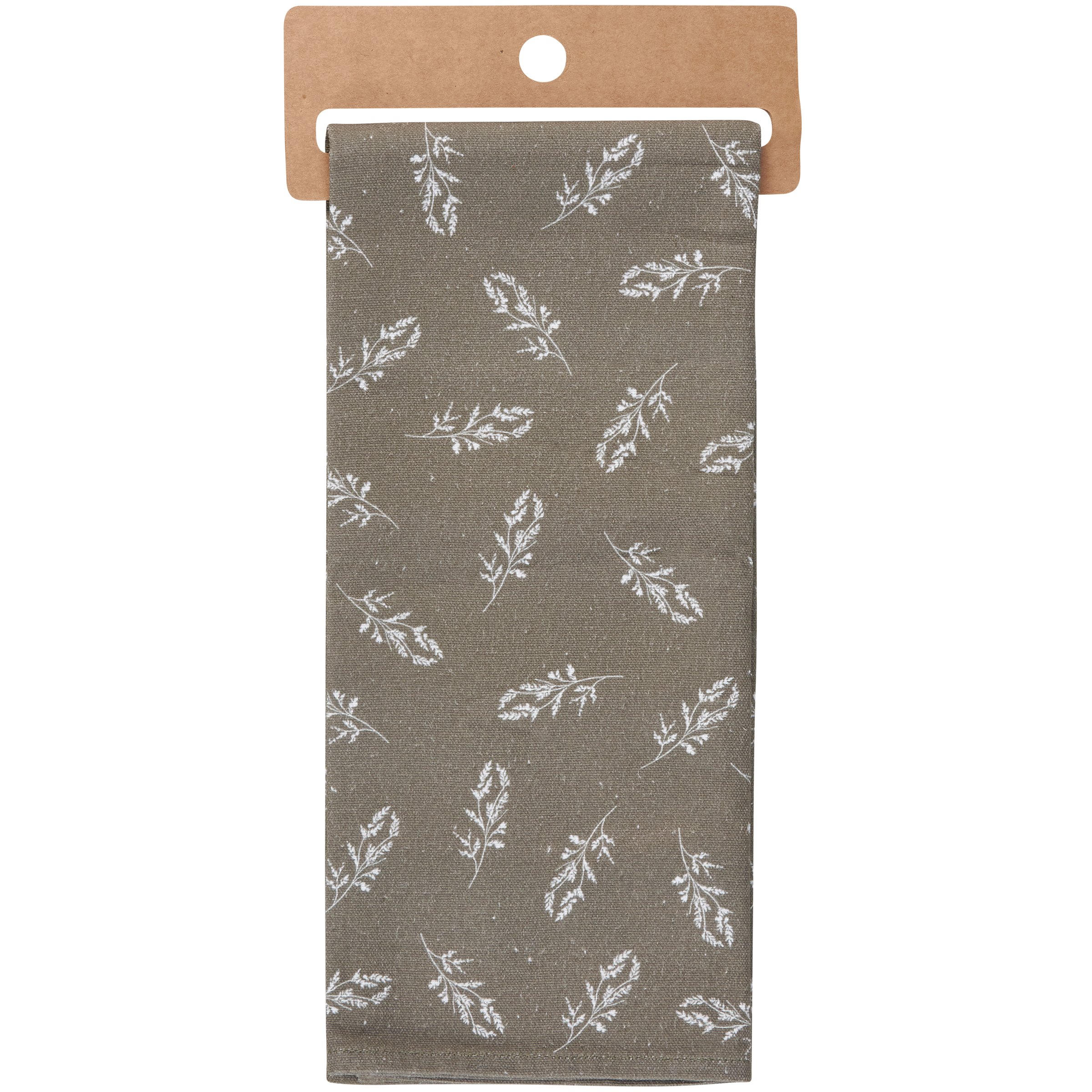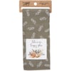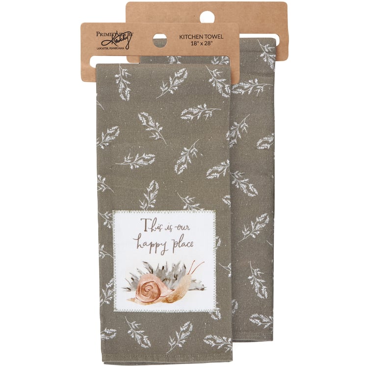 A cotton kitchen towel from our Cottagecore Collection featuring a stitched art panel and all-over leaf pattern. Art panel displays a design of a snail with an inspirational sentiment that reads "This Is Our Happy Place." Designs are replicated from original artwork hand painted in a watercolor style. Our Happy Place kitchen towel is conveniently machine-washable for easy cleaning. Packaged on a cardboard hanger with hole to easily hang on rack. A nature-themed kitchen accessory perfect for everyday use.