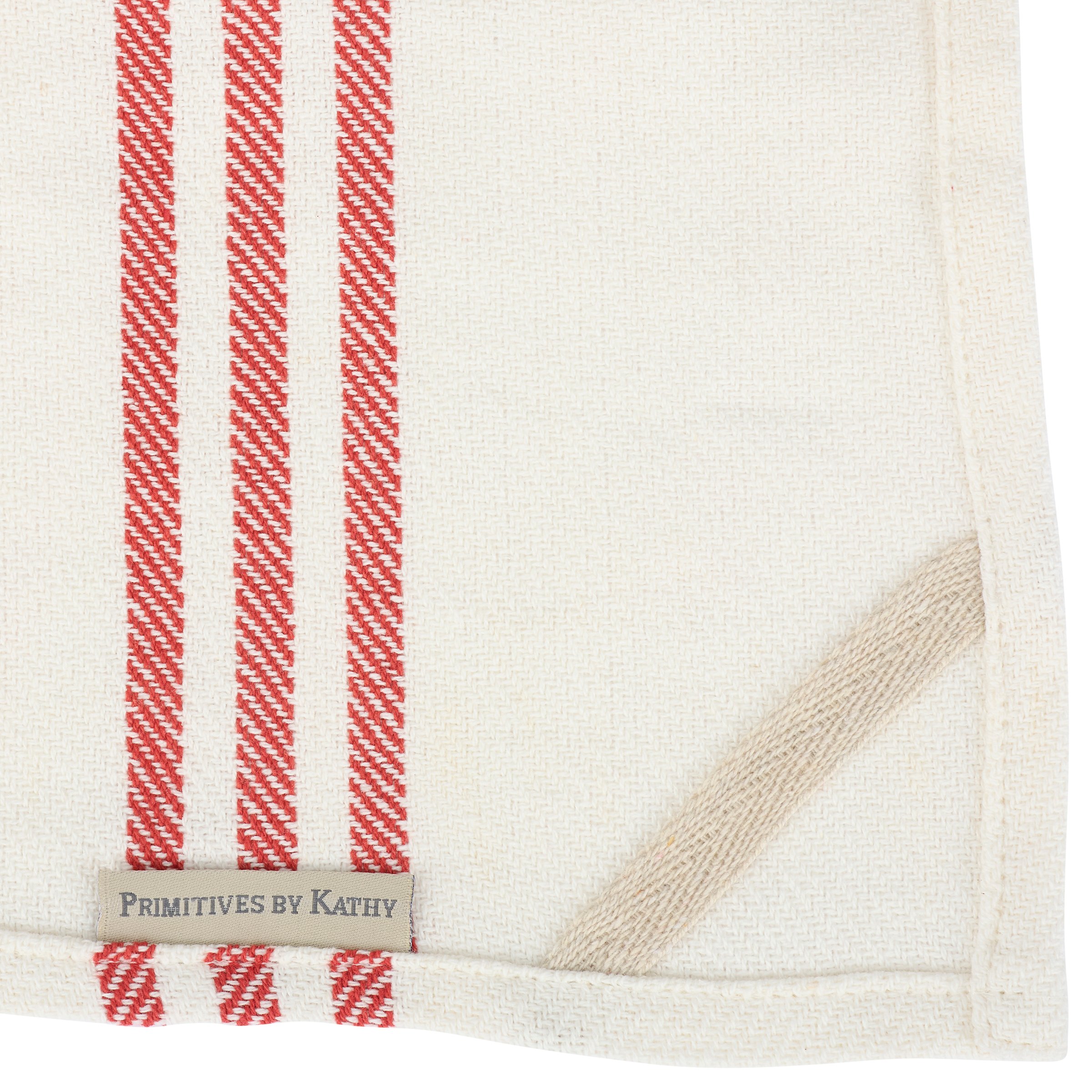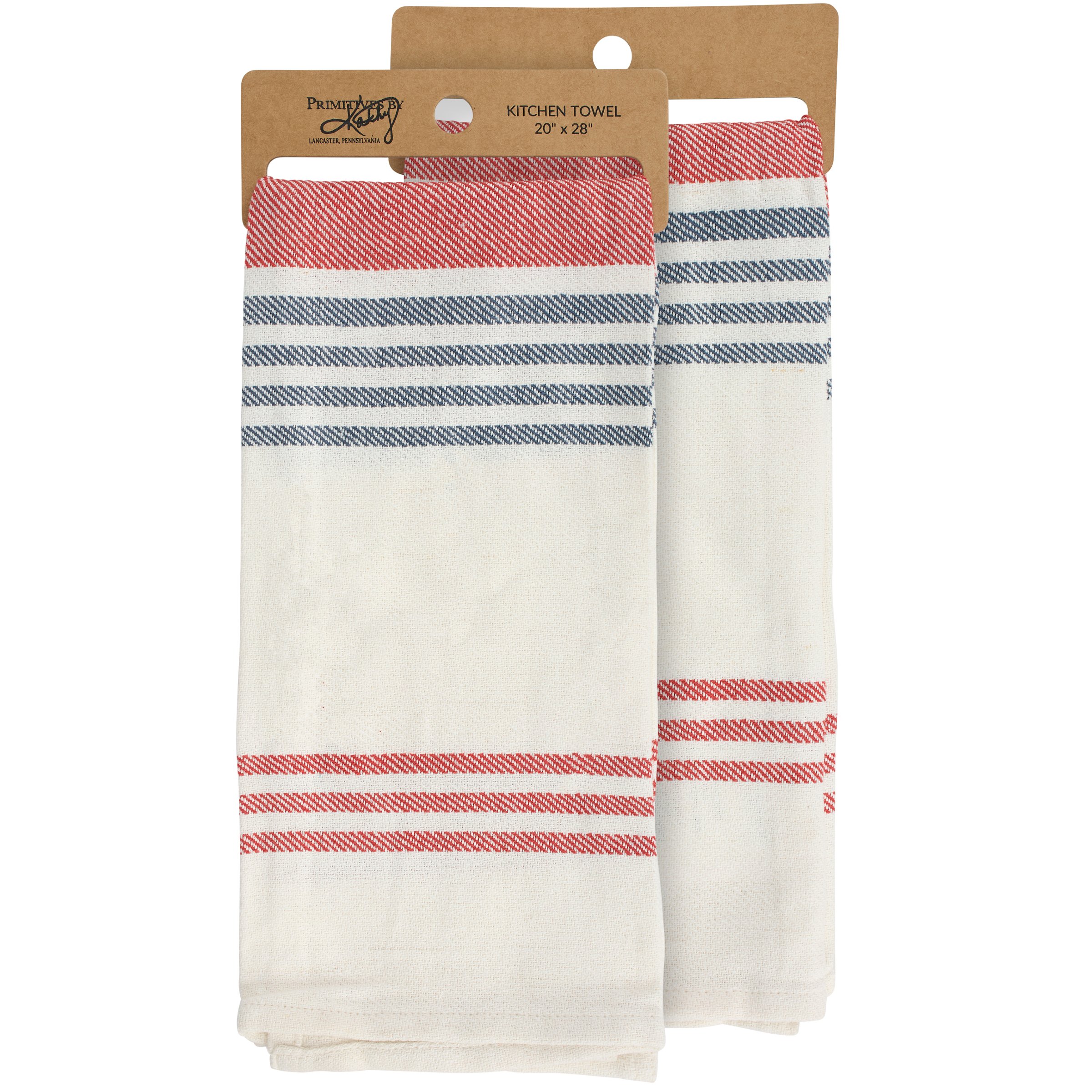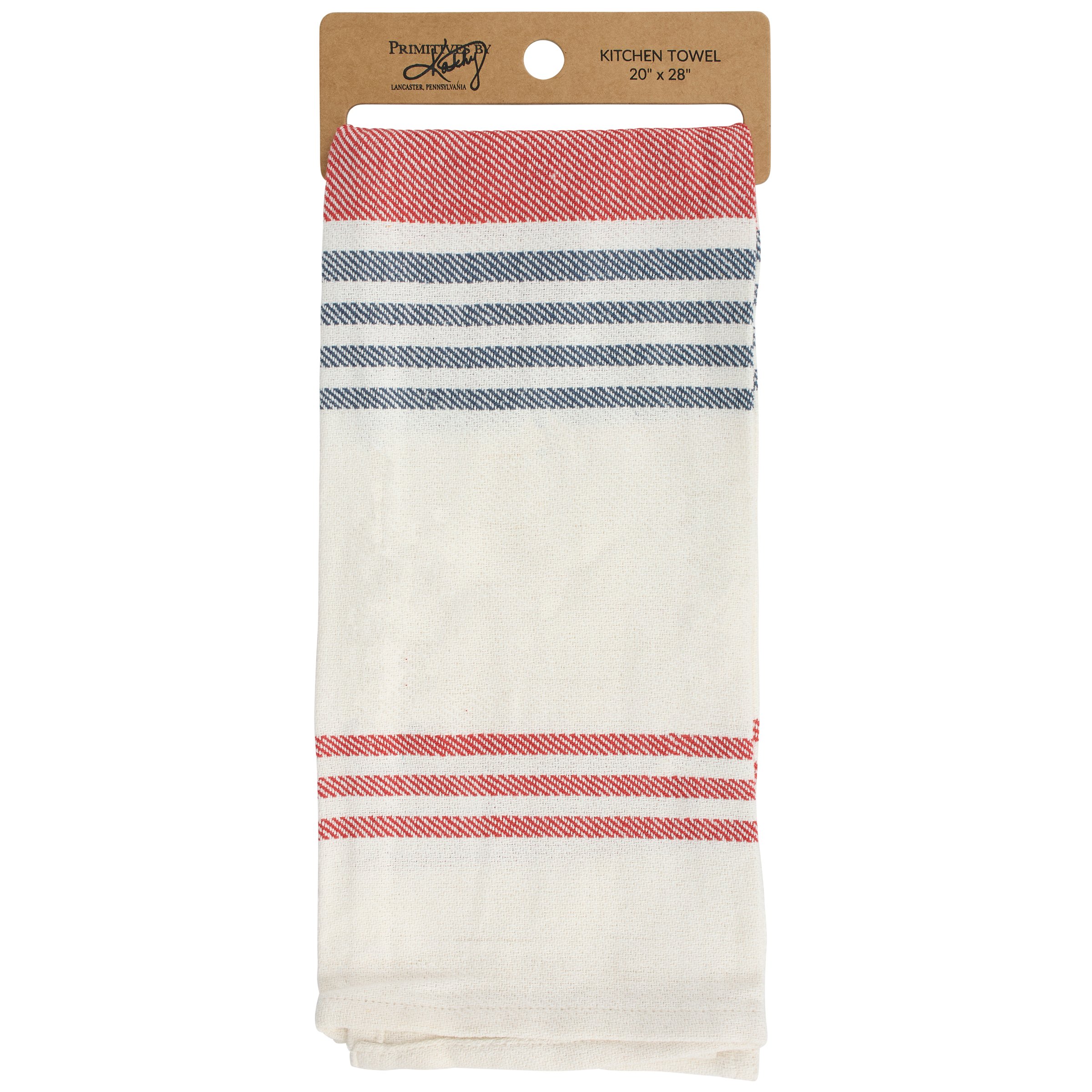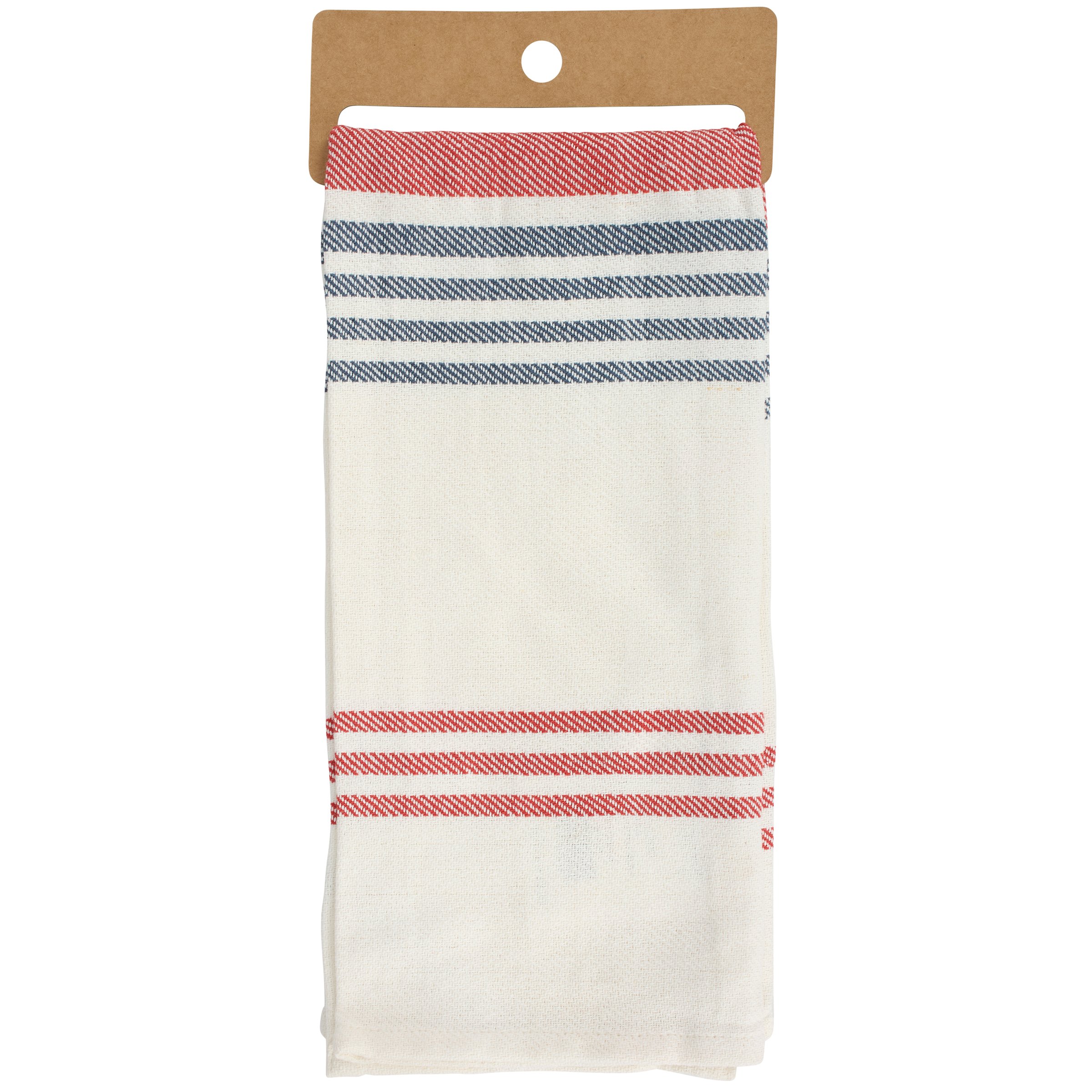 A cotton kitchen towel from our Patriotic Collection displaying an all-over design of woven red, white, and blue stripes inspired by patriotic home decor. Our Patriotic kitchen towel is conveniently machine-washable for easy cleaning. Patriotic kitchen towel is packaged on a cardboard hanger with hole to easily display on rack. A patriotic kitchen accessory perfect for 4th of July and Memorial Day decorating or celebrating stars and stripes all year round.