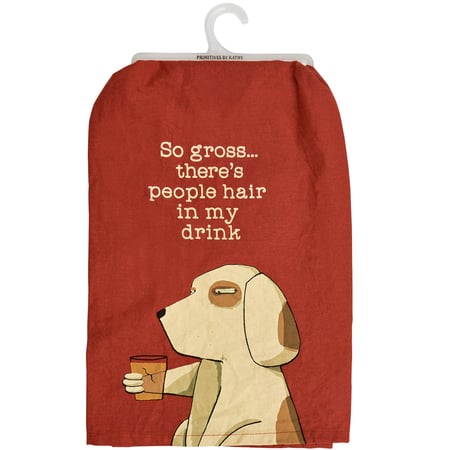 A rustic-inspired cotton kitchen towel from our Pet Collection displaying a design of a dog holding a drink with a pet-themed sentiment that reads "So Gross... There's People Hair In My Drink." Our People Hair Dog kitchen towel is conveniently machine-washable for easy cleaning. Packaged on a clear plastic hanger to easily display on rack. A fun pet-themed kitchen accessory perfect for everyday use.