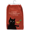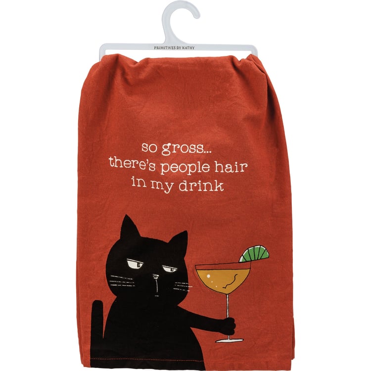 A rustic-inspired cotton kitchen towel from our Pet Collection featuring a "So Gross… There's People Hair In My Drink" sentiment with sassy cat and cocktail design. Our People Hair kitchen towel is machine-washable.