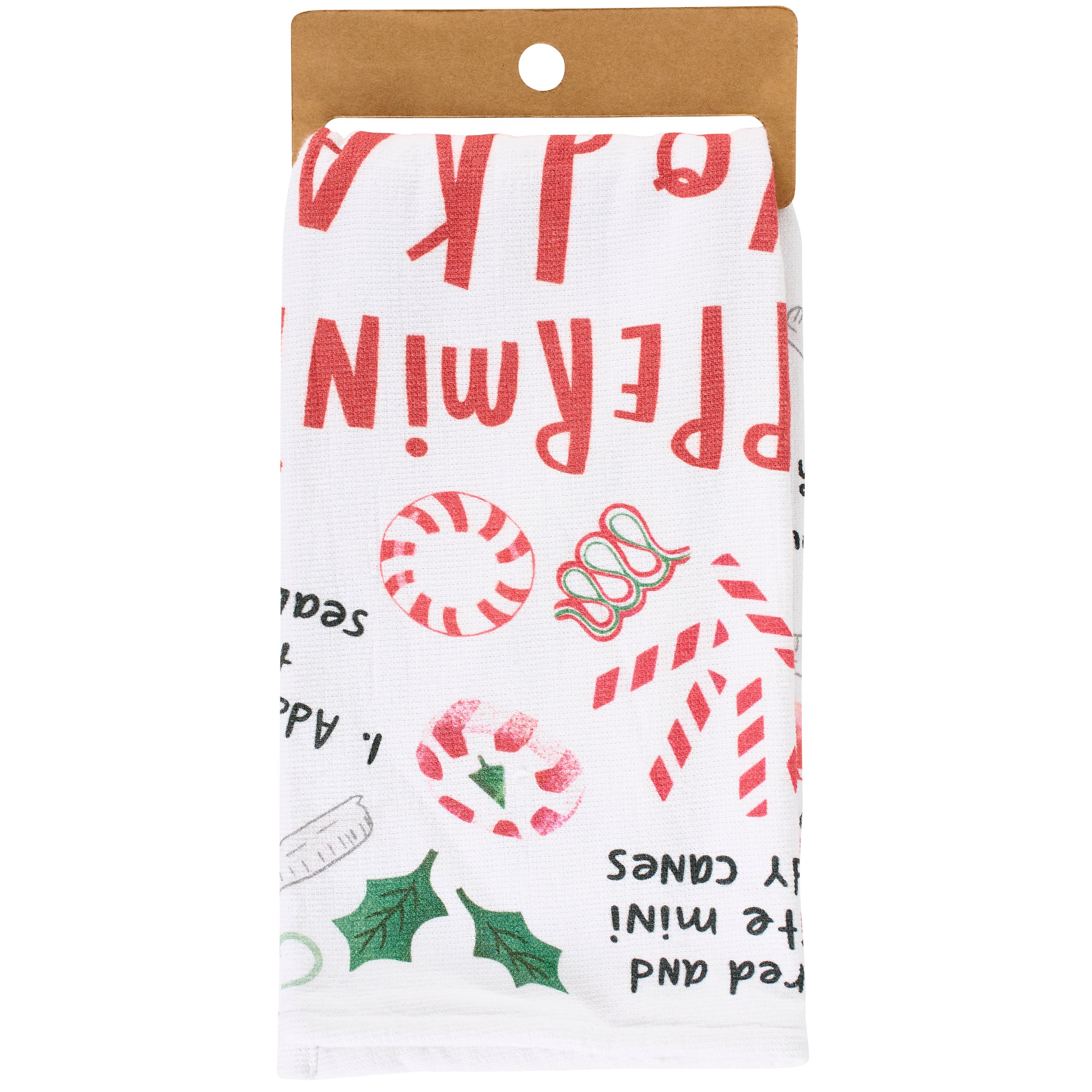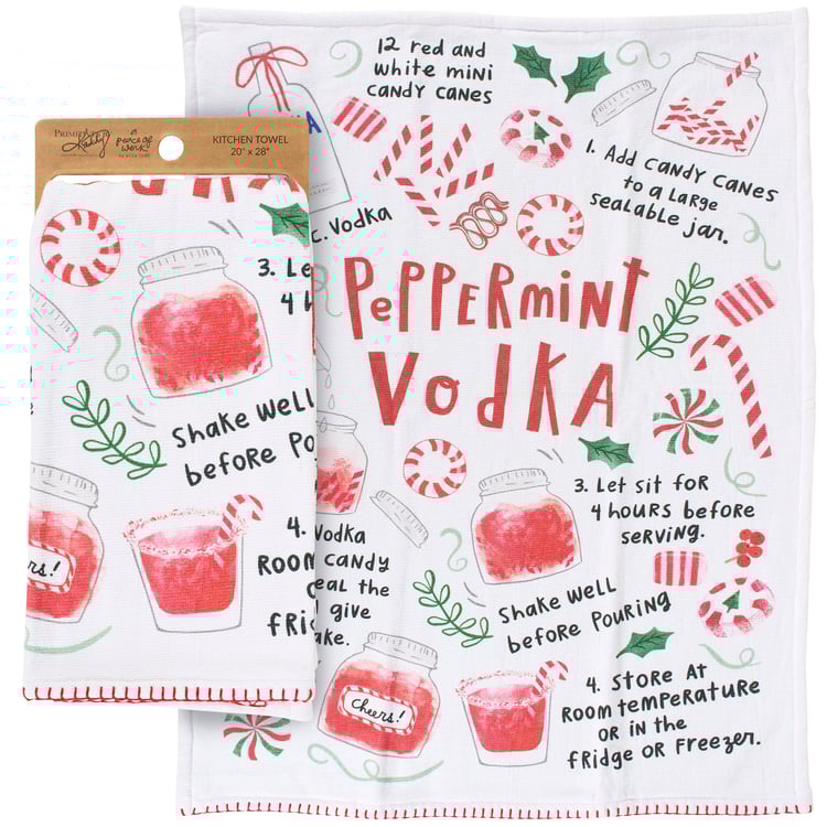 A cotton kitchen towel from our Christmas Collection displaying a fun recipe inspired all-over design replicated from original hand illustrated art. Christmas homestead recipe design features instructions for making homemade peppermint vodka with coordinating illustrations. Peppermint vodka recipe is printed on textured slub fabric with a coordinating red hem stitch at the bottom. Seasonal recipe kitchen towel features a terrycloth layer on the back for added absorbency and corner loop for hanging. Our Peppermint Vodka kitchen towel is conveniently machine-washable for easy cleaning. Seasonal kitchen towel is packaged on a cardboard hanger with hole to easily display on rack. A fun homestead-themed Christmas gift perfect for a seasonal kitchen accessory.