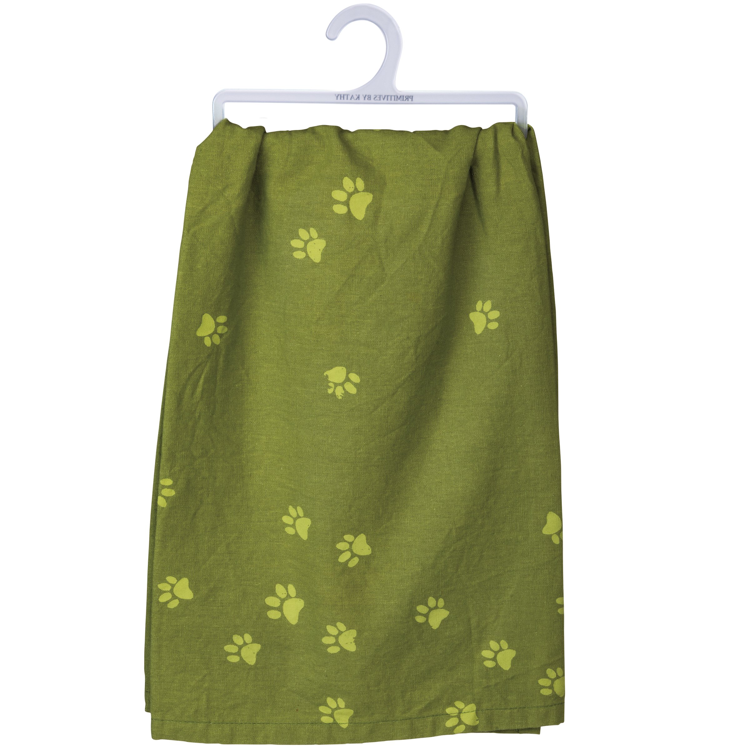 A green cotton kitchen towel displaying a rustic design of a sassy dog and paw print pattern with a fun pet inspired sentiment that reads "Pets Welcome - People Tolerated." Our Pets Welcome kitchen towel is conveniently machine-washable for easy cleaning. Funny kitchen towel is packaged on a clear plastic hanger to easily display on rack. A fun pet-themed kitchen accessory perfect for everyday use.