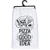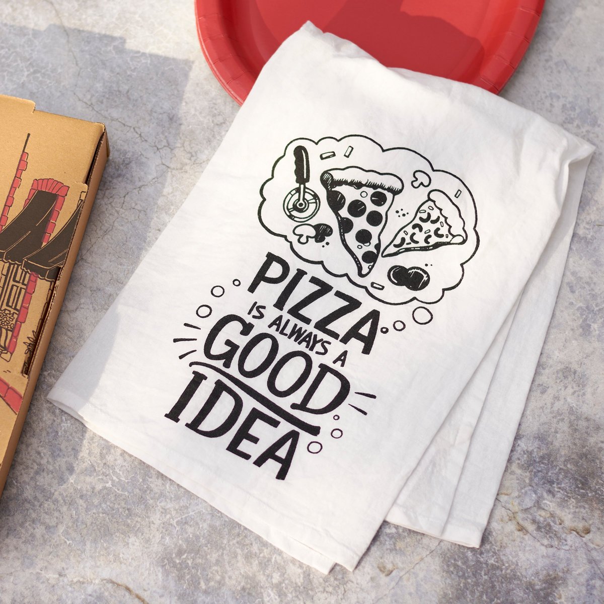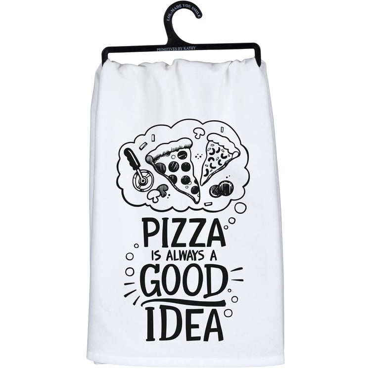 A black and white cotton kitchen towel from our Foodie Collection displaying a unique hand illustrated design of pizza slices and toppings in a thought bubble above a fun food-themed sentiment that reads "Pizza Is Always A Good Idea." Our Pizza A Good Idea kitchen towel is machine-washable for convenient cleaning. Packaged on a black plastic hanger to easily display on rack. A fun food-themed kitchen accent perfect for everyday use.