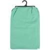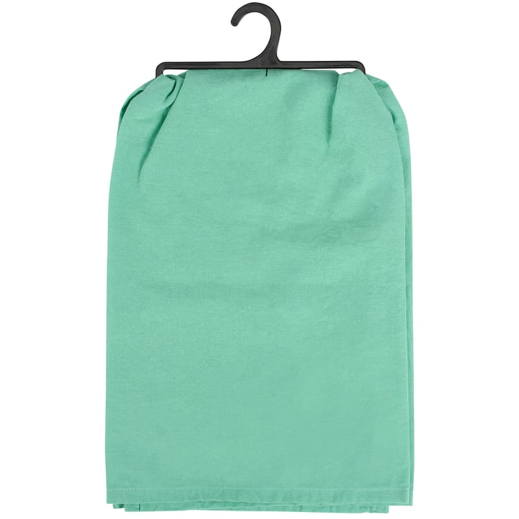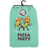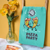 A green cotton kitchen towel from our LOL-Made You Smile Collection displaying a hand illustrated design of pizza slice characters dancing under a disco ball in a fun retro style with a food-themed sentiment that reads "Pizza Party." Our Pizza Party kitchen towel is conveniently machine-washable for easy cleaning. Retro kitchen towel is packaged on a black plastic hanger to easily display on rack. A fun food-themed gift perfect for a retro kitchen accessory.