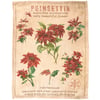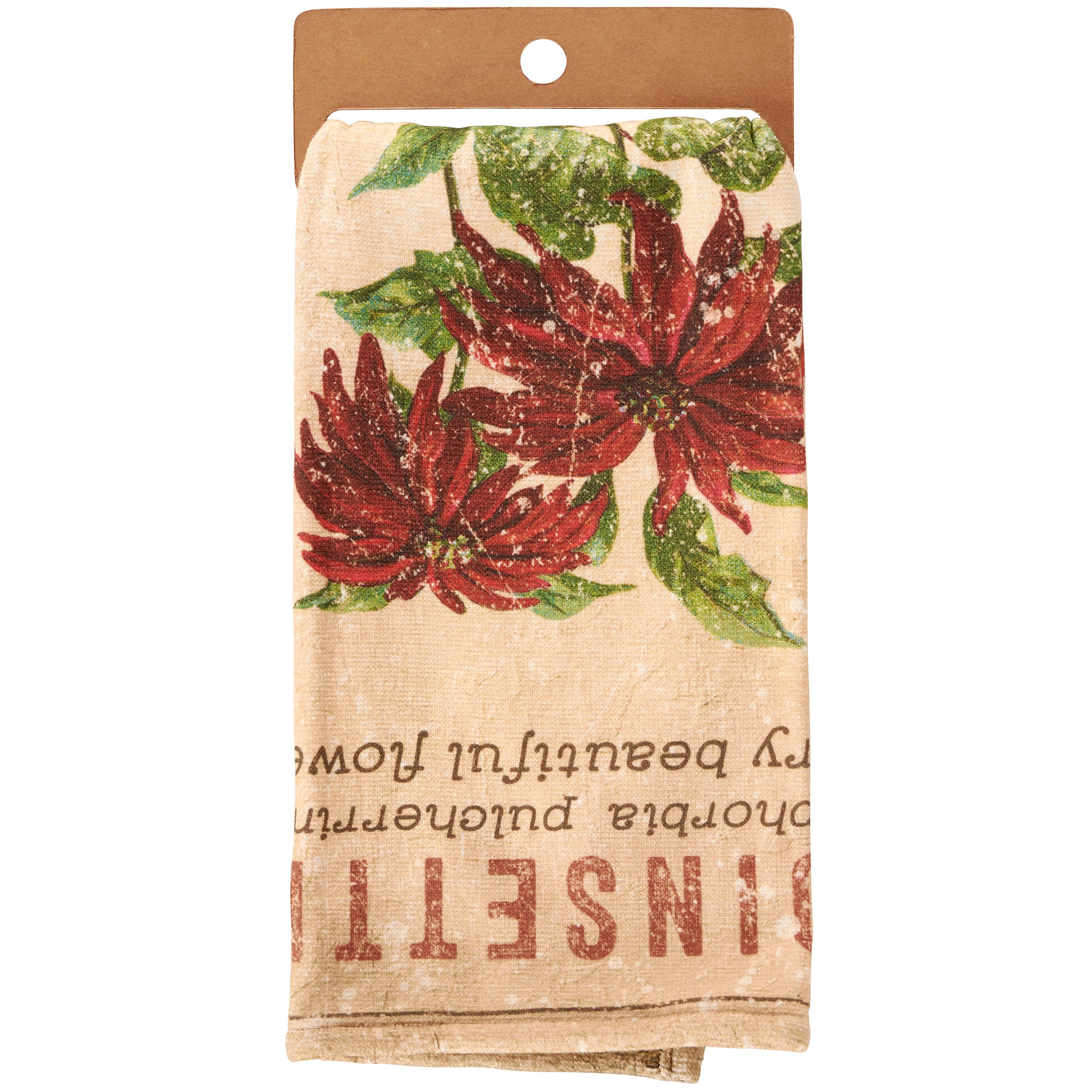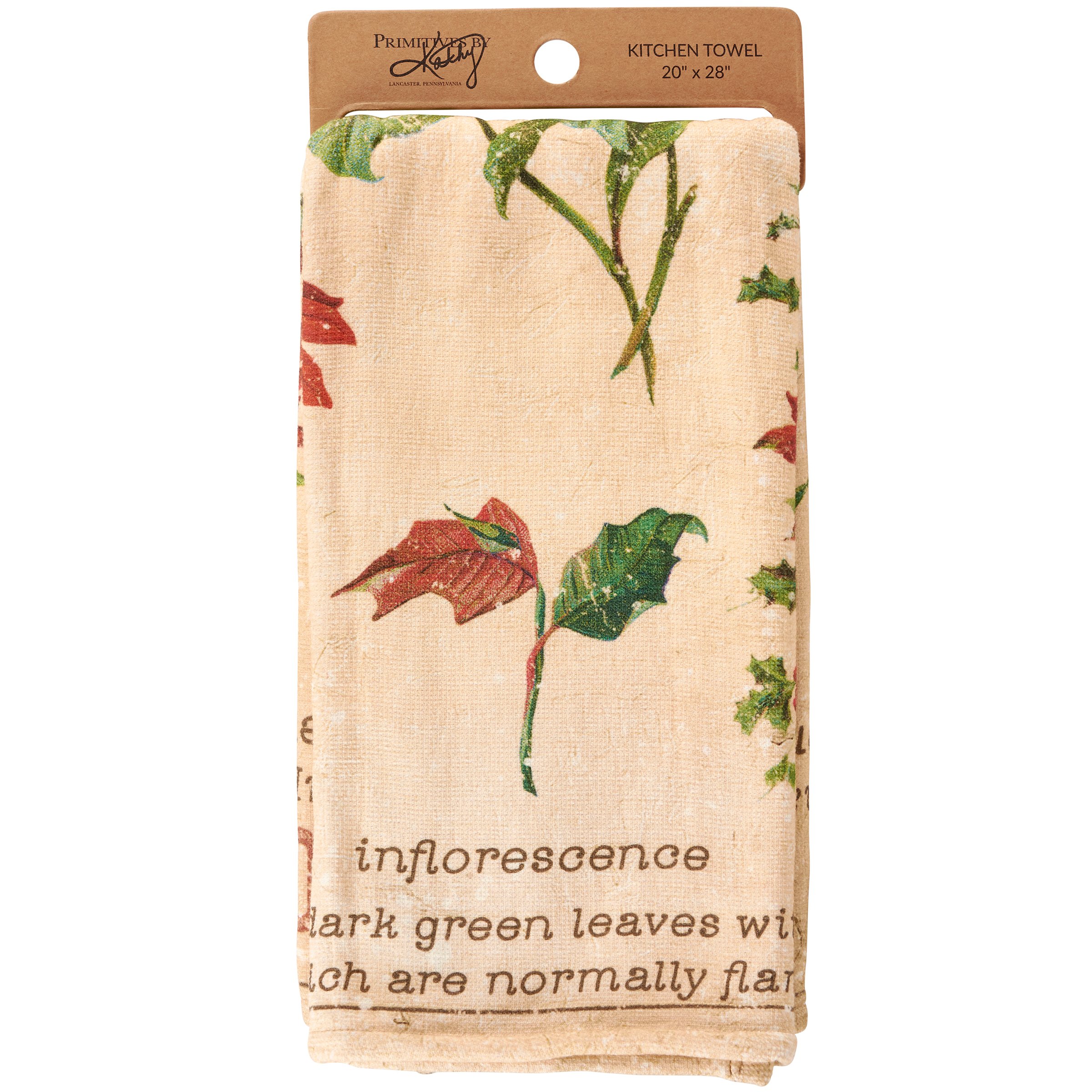 A cotton kitchen towel from our Christmas Collection displaying an all-over design of vintage plant study inspired art of poinsettia with distressed details for an aged appearance. Vintage Christmas kitchen towel features a terrycloth layer on the back for added absorbency and a cotton tape loop for hanging. Our Poinsettia kitchen towel is conveniently machine-washable for easy cleaning. Seasonal kitchen towel is packaged on a cardboard hanger with hole to easily display on rack. A vintage Christmas kitchen accessory perfect for seasonal use.