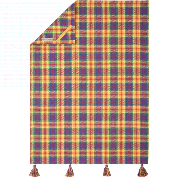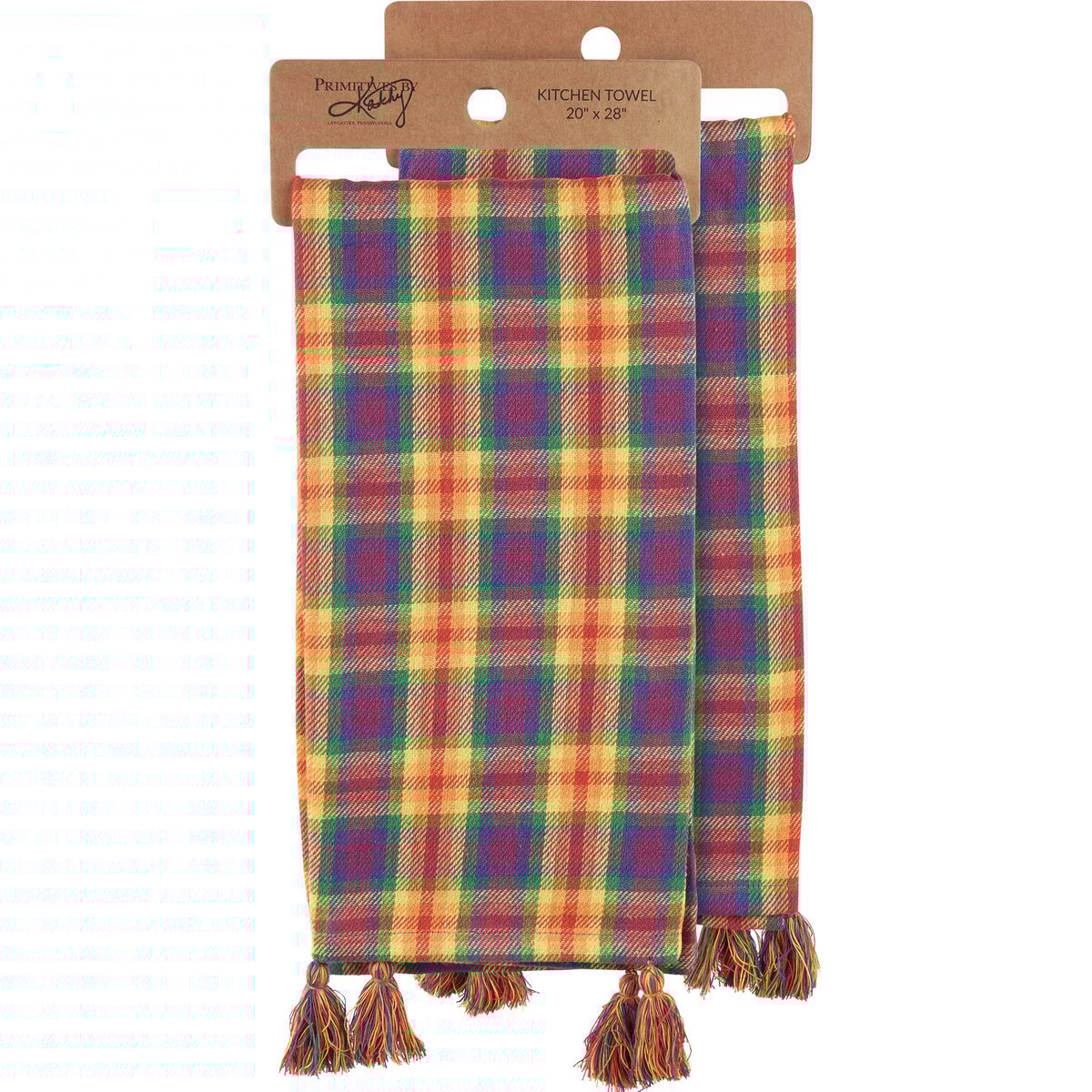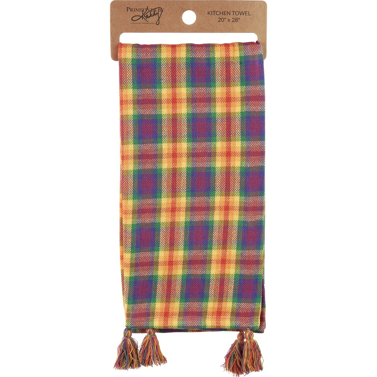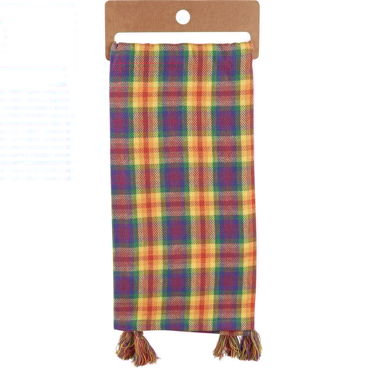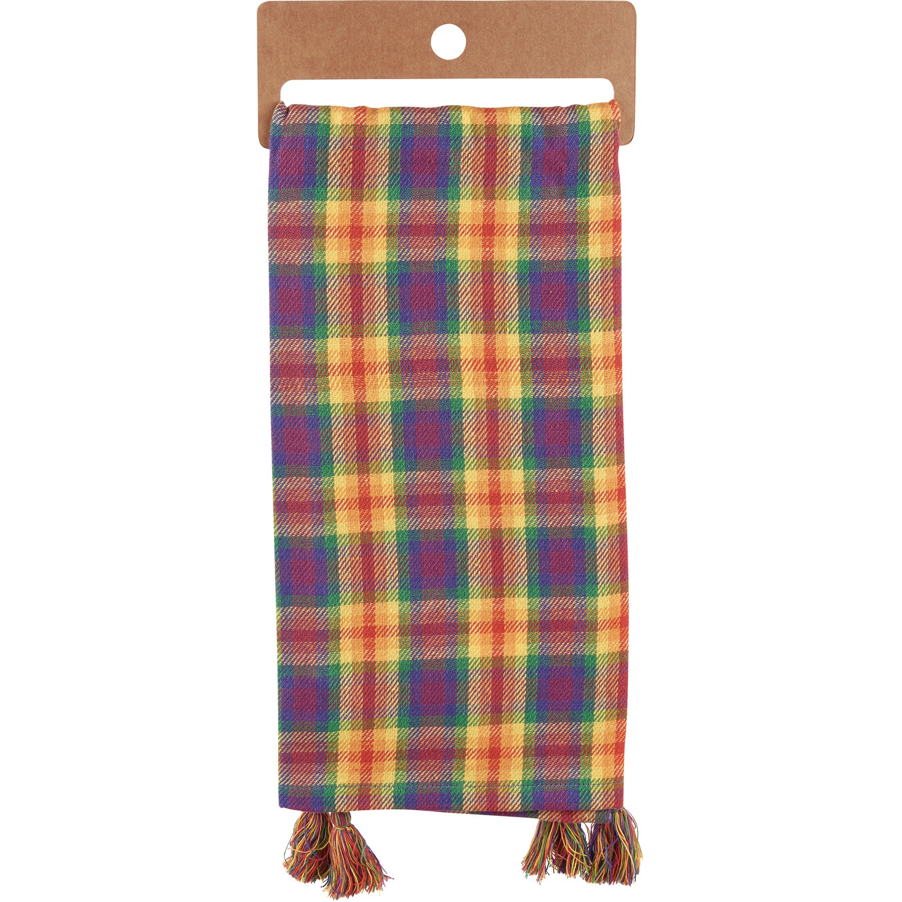 A cotton kitchen towel from our Pride Collection displaying an all-over rainbow plaid pattern with rainbow tassels along edge. Our Pride Plaid kitchen towel is machine-washable for convenient cleaning. Packaged on a cardboard hanger with hole to easily hang on rack. A portion of the proceeds from the sale of this Benefit Item will be donated to Lancaster LGBTQ+ Coalition to support their commitment to building a more inclusive Lancaster County abundant in opportunities for LGBTQQIA+ individuals.