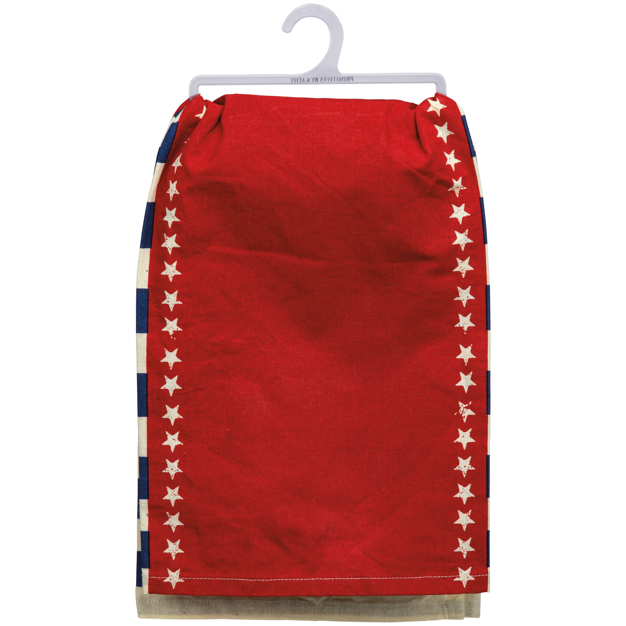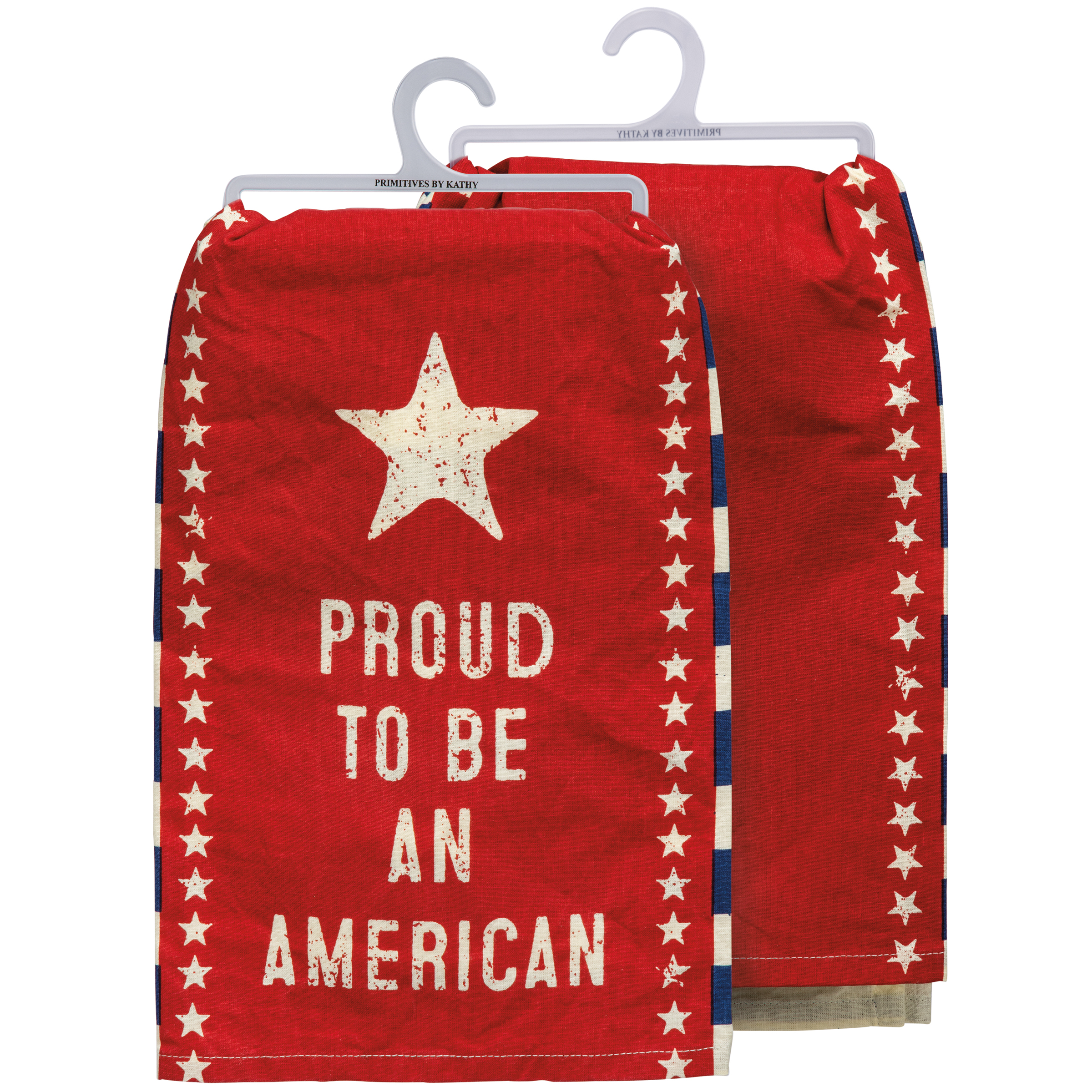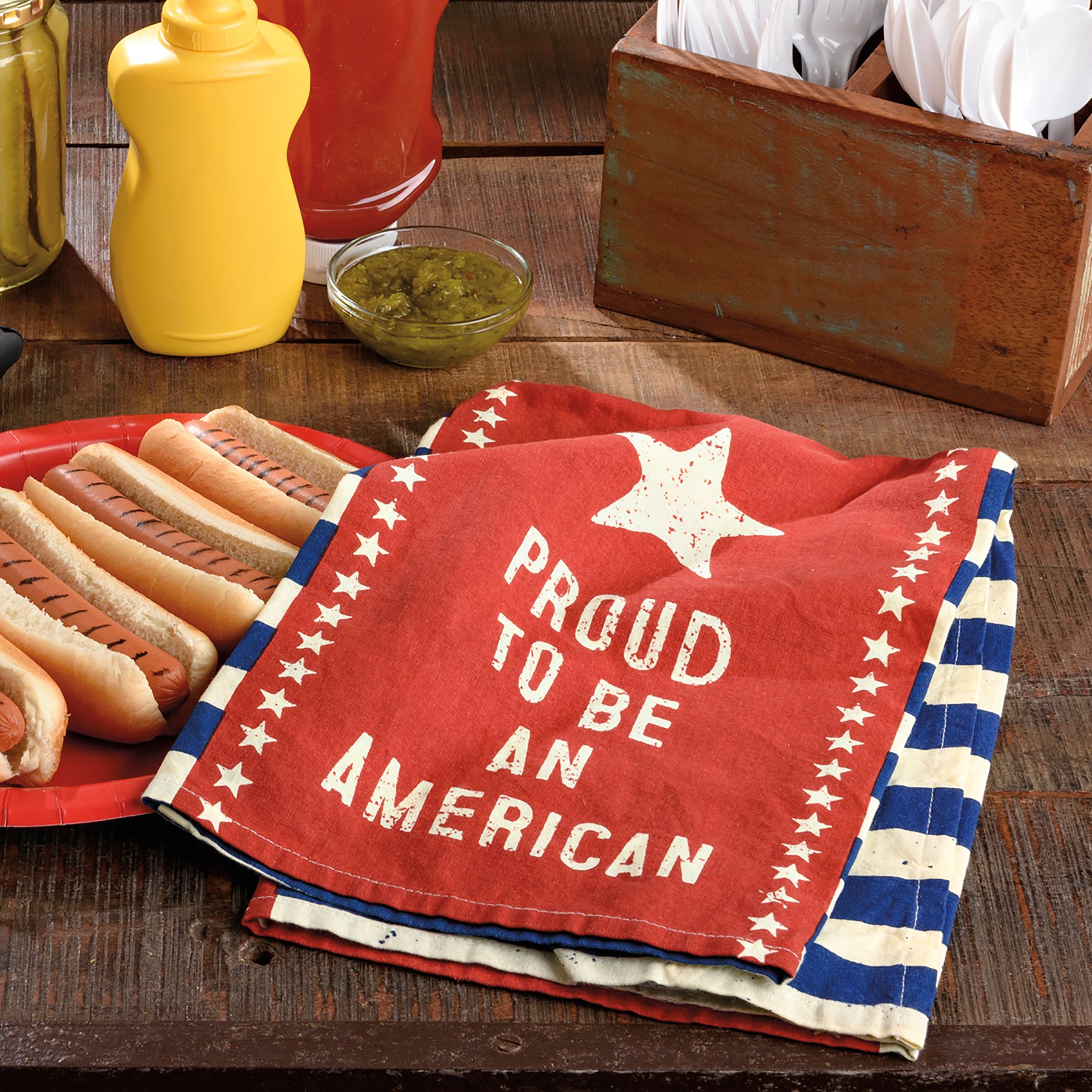 A cotton kitchen towel featuring stars and stripes design and a patriotic palette with a "Proud To Be An American" sentiment. Machine-washable.