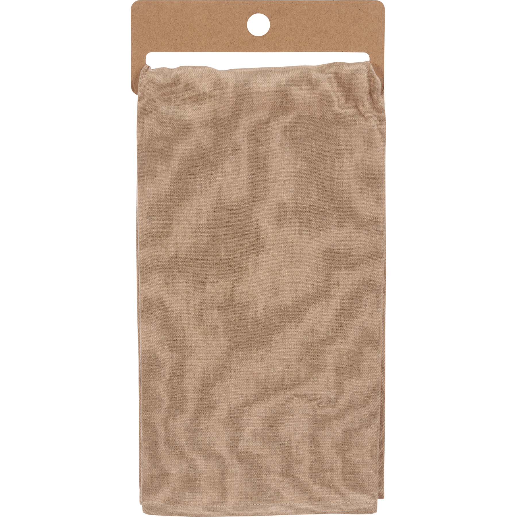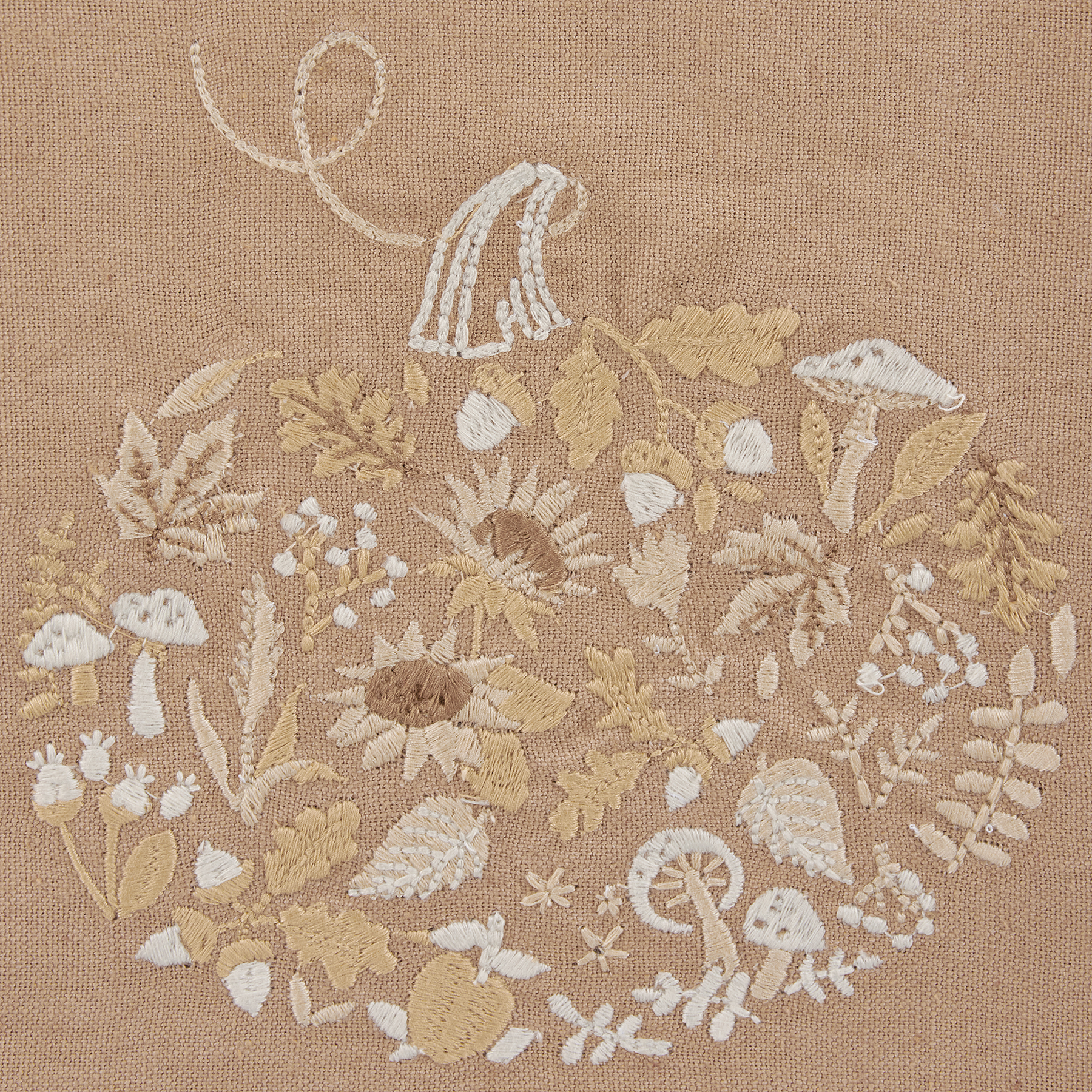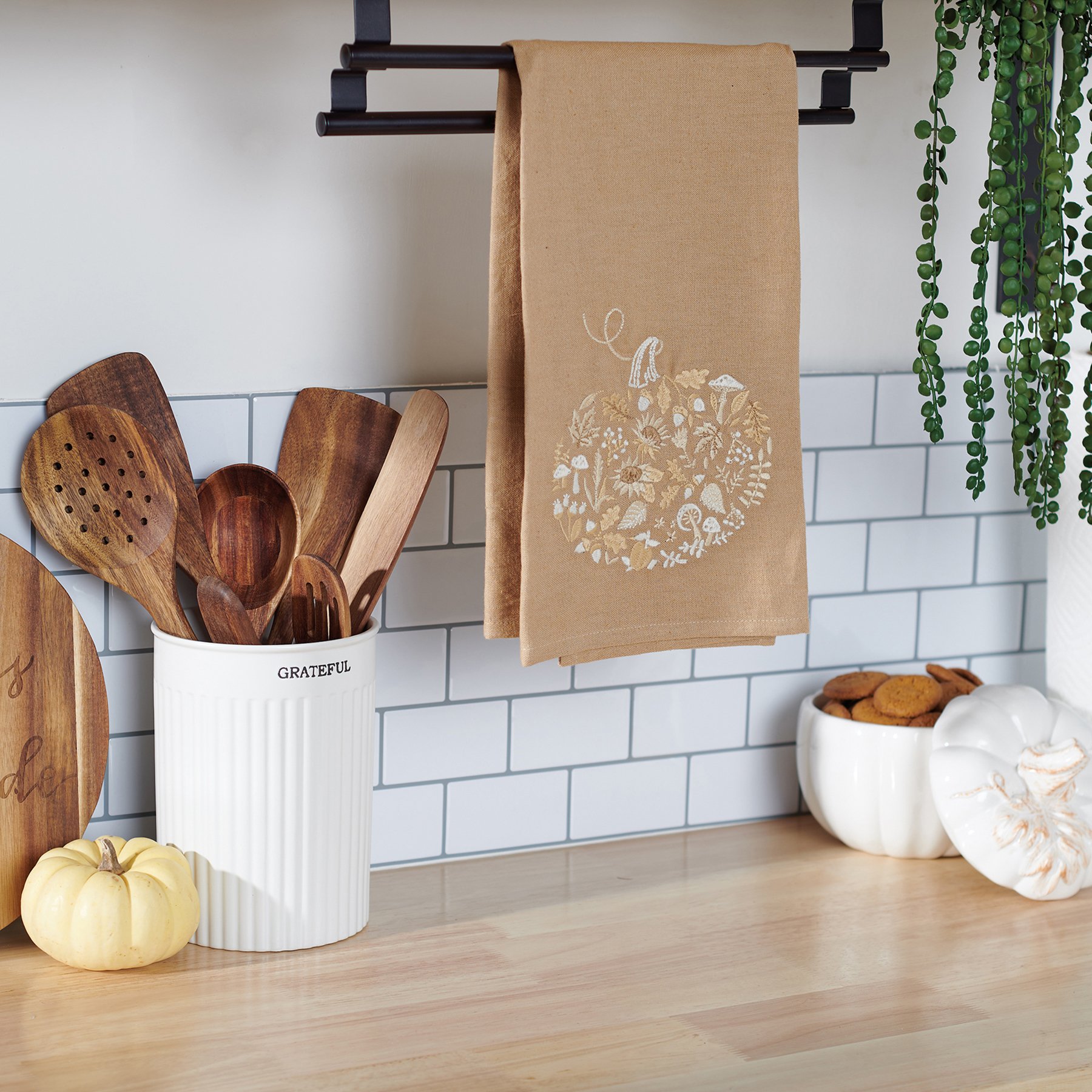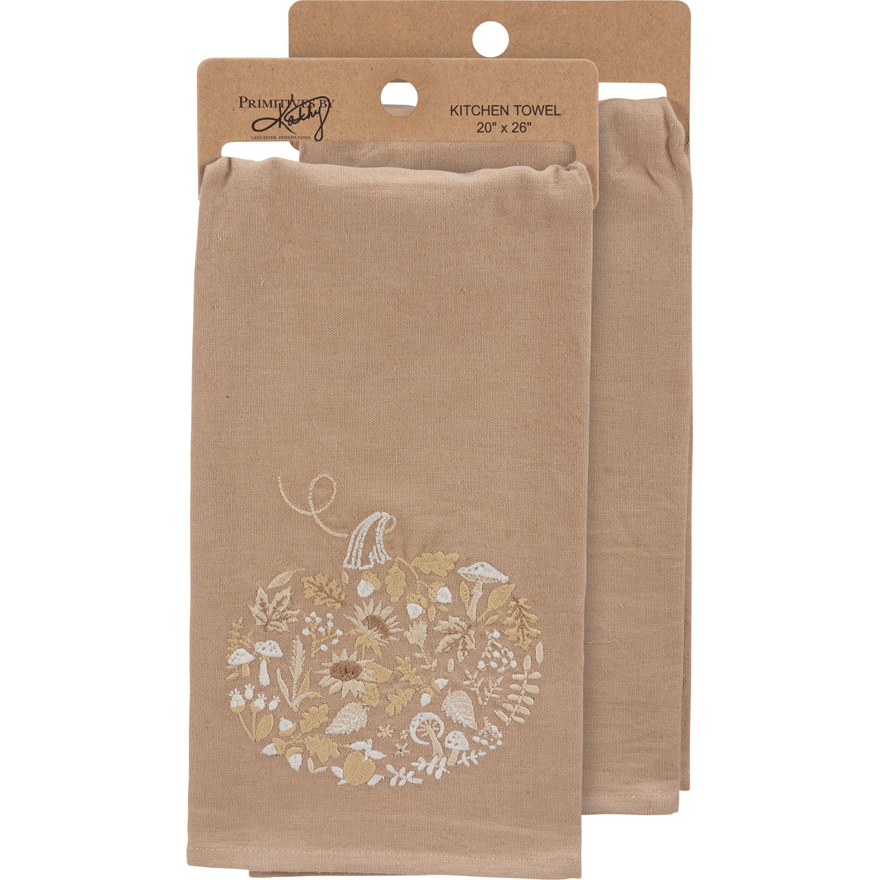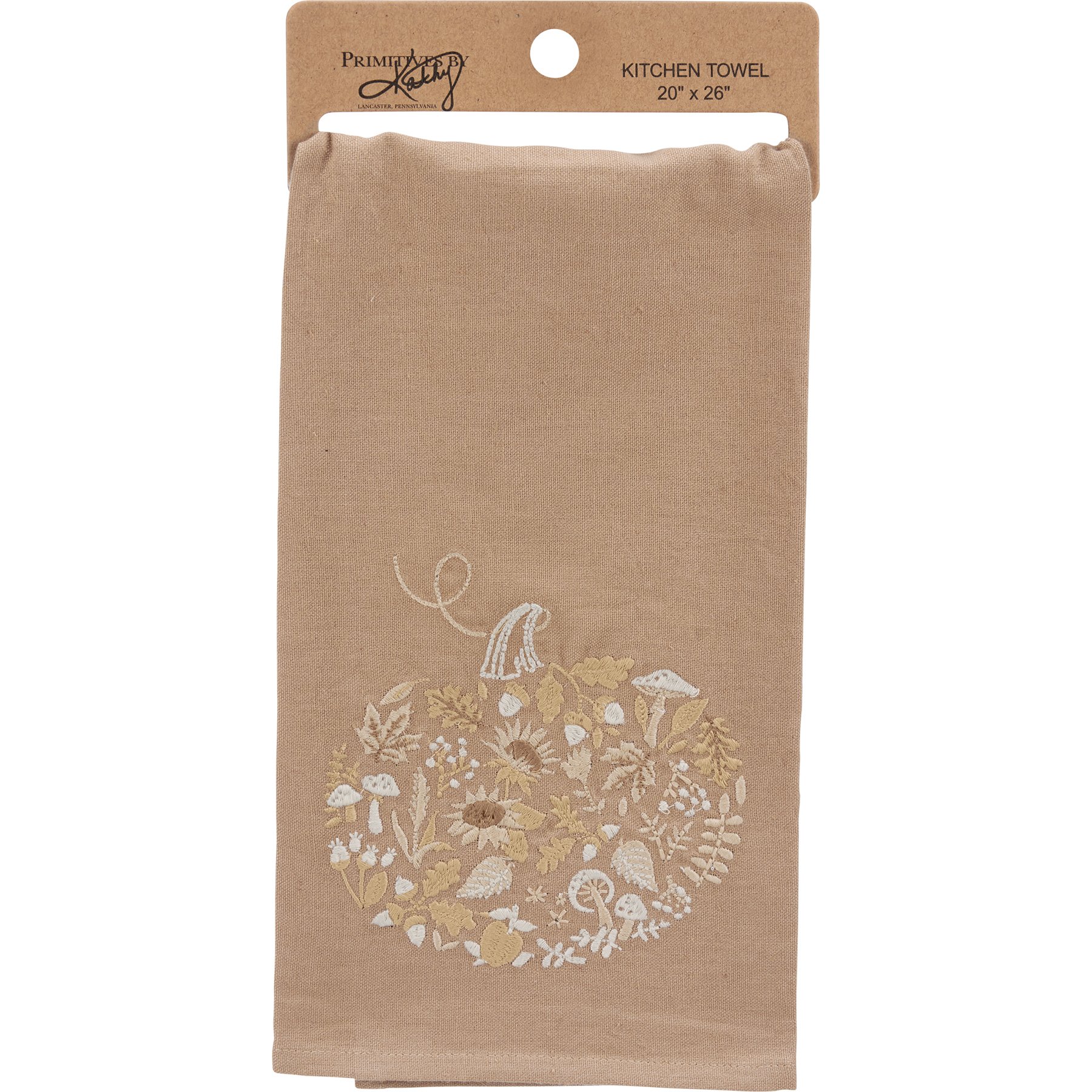 A brown cotton-linen blend kitchen towel from our Fall & Harvest Collection displaying a pumpkin made from smaller fall foliage designs. Designs are embroidered for added detail. Our Pumpkin kitchen towel is machine-washable for convenient cleaning. Packaged on a cardboard hanger with hole to easily display on rack. A charming and functional seasonal kitchen accent.
