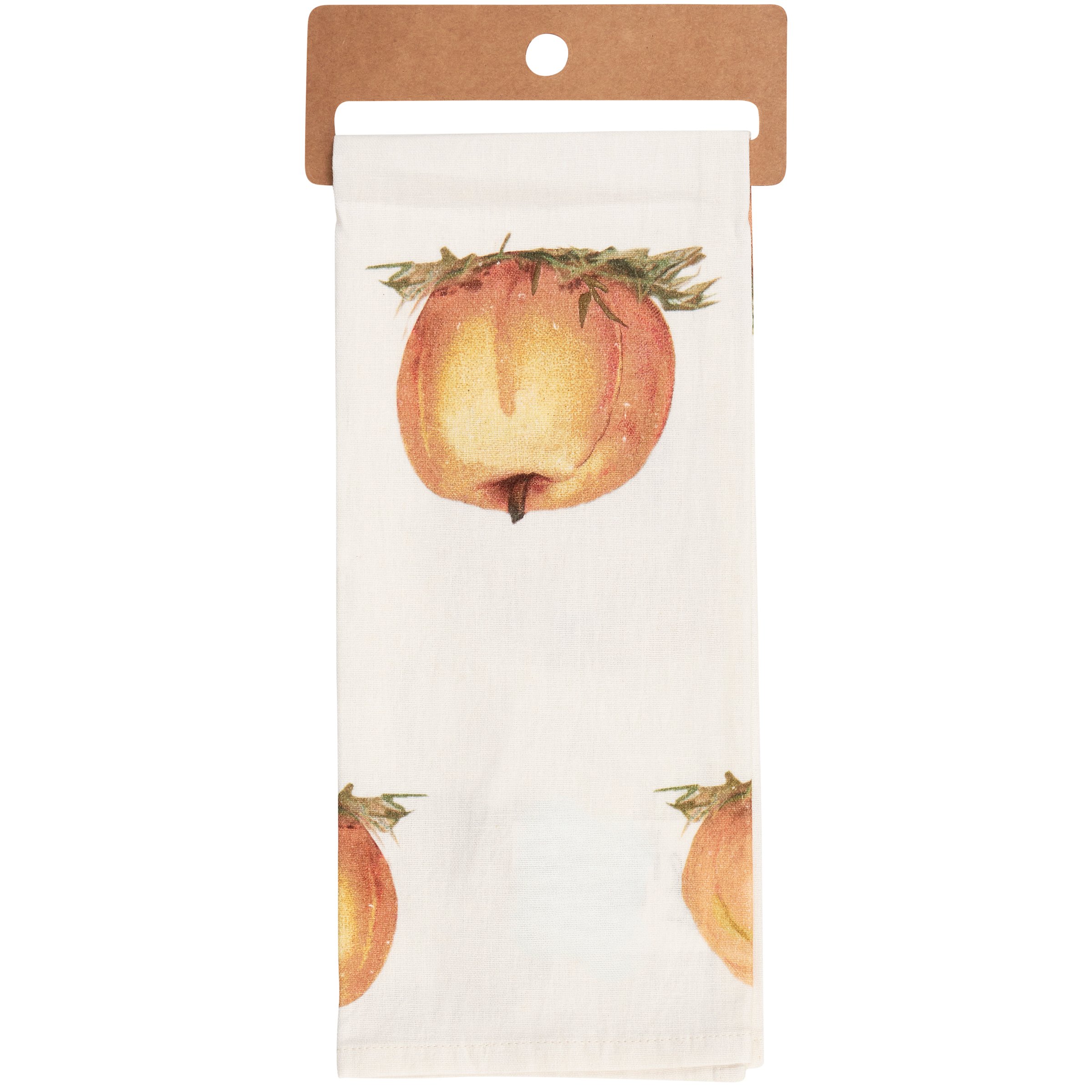 A cotton-linen kitchen towel from our Fall & Harvest Collection displaying all-over vintage designs of pumpkins with a coordinating fall inspired sentiment that reads "Pumpkin Spice & Everything Nice." Sentiment is embroidered for added interest. Our Pumpkin Spice & Everything Nice kitchen towel is conveniently machine-washable for easy cleaning. Seasonal kitchen towel is packaged on a cardboard hanger with hole to easily display on rack. A fun fall-themed kitchen accessory perfect for seasonal use.