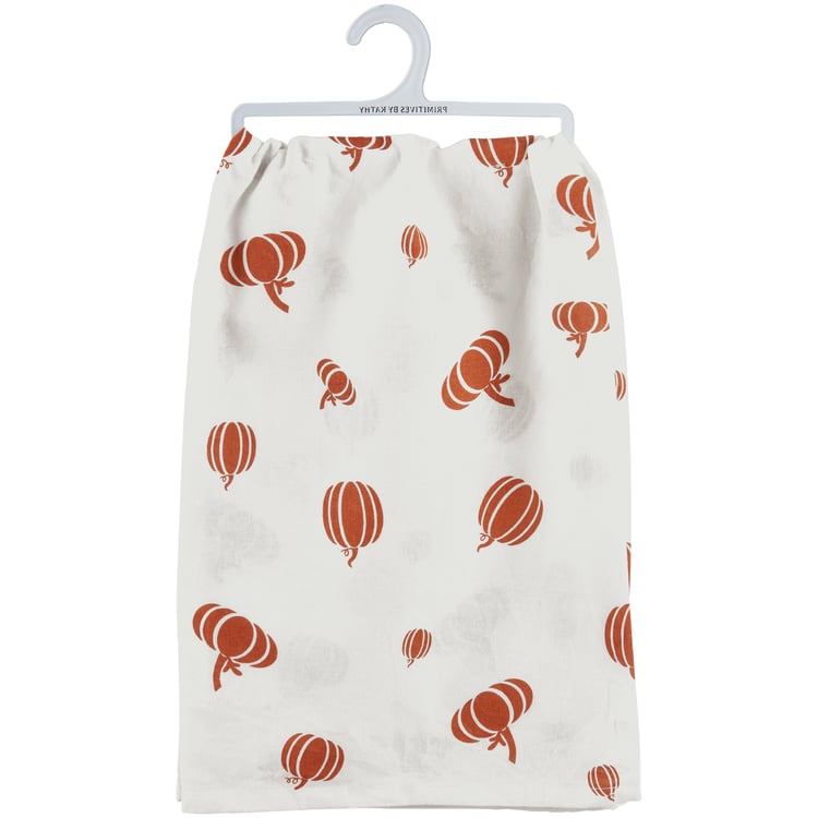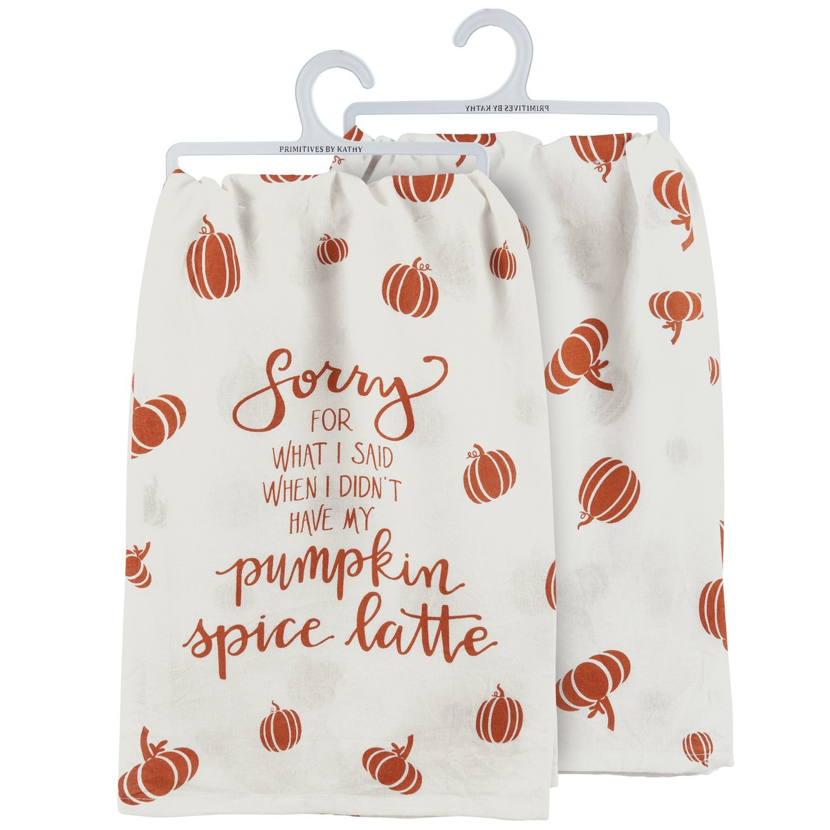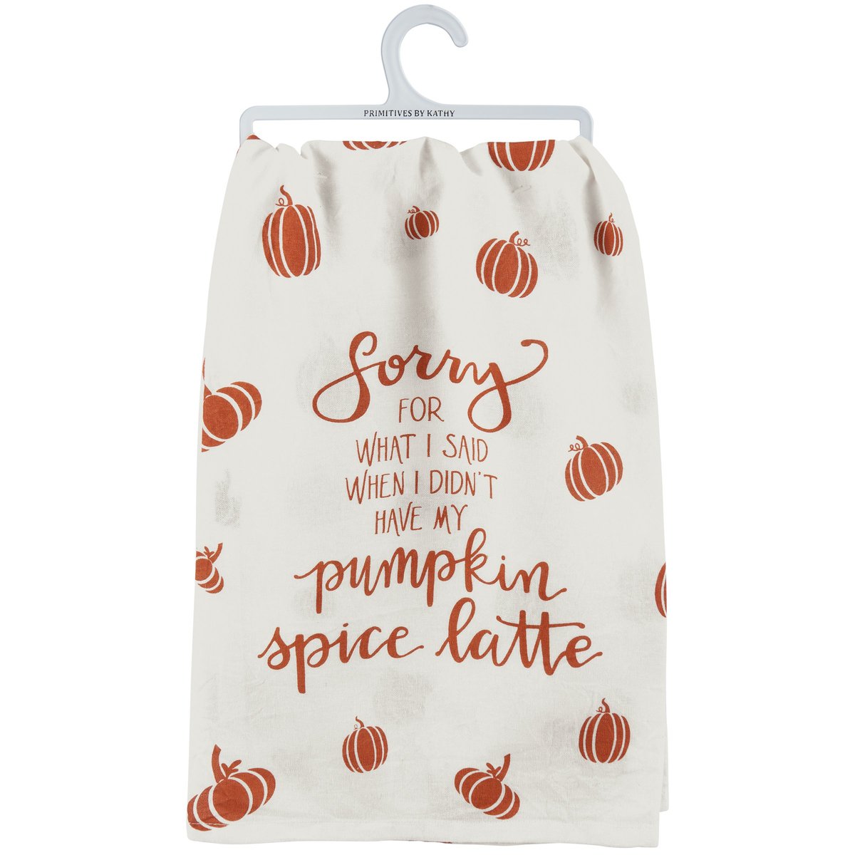 A cream cotton kitchen towel from our Fall & Harvest Collection displaying an all-over design of pumpkins with hand illustrated sentiment that reads "Sorry For What I Said When I Didn't Have My Pumpkin Spice Latte." Our Pumpkin Spice Latte kitchen towel is machine-washable for convenient cleaning. Packaged on a clear plastic hanger to easily display on rack. A fun and functional seasonal kitchen accent.