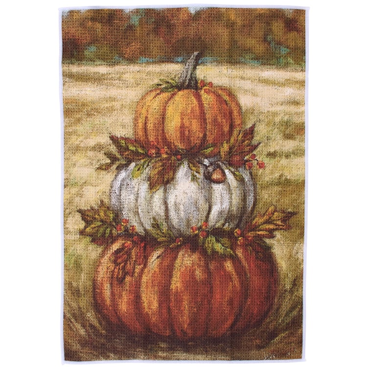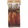 A microfiber kitchen towel from our Fall & Harvest Collection displaying an all-over design of an autumn scene of pumpkins stacked with fall foliage in between. Fall pumpkins design is replicated from original artwork painted onto burlap canvas, giving the art a unique depth and texture. Our Pumpkin Stack kitchen towel is conveniently machine-washable for easy cleaning. Seasonal kitchen towel is packaged on a cardboard hanger with hole to easily display on rack. A rustic fall kitchen accessory perfect for seasonal use.