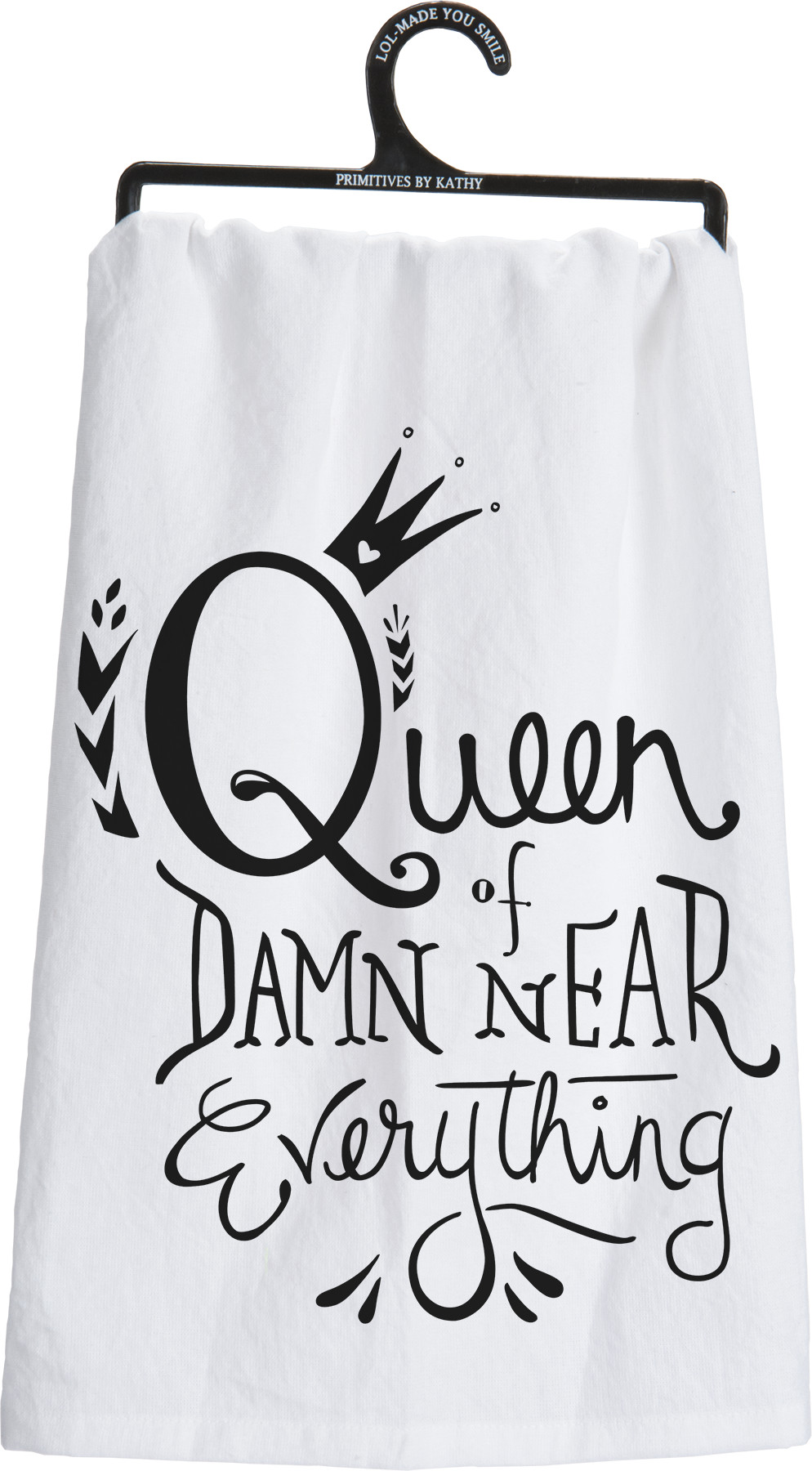 A black and white cotton kitchen towel lending a hand lettered "Queen Of Damn Near Everything" sentiment with crown design that complements well with existing kitchen decor. Machine-washable.