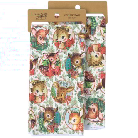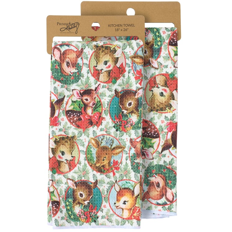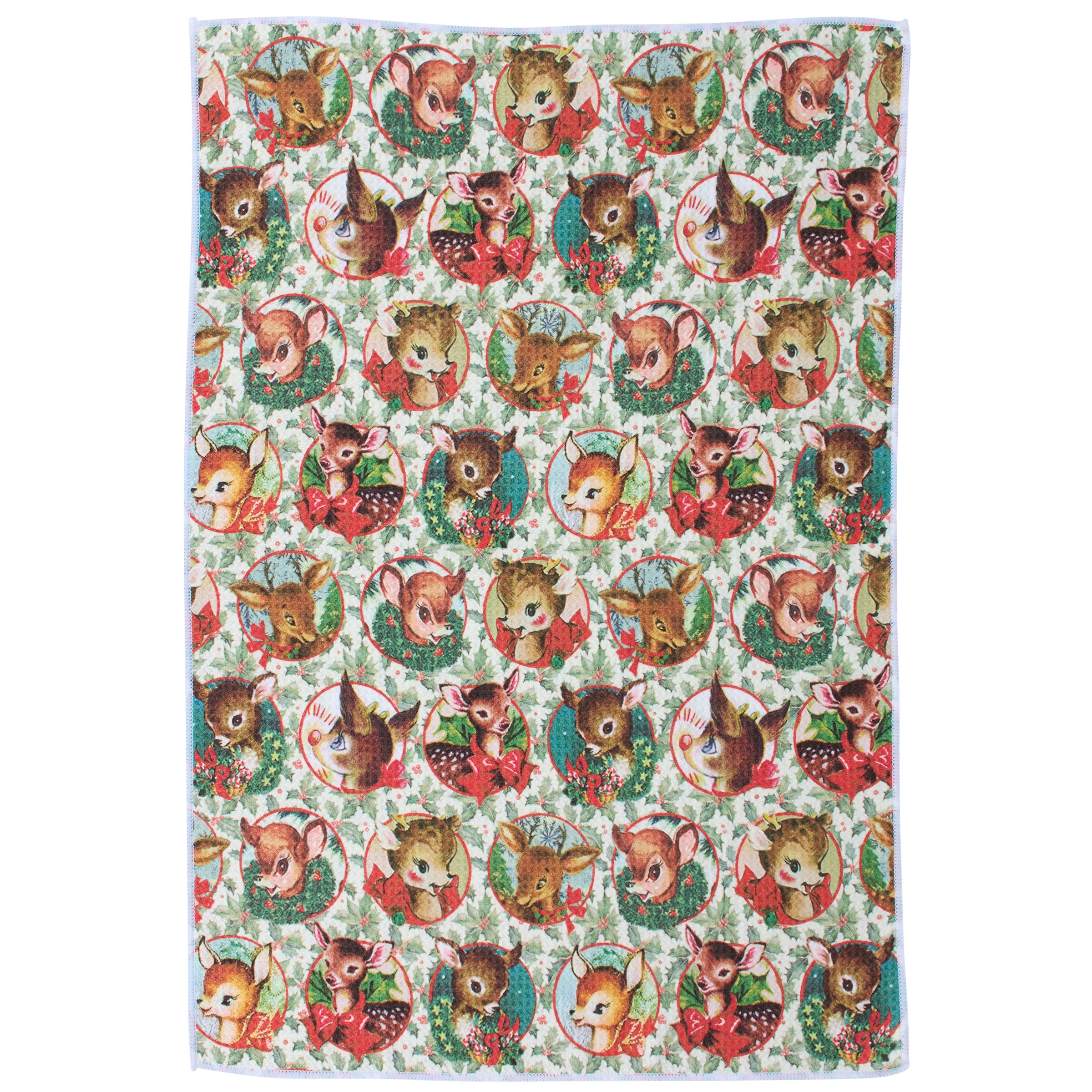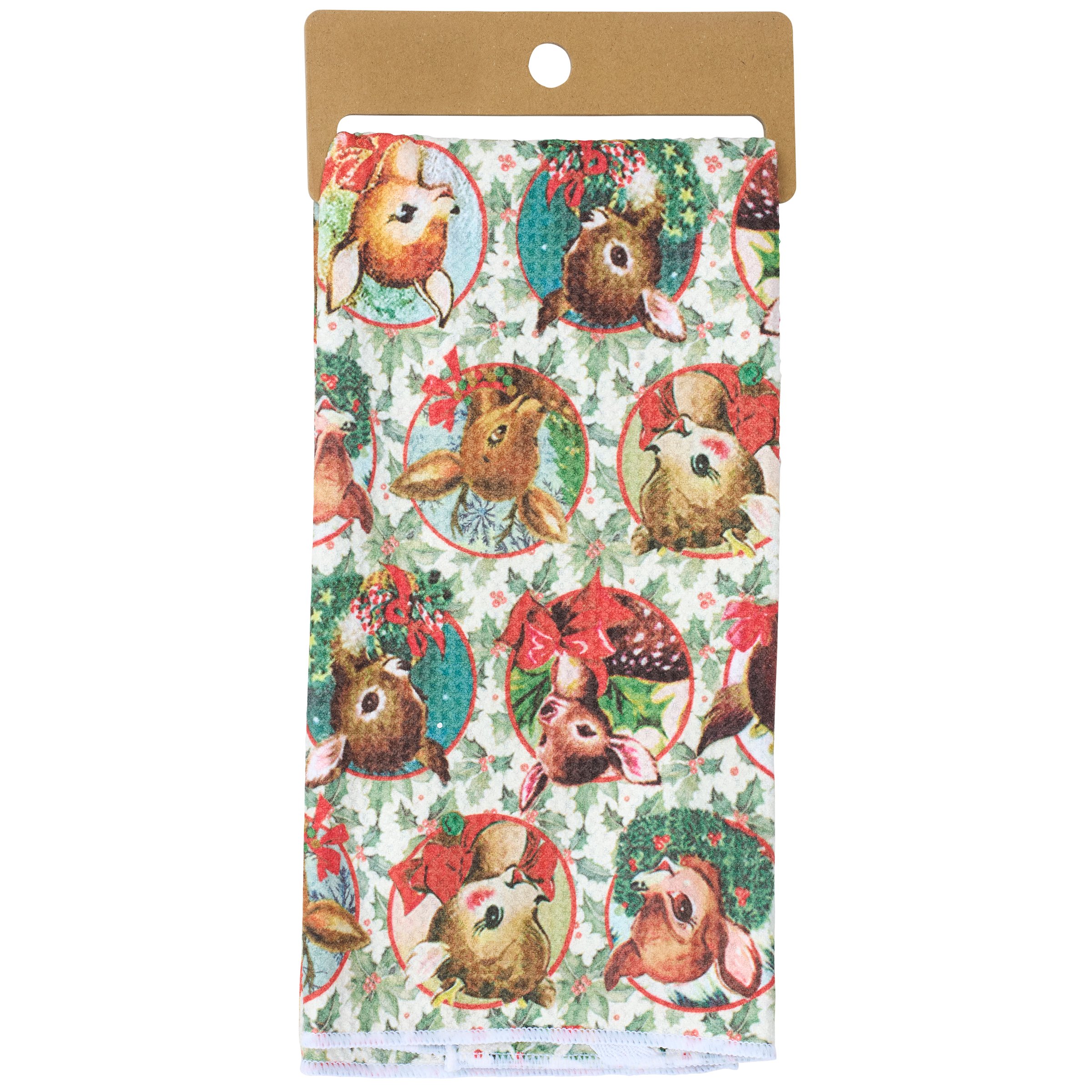 A microfiber kitchen towel from our Christmas Collection featuring an all-over design displaying a pattern of retro reindeer art on the front and holly on the back with a cotton tape hanger in the corner. Our Retro Deer kitchen towel is conveniently machine washable for easy cleaning. Seasonal kitchen towel is packaged on a cardboard hanger with hole to easily display on rack. A retro Christmas kitchen accessory perfect for adding seasonal style to any kitchen.