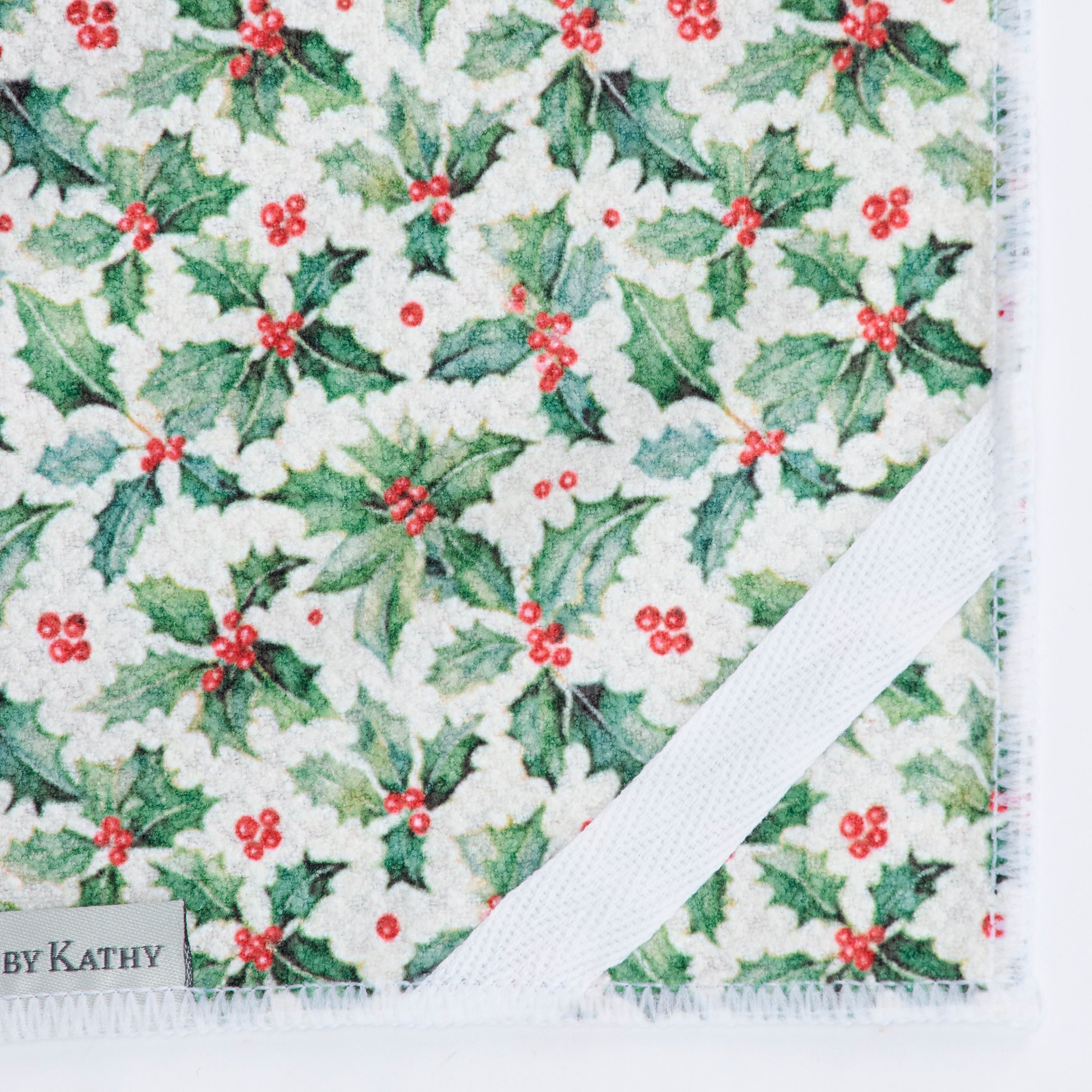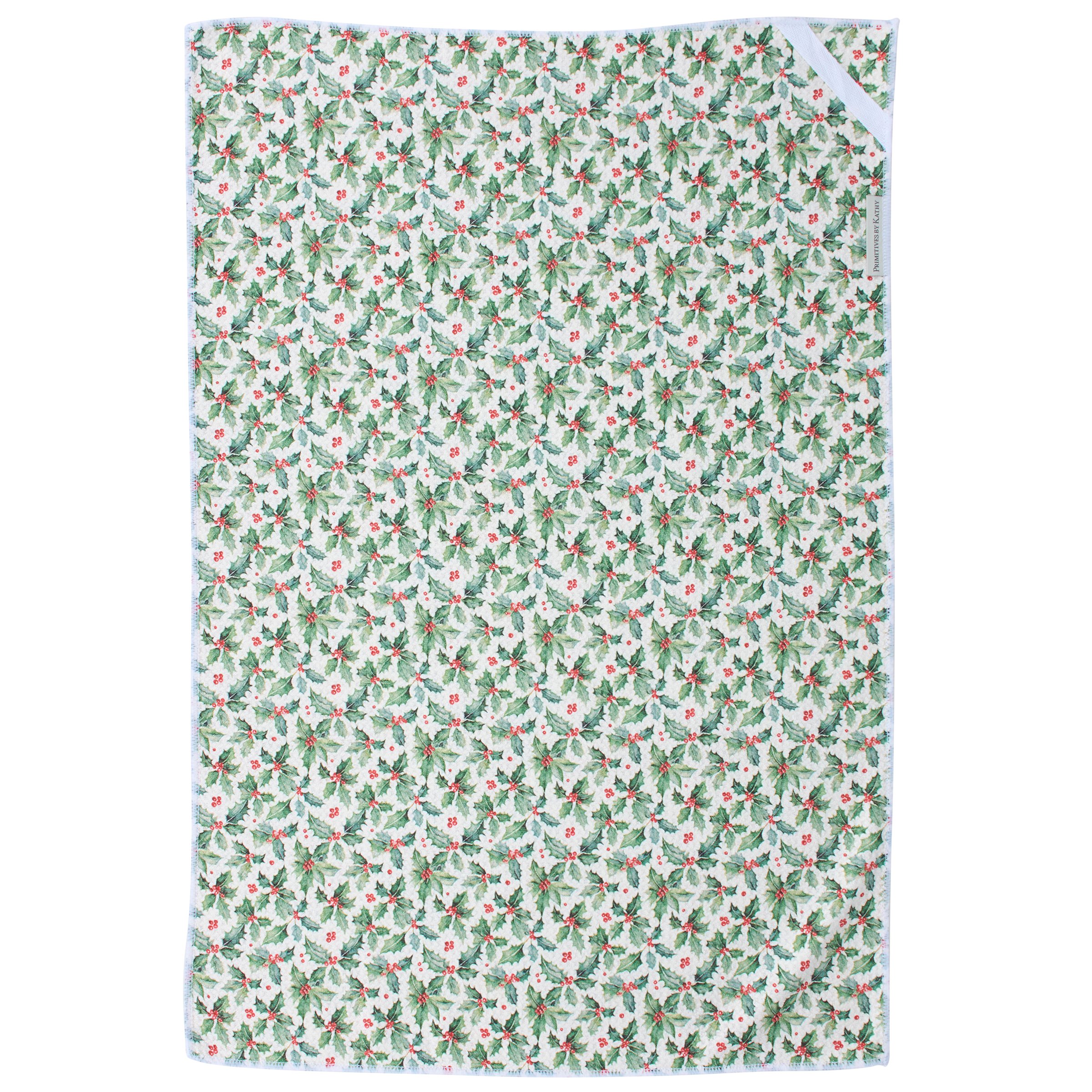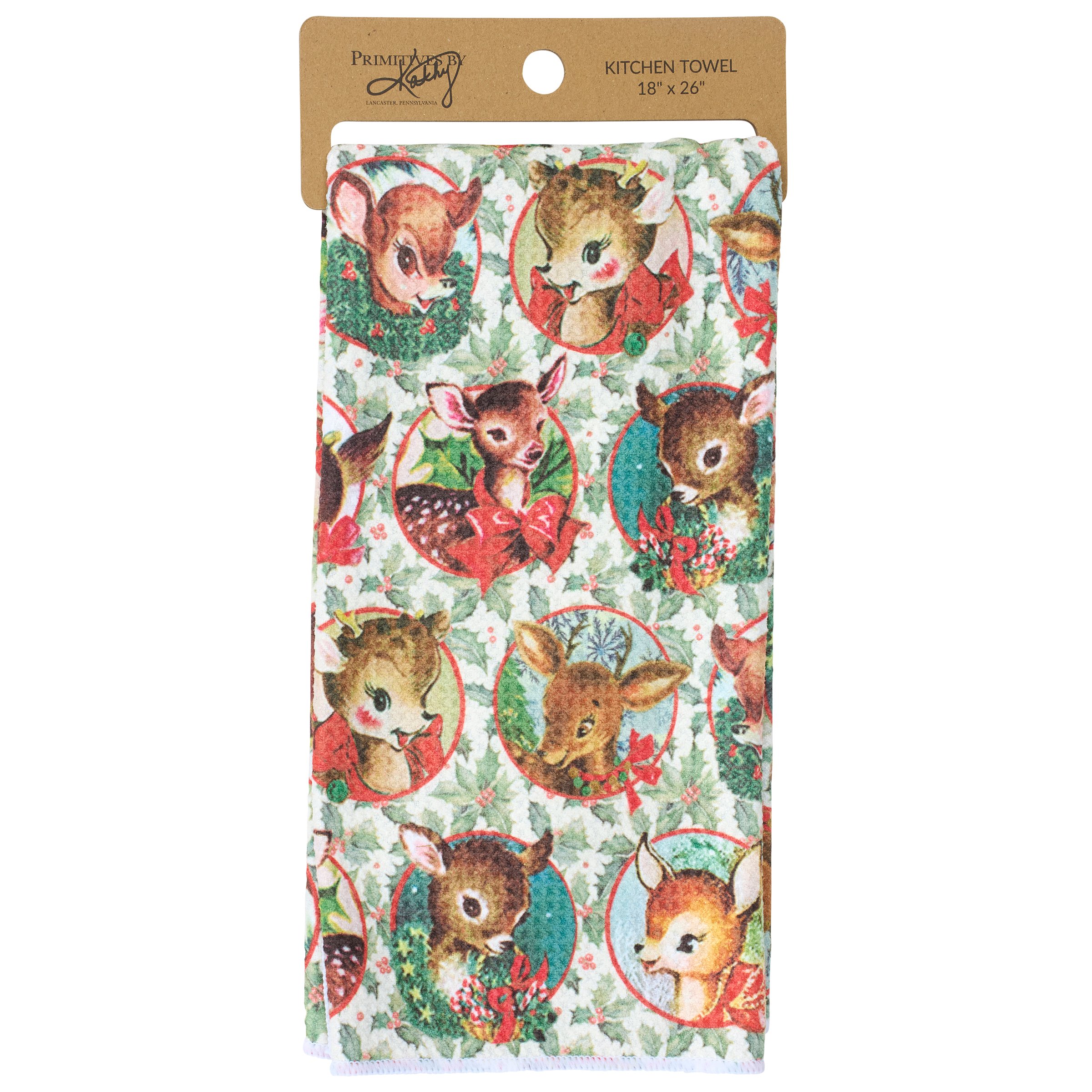 A microfiber kitchen towel from our Christmas Collection featuring an all-over design displaying a pattern of retro reindeer art on the front and holly on the back with a cotton tape hanger in the corner. Our Retro Deer kitchen towel is conveniently machine washable for easy cleaning. Seasonal kitchen towel is packaged on a cardboard hanger with hole to easily display on rack. A retro Christmas kitchen accessory perfect for adding seasonal style to any kitchen.