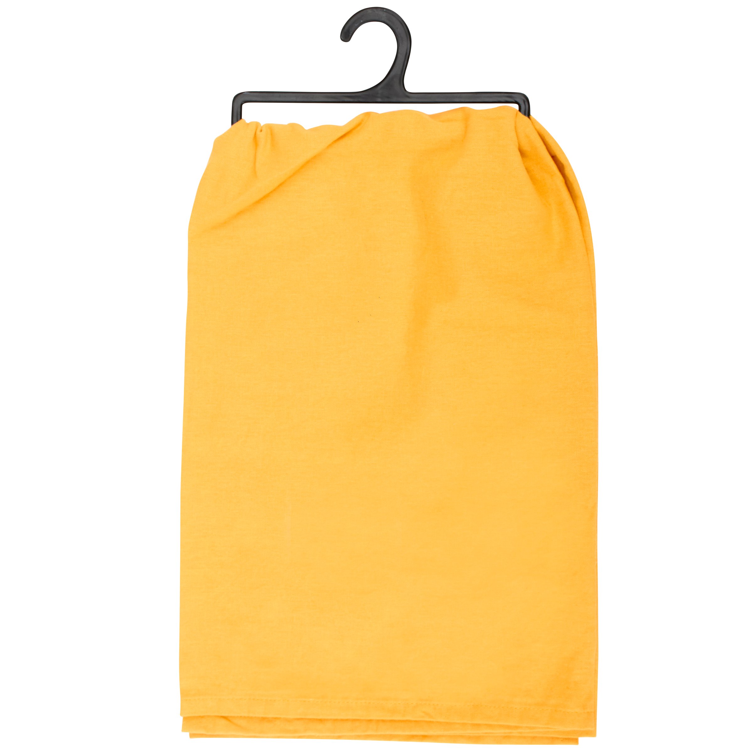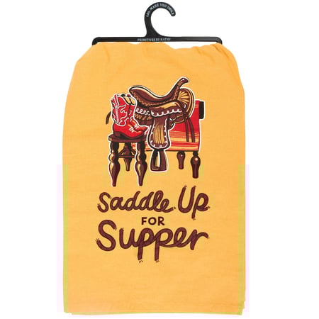 A yellow cotton kitchen towel from our Western Collection displaying a playful hand illustrated design of a saddle and boots with a fun western inspired sentiment that reads "Saddle Up For Supper." Our Saddle Up For Supper kitchen towel is conveniently machine-washable for easy cleaning. This western kitchen towel is packaged on a black plastic hanger to easily display on rack. A fun western themed gift perfect for adding personality to any kitchen.