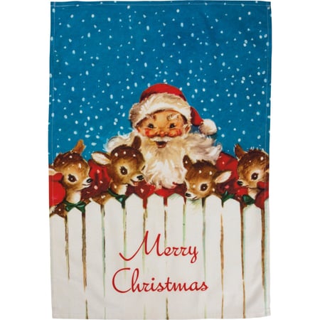 A full-color cotton kitchen towel featuring vintage-inspired Santa and reindeer designs with "Merry Christmas" sentiment. Comes neatly rolled and wrapped with tag featuring the full design. Machine-washable.