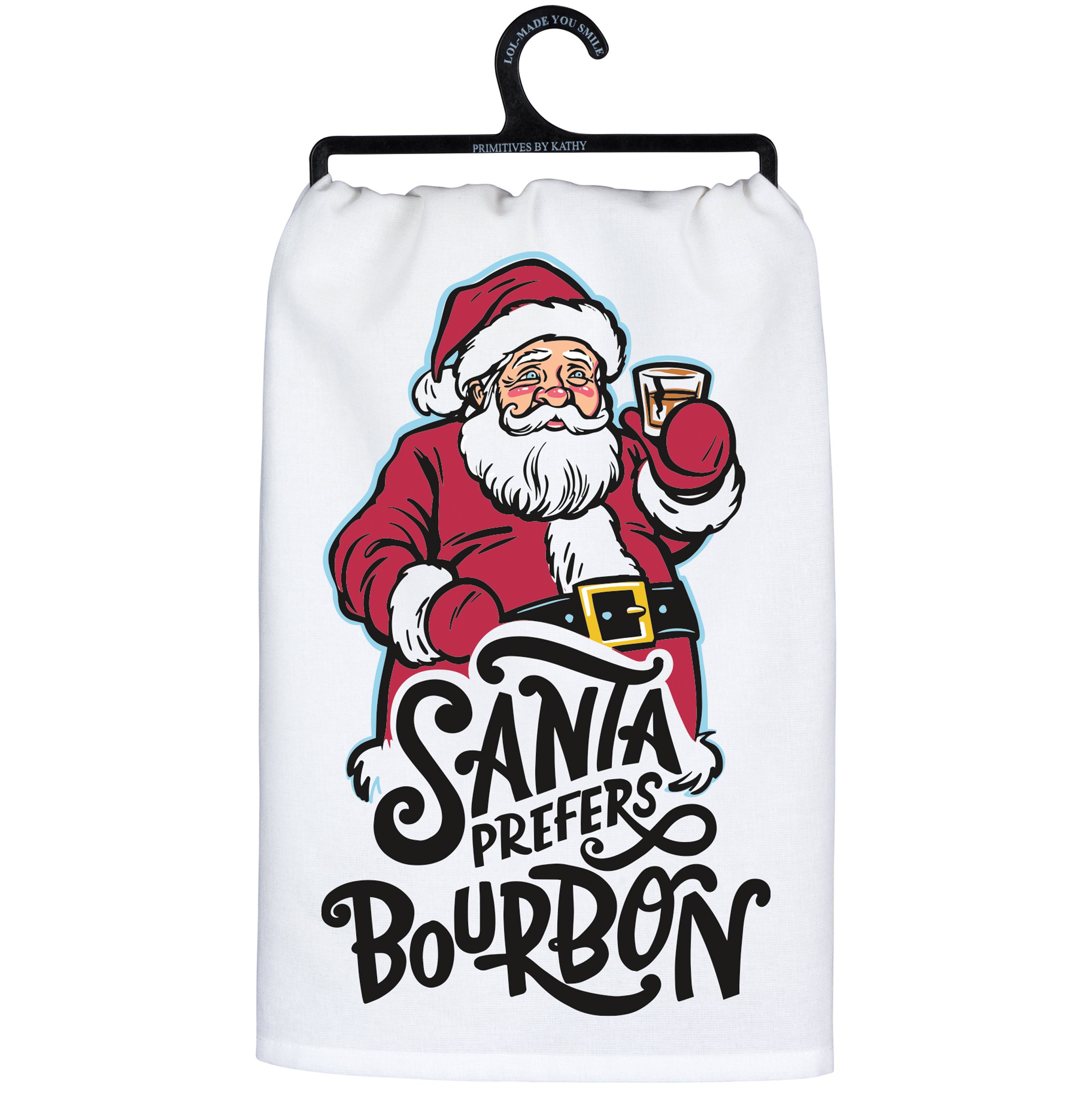 A white cotton kitchen towel from our Christmas Collection displaying a playful hand illustrated design of Santa holding a glass of bourbon with an alcohol inspired sentiment that reads "Santa Prefers Bourbon." Our Santa Prefers Bourbon kitchen towel is conveniently machine-washable for easy cleaning. This seasonal kitchen towel is packaged on a black plastic hanger to easily display on rack. A fun alcohol-themed Christmas gift perfect for adding personality to any kitchen while holiday decorating.