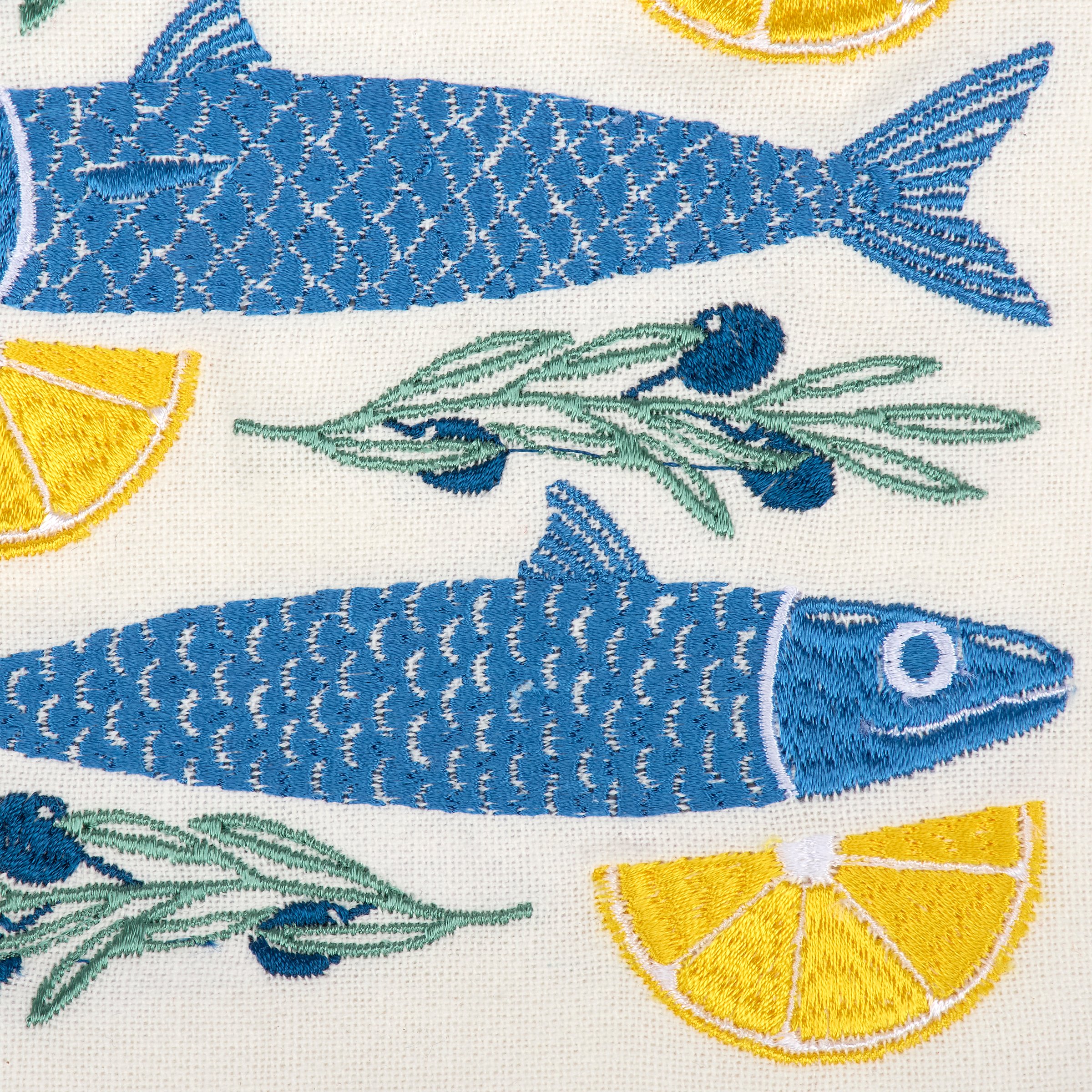 A cotton kitchen towel from our Beach Collection featuring embroidered designs of sardines with lemons and garnish inspired by Italian Coastal style. Our Sardines kitchen towel is conveniently machine-washable for easy cleaning. Coastal kitchen towel is packaged on a clear plastic hanger to easily display on rack. A beach themed kitchen accessory perfect for everyday use.