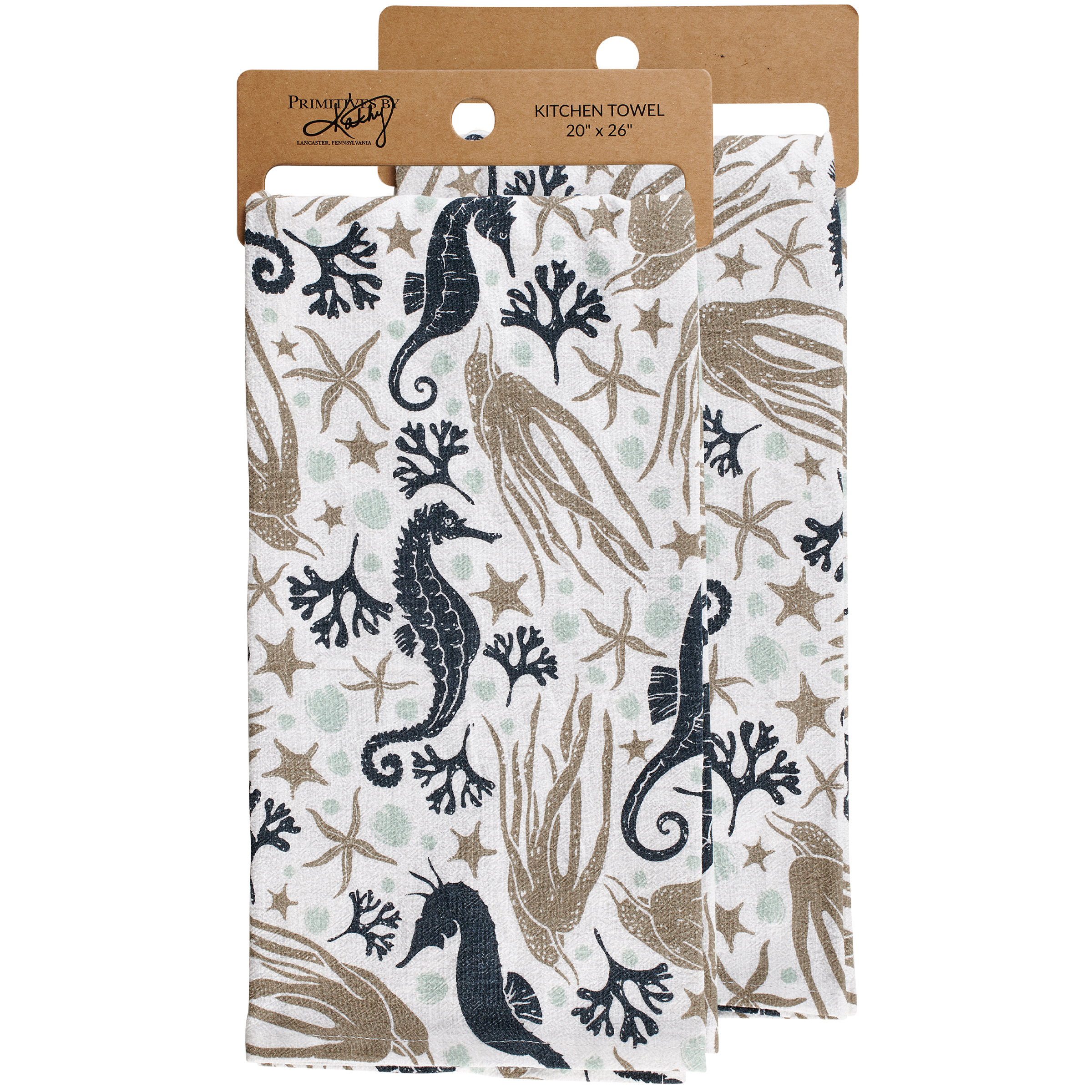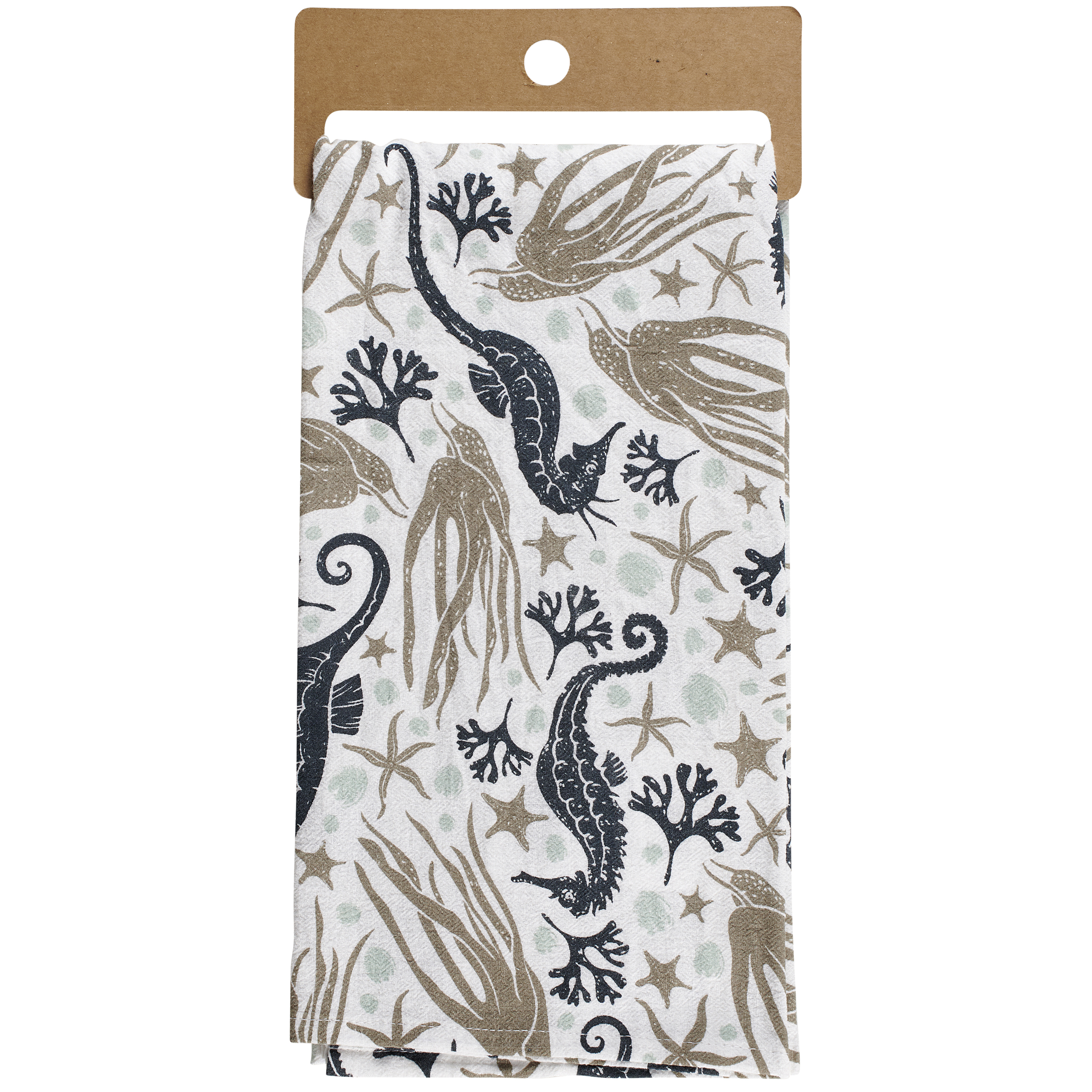 A cotton-linen blend kitchen towel from our Beach Collection displaying an all-over print of seahorses with coordinating sea plants in a deep nautical color palette. Our Seahorse kitchen towel is machine-washable for convenient cleaning. Packaged on a cardboard hanger with hole to easily display on rack. An ocean-themed kitchen accessory perfect for everyday use.