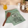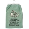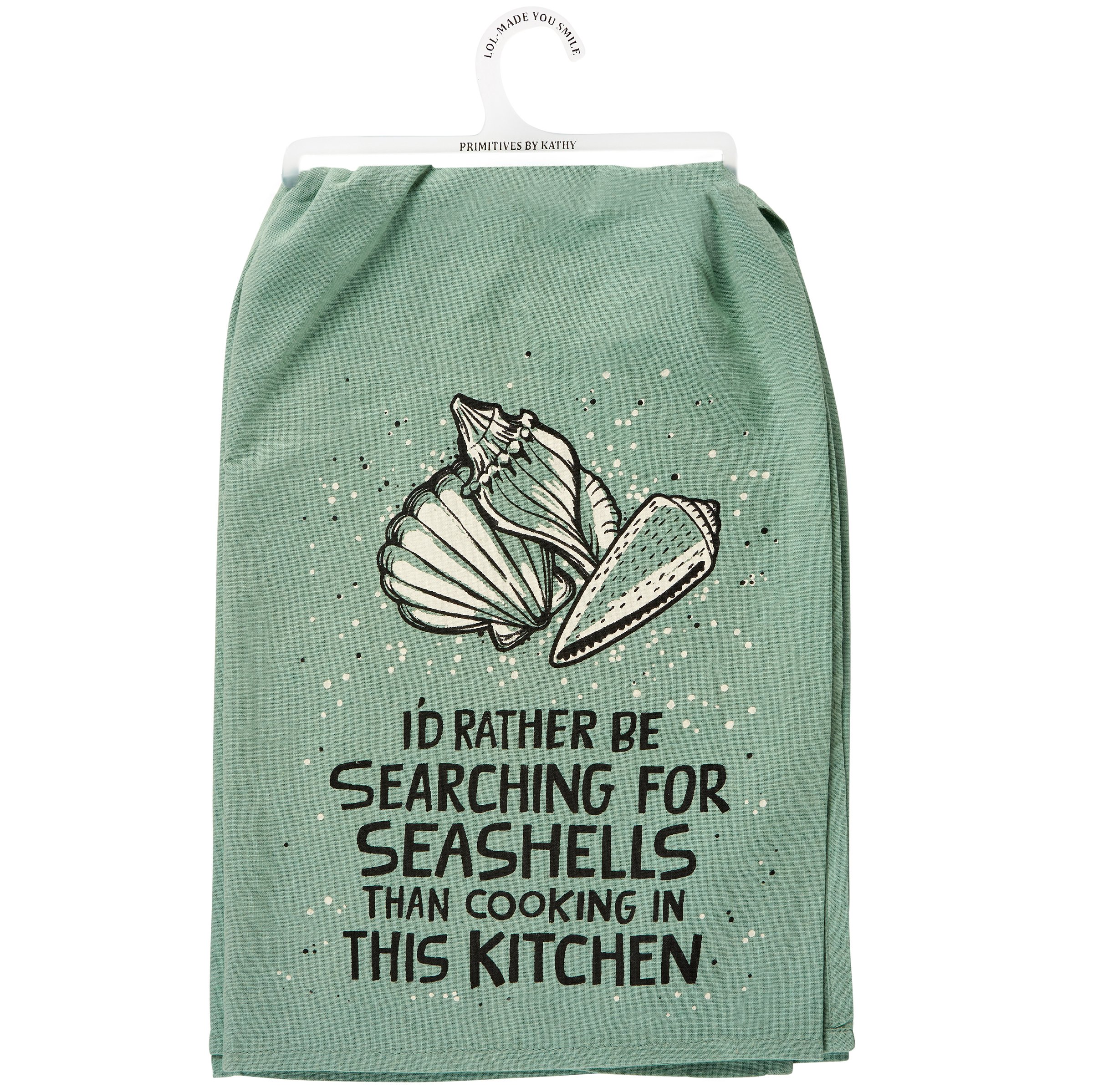 A sea green cotton kitchen towel from our Beach Collection displaying a unique hand illustrated design of seashells on the sand above a humorous beach-themed sentiment that reads "I'd Rather Be Searching For Seashells Than Cooking In This Kitchen." Our Seashells kitchen towel is machine-washable for convenient cleaning. Packaged on a clear plastic hanger to easily display on rack. A fun beach-themed kitchen accessory perfect for everyday use.
