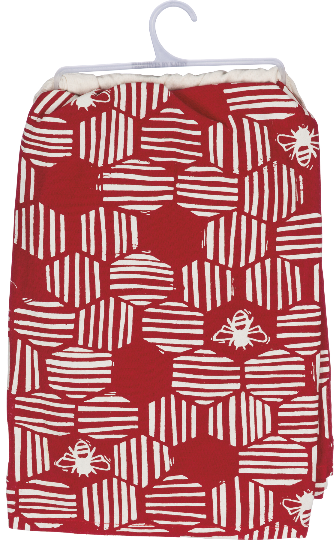 Set of two Christmas-themed kitchen towels featuring intricate, age-old block carving and printmaking techniques. One towel lends "Bee Merry" sentiment with bumblebee in a Santa hat design and is paired with a coordinating replicated honeycomb and bee patterned towel. Complements well with similar block print pieces to make for a festive collection. Machine-washable.
