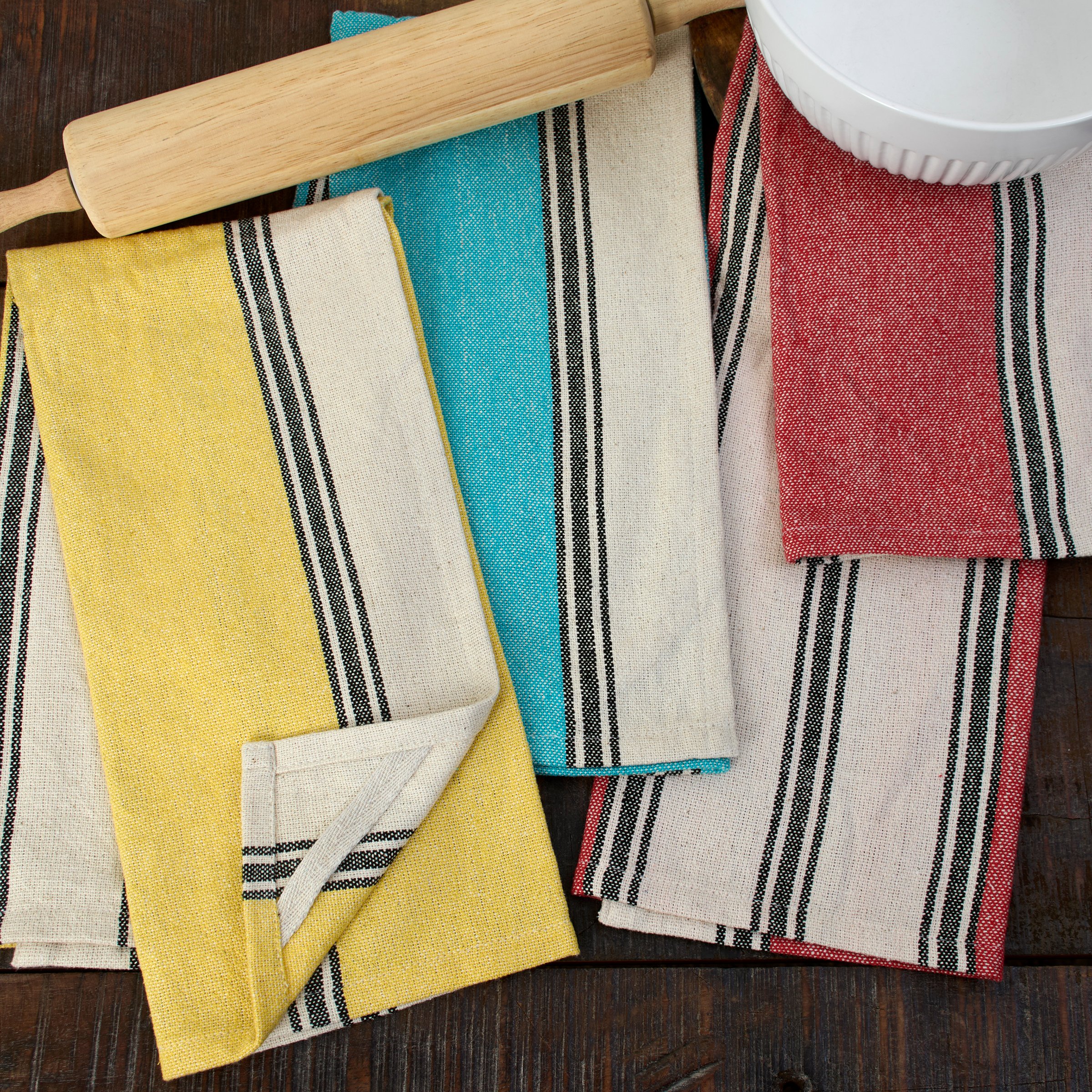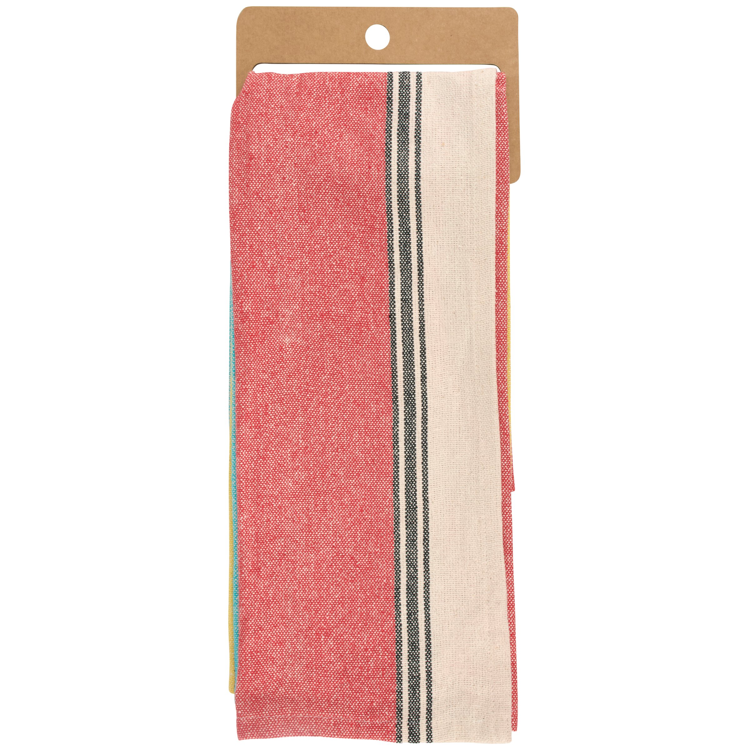 A set of cotton kitchen towel from our Lake & Cabin Collection including 3 towels with coordinating woven color bloc stripe designs inspired by vintage summer camp style. Our Color Bloc kitchen towel set is conveniently machine-washable for easy cleaning. Camp kitchen towel set is packaged together on a cardboard hanger with hole to easily display on rack. A set of camping themed kitchen accessories perfect for adding vintage style to cabin or RV.