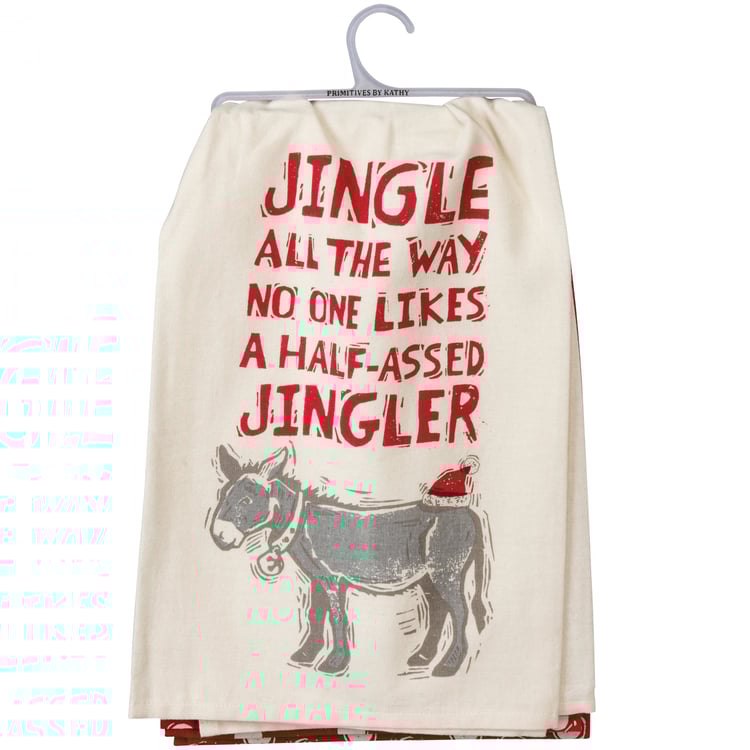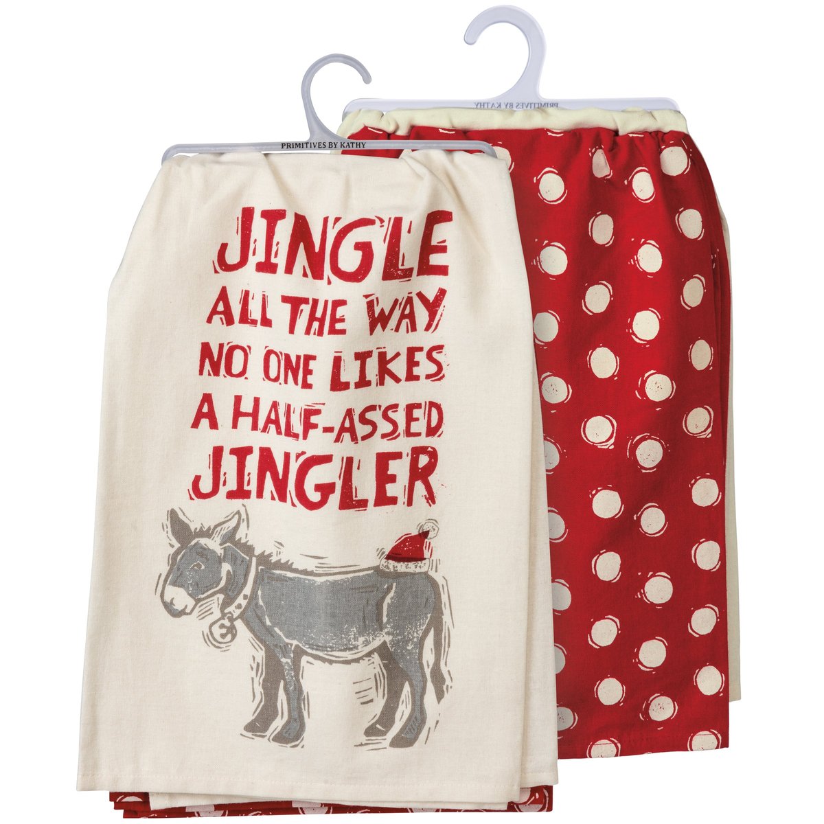 A set of two holiday-inspired cotton kitchen towels. One towel lends "Jingle All The Way No One Likes A Half-Assed Jingler" sentiment with holiday-themed donkey. It's paired with a coordinating red towel featuring an all-over snowball design. Complements well with coordinating holiday pieces.