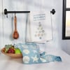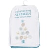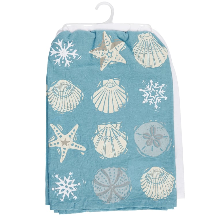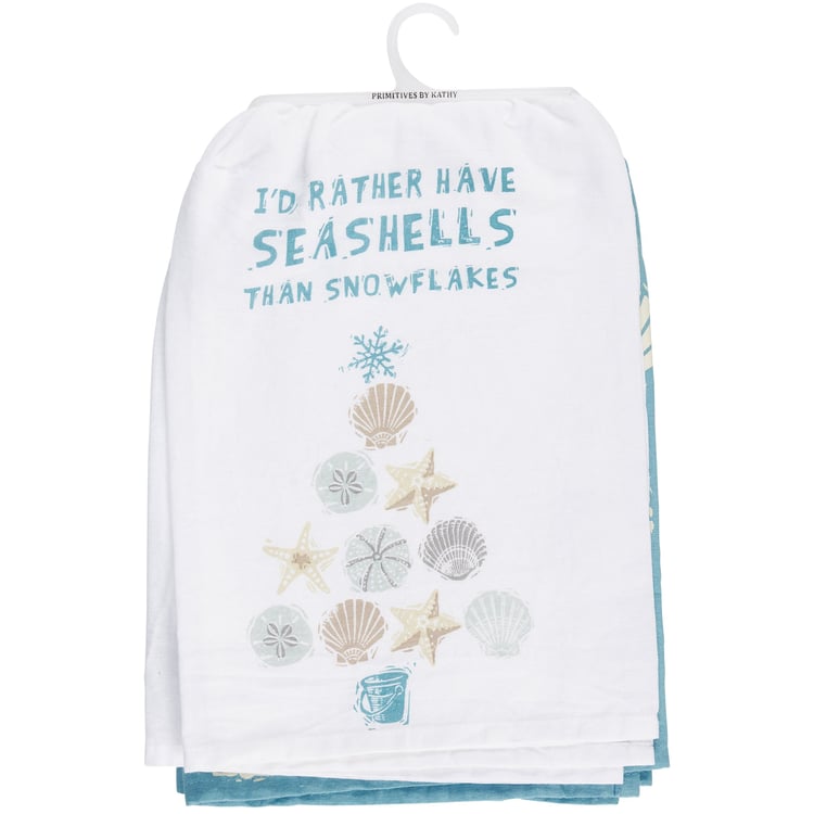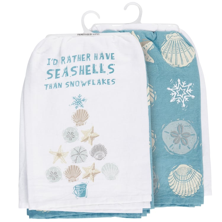 A set of cotton kitchen towels from our Beach Collection featuring a fun combination of Christmas and a love of the beach. Set includes one white kitchen towel and one blue kitchen towel with block print style art and a beach inspired color palette. White kitchen towel displays a Christmas tree design with beach pail base, body made of seashells, and snowflake for the star with a beach and Christmas-themed sentiment that reads "I'd Rather Have Seashells Than Snowflakes." Blue kitchen towel displays an all-over print of seashell and snowflake designs. Our Seashell kitchen towels are machine-washable for convenient cleaning. Packaged on a clear plastic hanger to easily display on rack. A fun kitchen accessory perfect for celebrating Christmas at the beach.