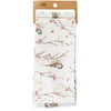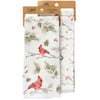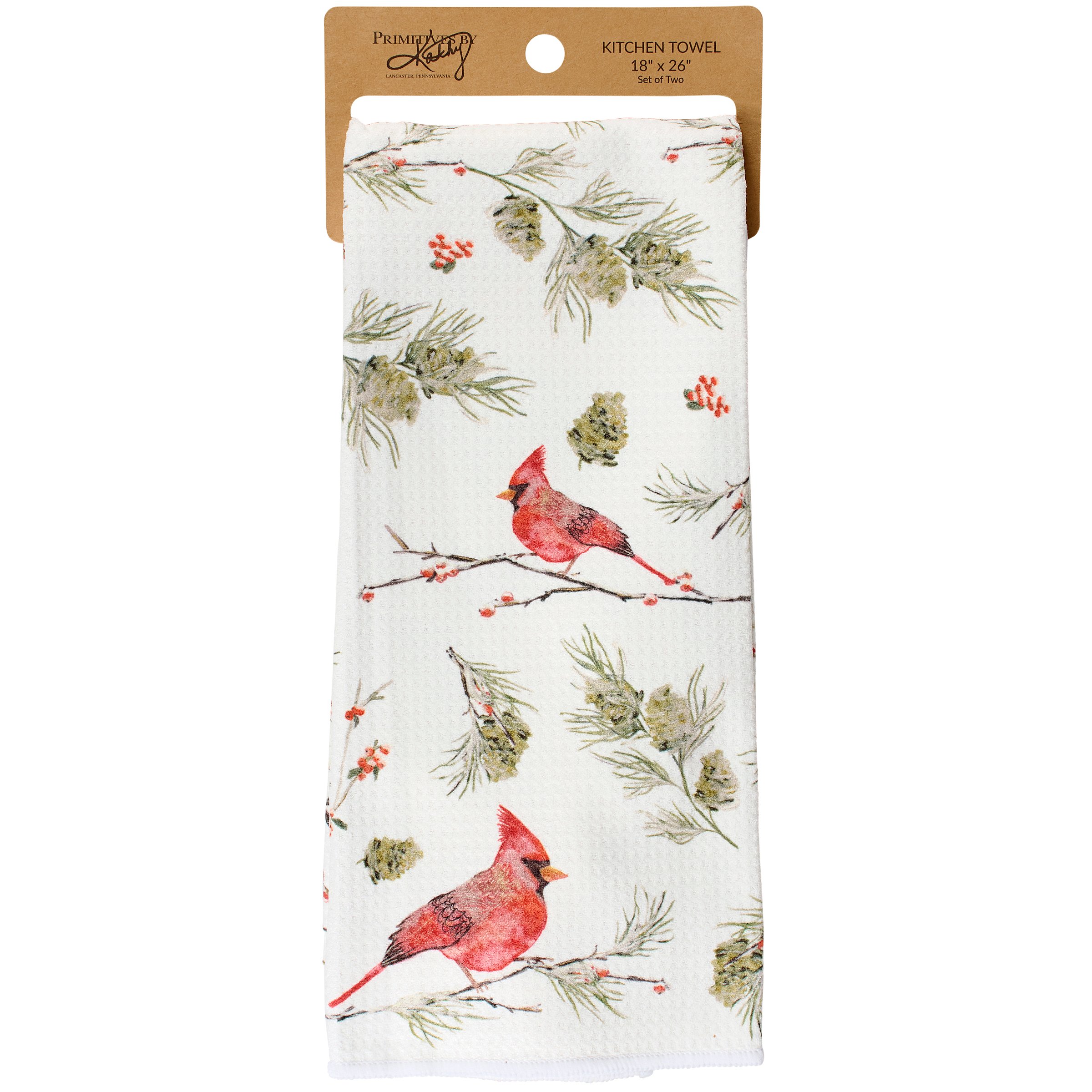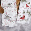 A set of 2 microfiber kitchen towels from our Christmas Collection displaying all-over designs of winter birds perched on snowy branches replicated from original art hand painted in a unique watercolor style. Winter bird designs include red cardinals on one towel and chickadees on the other towel. Our Winter Birds kitchen towel set is conveniently machine-washable for easy cleaning. Seasonal kitchen towels are packaged together on a cardboard hanger with hole to easily display on rack. A nature-themed Christmas kitchen accessory perfect for seasonal use.