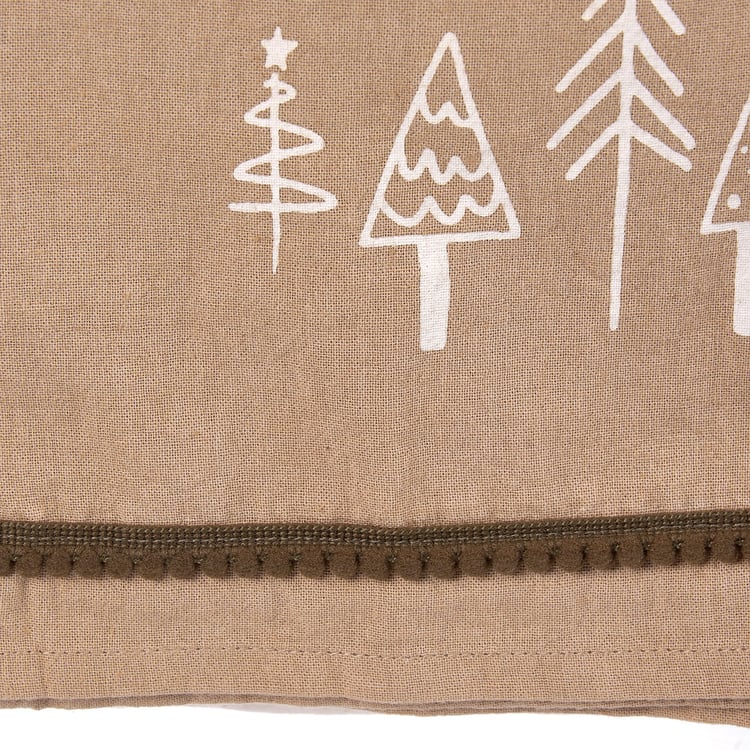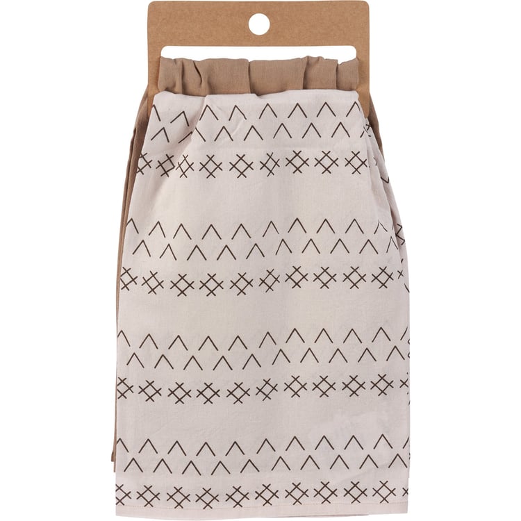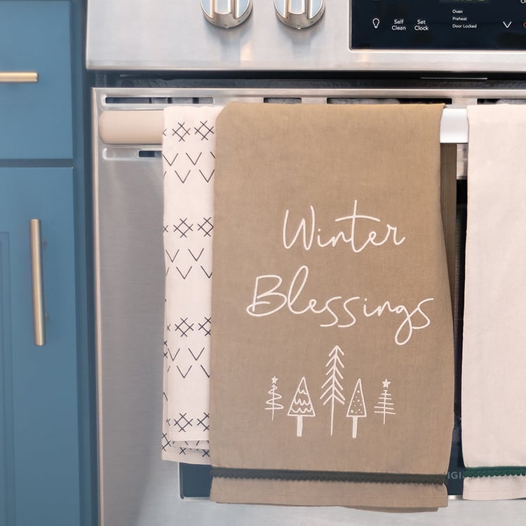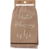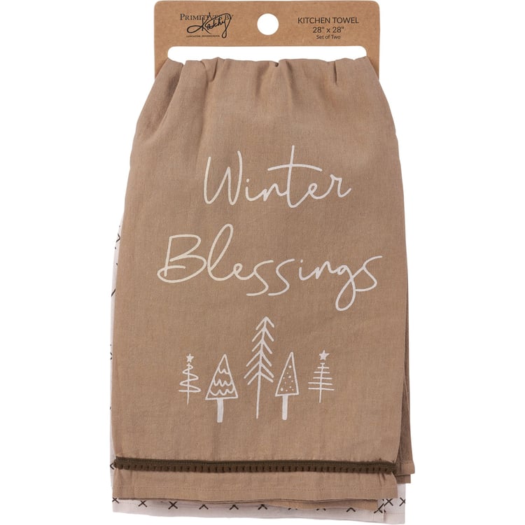 A cotton kitchen towel set from our Christmas Collection displaying a natural brown color palette and bohemian inspired designs. Set includes one tan towel featuring "Winter Blessings" sentiment with pom trim and one gray towel with complementing all-over print design. Packaged on a cardboard hanger with hole to easily hang on rack. Our Winter Blessings kitchen towel set is machine-washable.