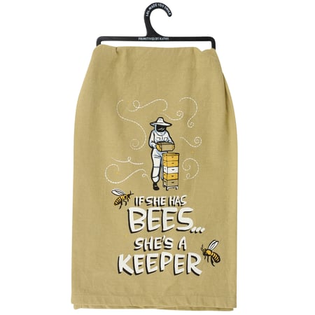 A green cotton kitchen towel from our Homestead Collection displaying a playful hand illustrated design of a beekeeper and honey bees with a fun beekeeper inspired sentiment that reads "If She Has Bees... She's A Keeper." Our She's A Keeper kitchen towel is conveniently machine-washable for easy cleaning. This homestead kitchen towel is packaged on a black plastic hanger to easily display on rack. A fun bee-themed gift perfect for adding personality to any kitchen while showing off their DIY lifestyle.