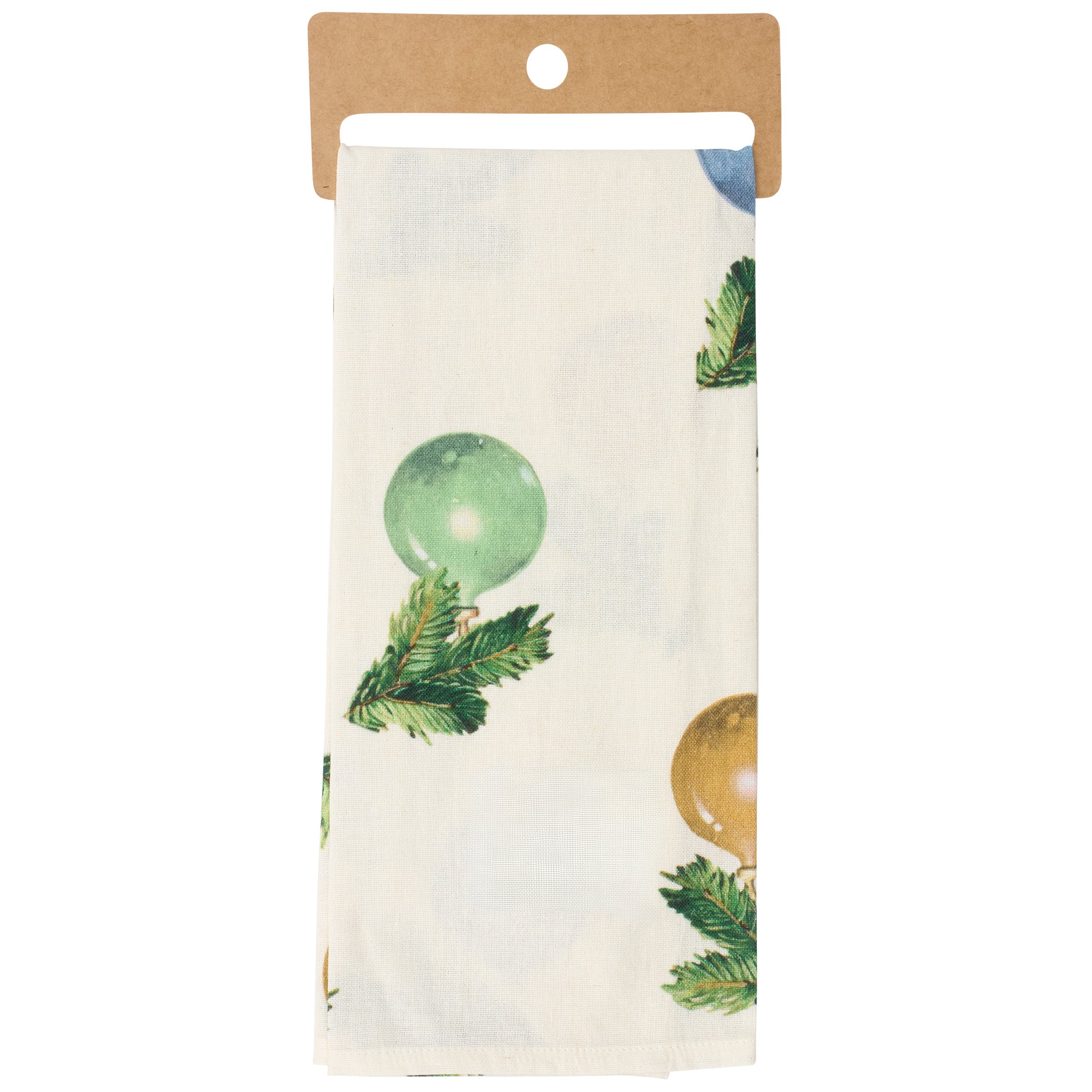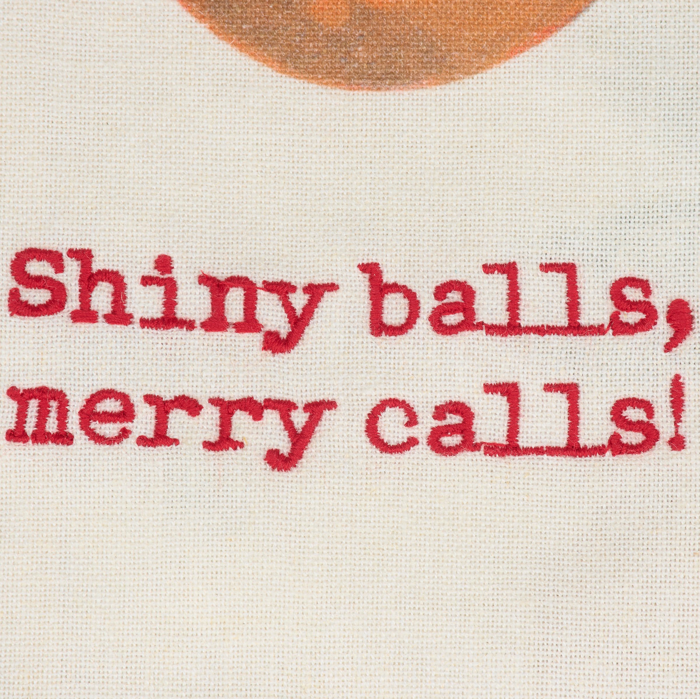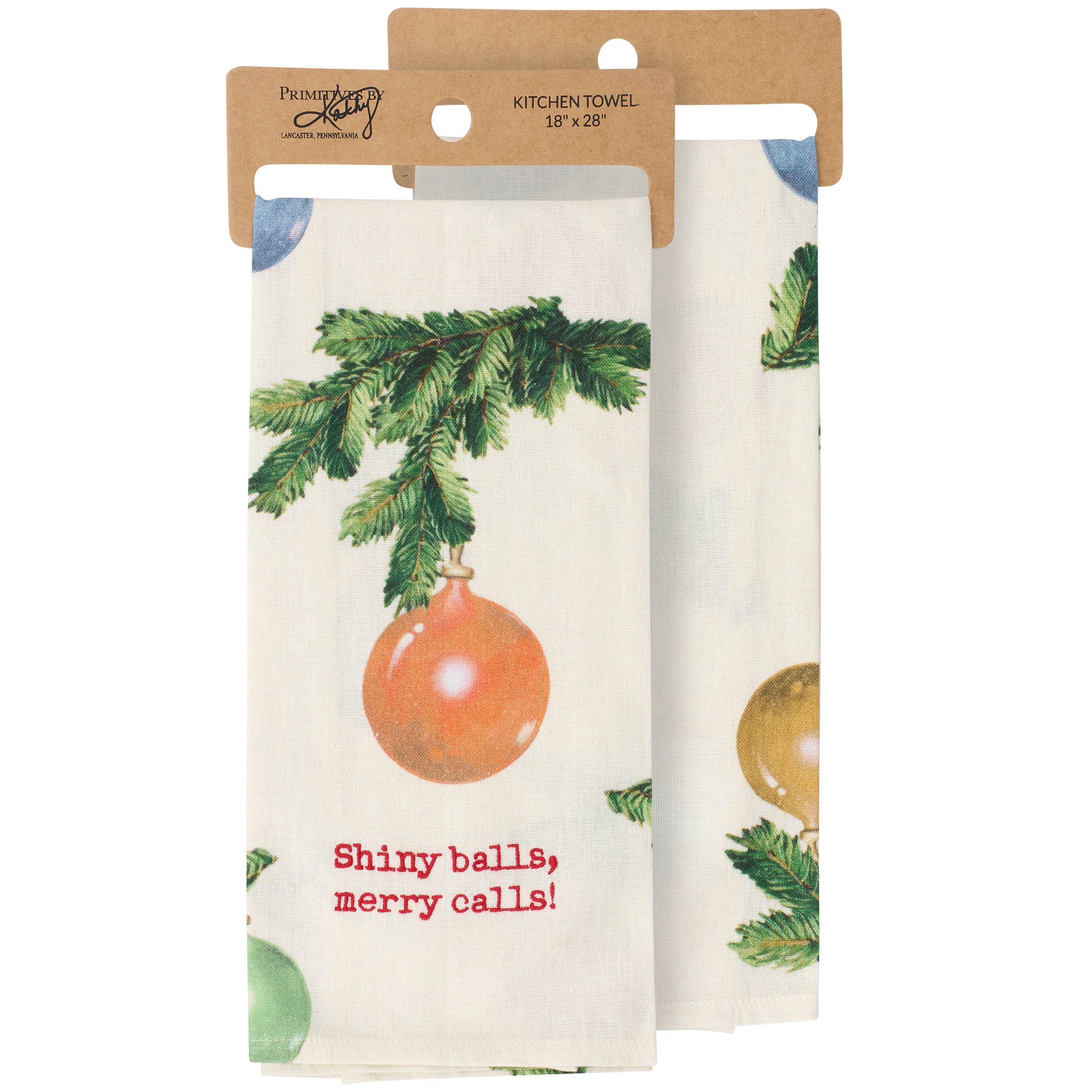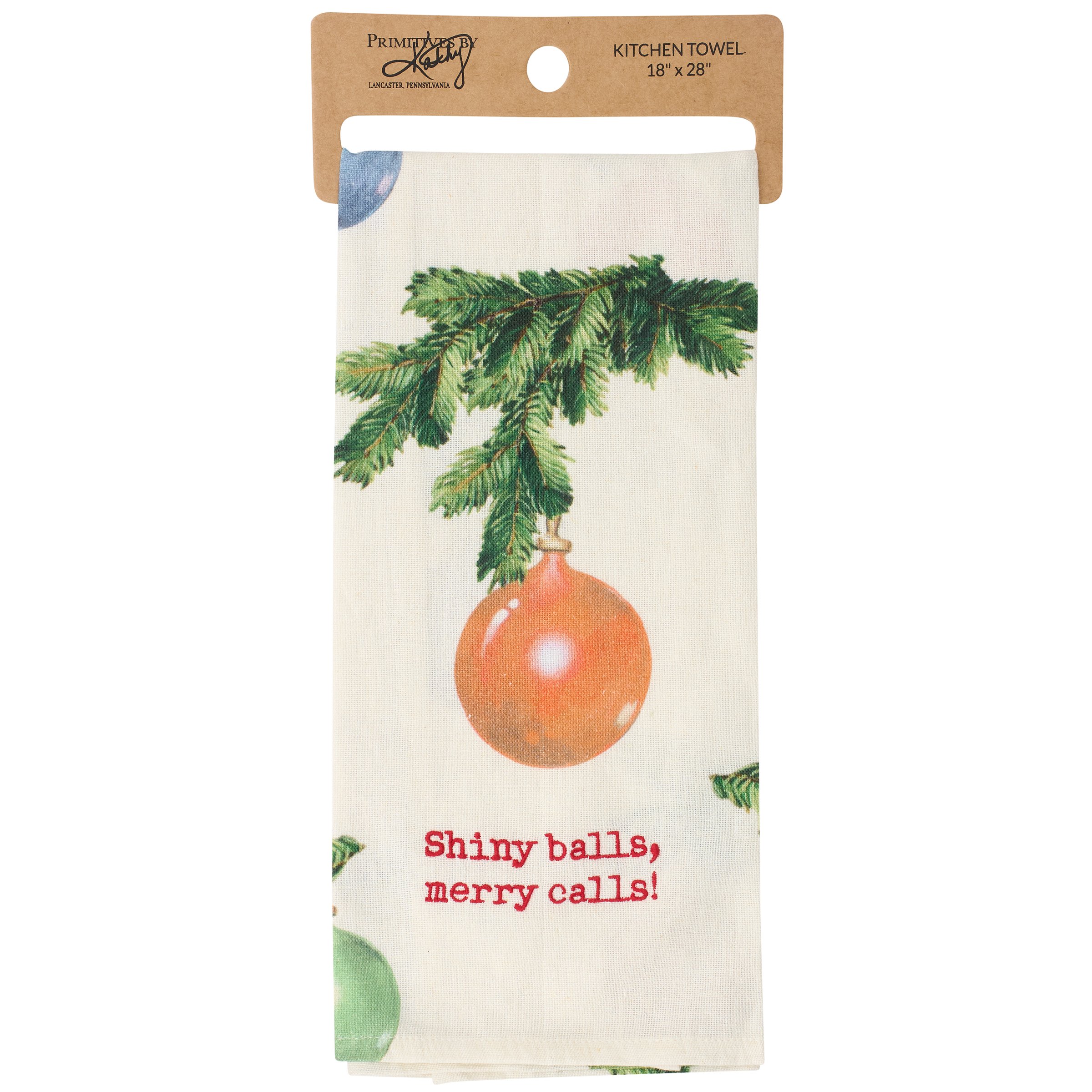 A cotton-linen kitchen towel from our Christmas Collection featuring an all-over design displaying vintage art of Christmas ornaments with a fun holiday pun that reads "Shiny Balls, Merry Calls!" Holiday pun sentiment is embroidered for added interest. Our Merry Calls kitchen towel is conveniently machine washable for easy cleaning. Christmas kitchen towel is packaged on a cardboard hanger with hole to easily display on rack. A fun Christmas gift perfect for adding seasonal style to any kitchen.