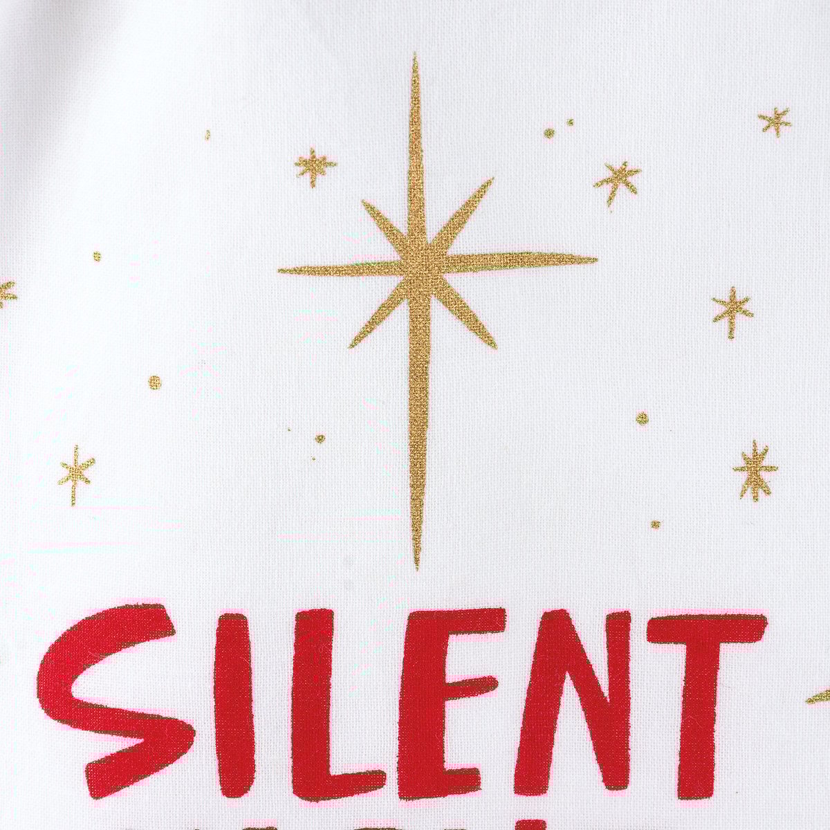A festive cotton kitchen towel featuring "Silent Night…What's That? And How Do I Get One?" sentiment with metallic star designs. Silent Night kitchen towel is machine-washable.