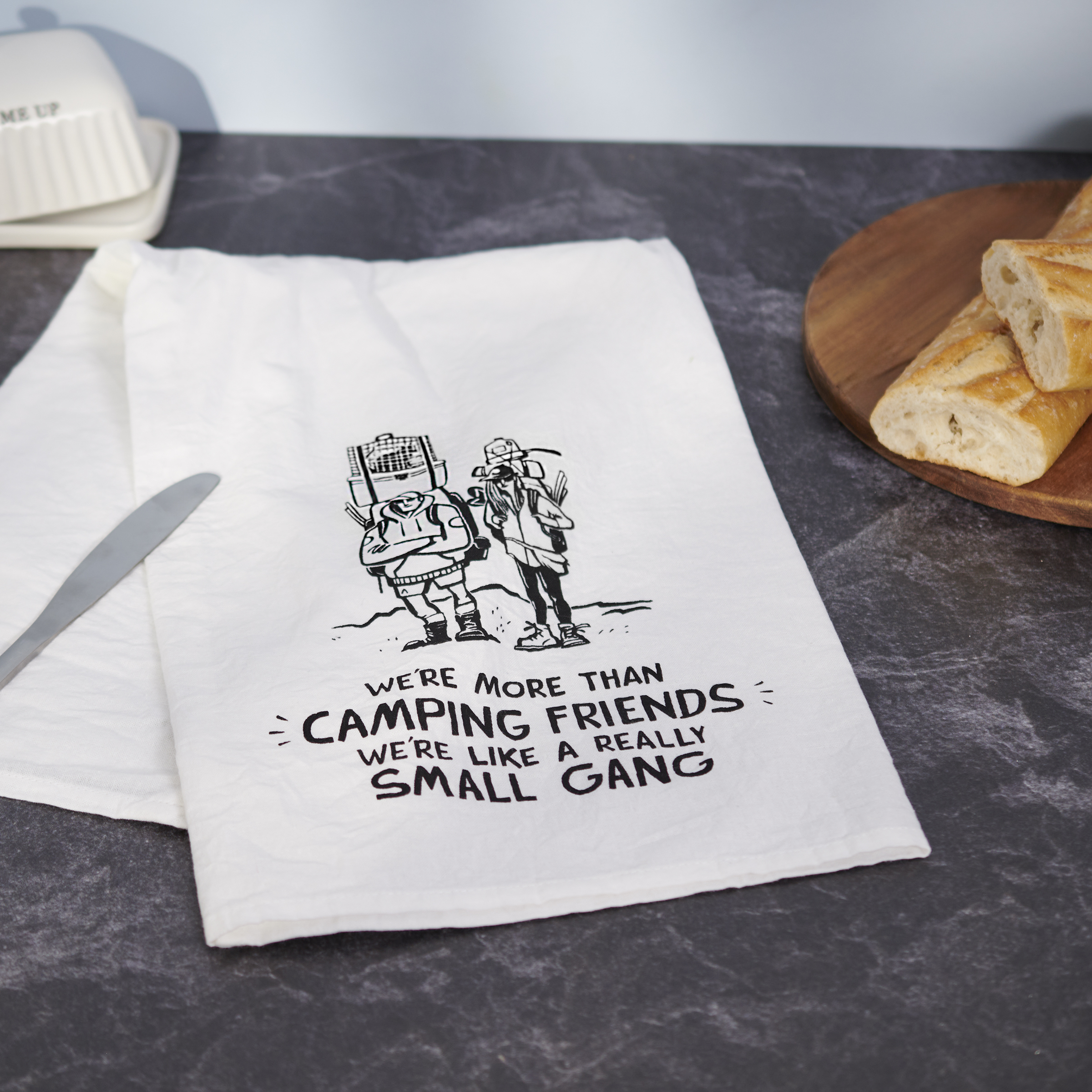 A black and white cotton kitchen towel from our Lake & Cabin Collection displaying a unique hand illustrated design of a two people carrying full camping gear, cooler, and pet carrier above a humorous camping-themed sentiment that reads "We're More Than Camping Friends - We're Like A Really Small Gang." Our Small Gang kitchen towel is machine-washable for convenient cleaning. Packaged on a black plastic hanger to easily display on rack. A fun camping-themed kitchen accessory perfect for everyday use and for gifting.