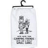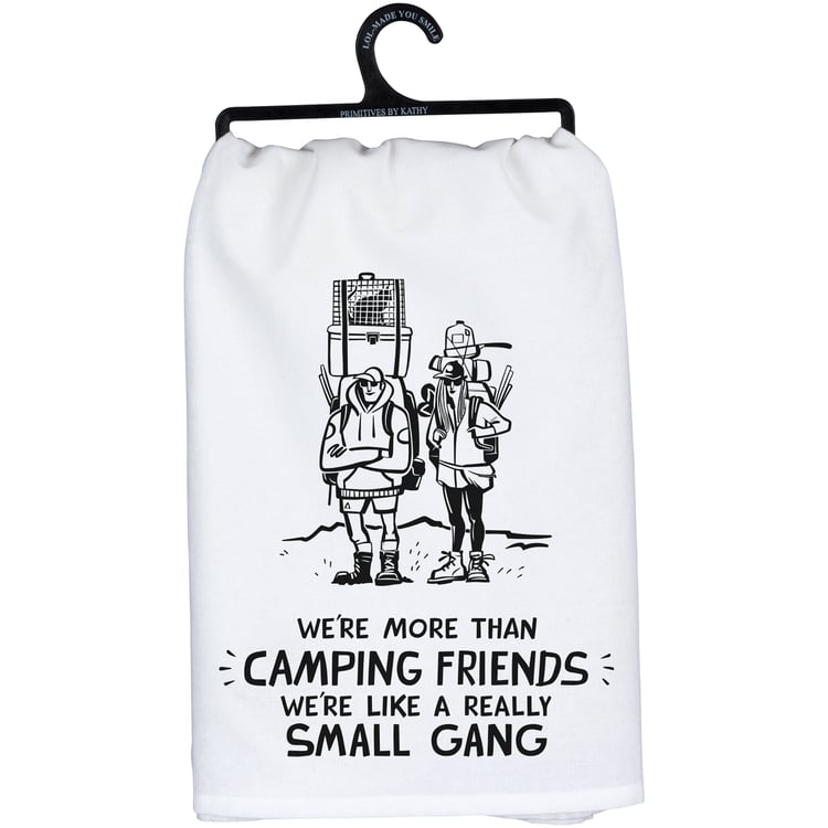 A black and white cotton kitchen towel from our Lake & Cabin Collection displaying a unique hand illustrated design of a two people carrying full camping gear, cooler, and pet carrier above a humorous camping-themed sentiment that reads "We're More Than Camping Friends - We're Like A Really Small Gang." Our Small Gang kitchen towel is machine-washable for convenient cleaning. Packaged on a black plastic hanger to easily display on rack. A fun camping-themed kitchen accessory perfect for everyday use and for gifting.