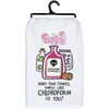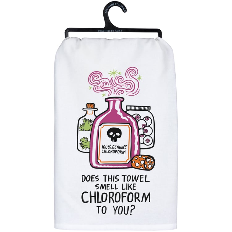 A cotton kitchen towel from our Halloween Collection displaying a colorful hand illustrated design of potion bottles with a fun Halloween inspired sentiment that reads "Does This Towel Smell Like Chloroform To You?" Our Chloroform kitchen towel is conveniently machine-washable for easy cleaning. Seasonal kitchen towel is packaged on a black plastic hanger to easily display on rack. A fun Halloween-themed kitchen accessory perfect for seasonal use.