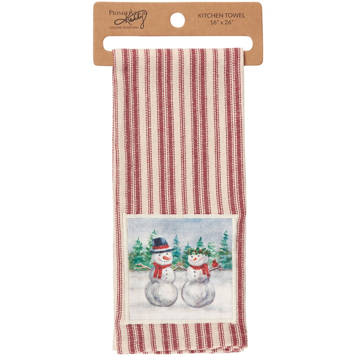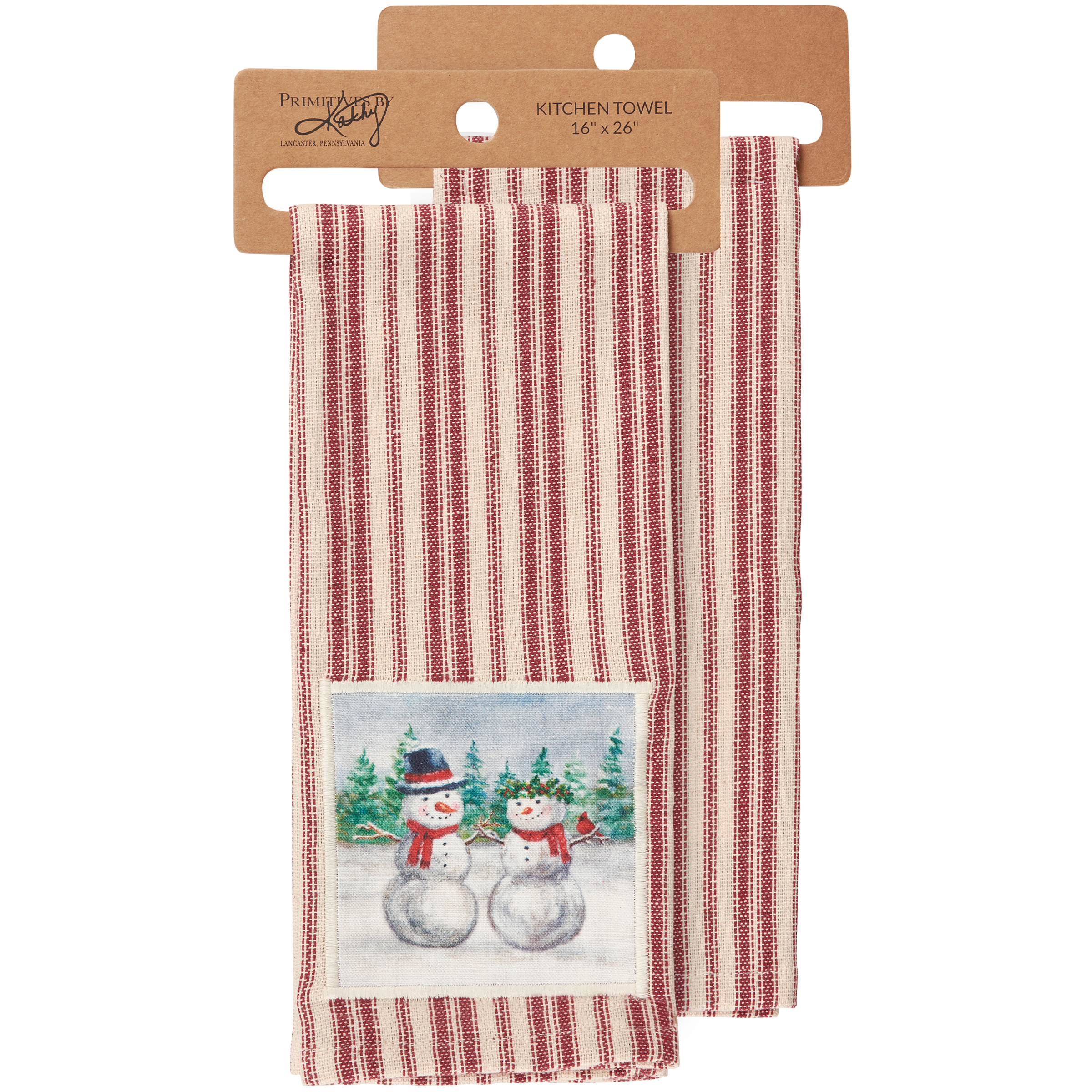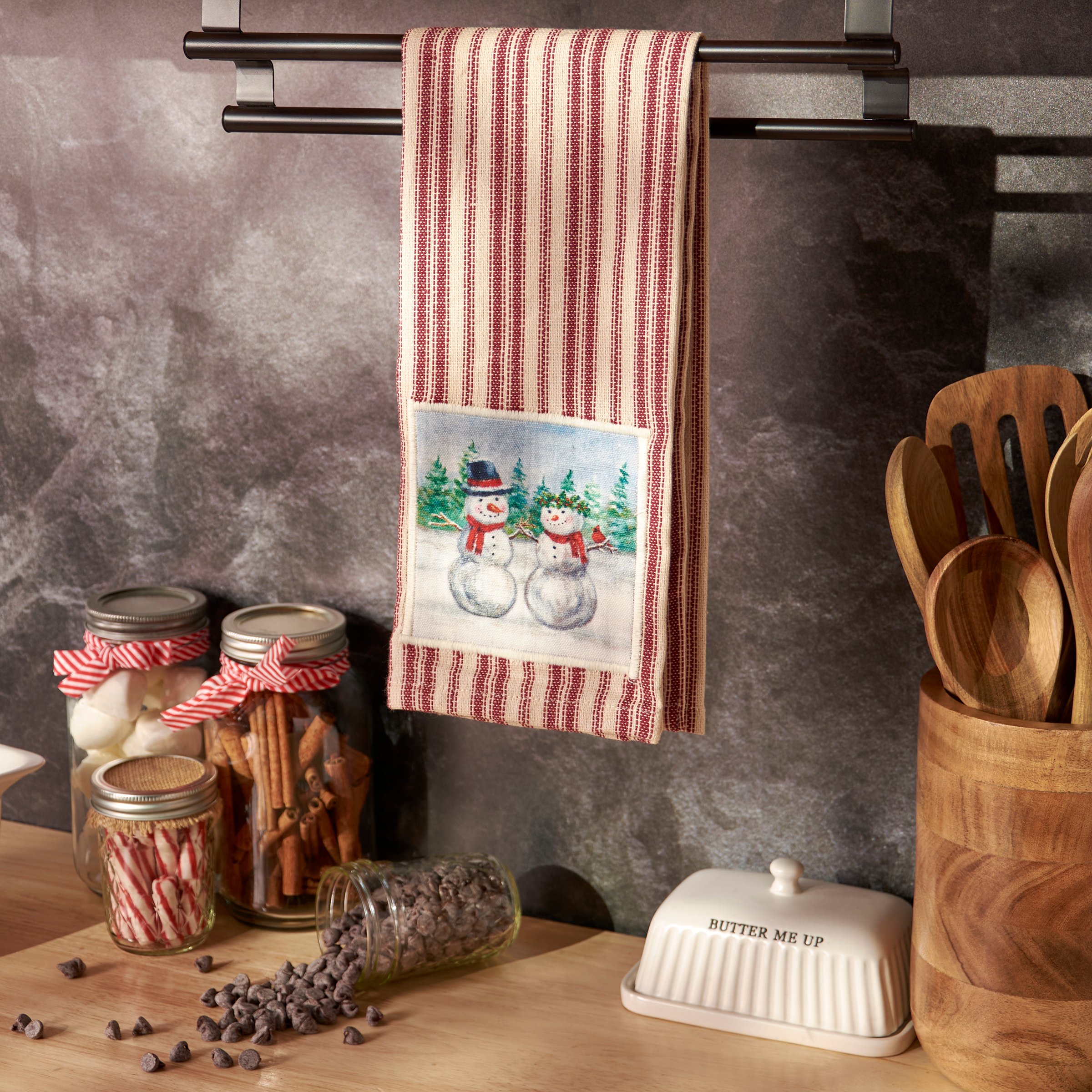 A cotton kitchen towel from our Christmas Collection featuring a stitched art panel with Christmas inspired stripe pattern all-over towel. Art panel displays a merry snow family in a winter scene. Design is replicated from original artwork painted onto burlap canvas, giving the art a unique depth and texture. Our Snow Family kitchen towel is conveniently machine-washable for easy cleaning. Seasonal kitchen towel is packaged on a cardboard hanger with hole to easily hang on rack. A rustic winter-themed kitchen accessory perfect for seasonal use.