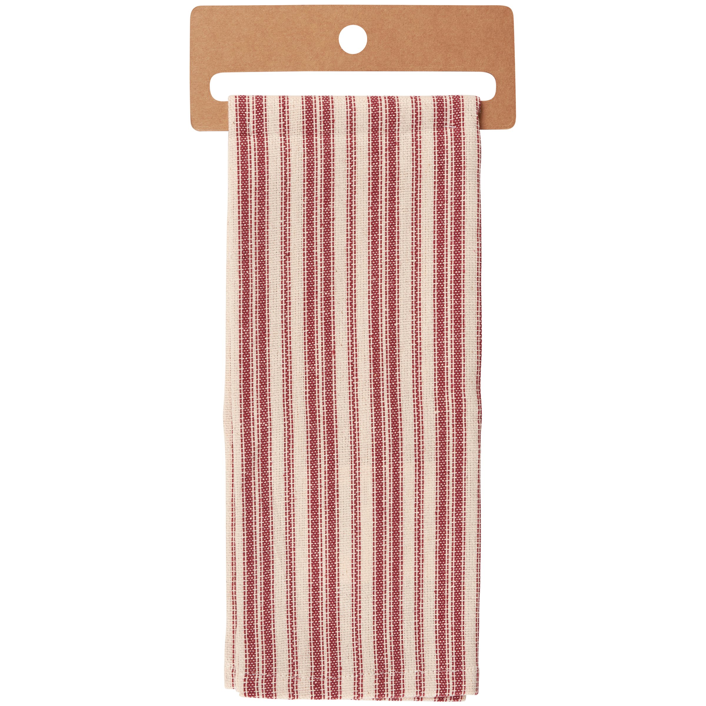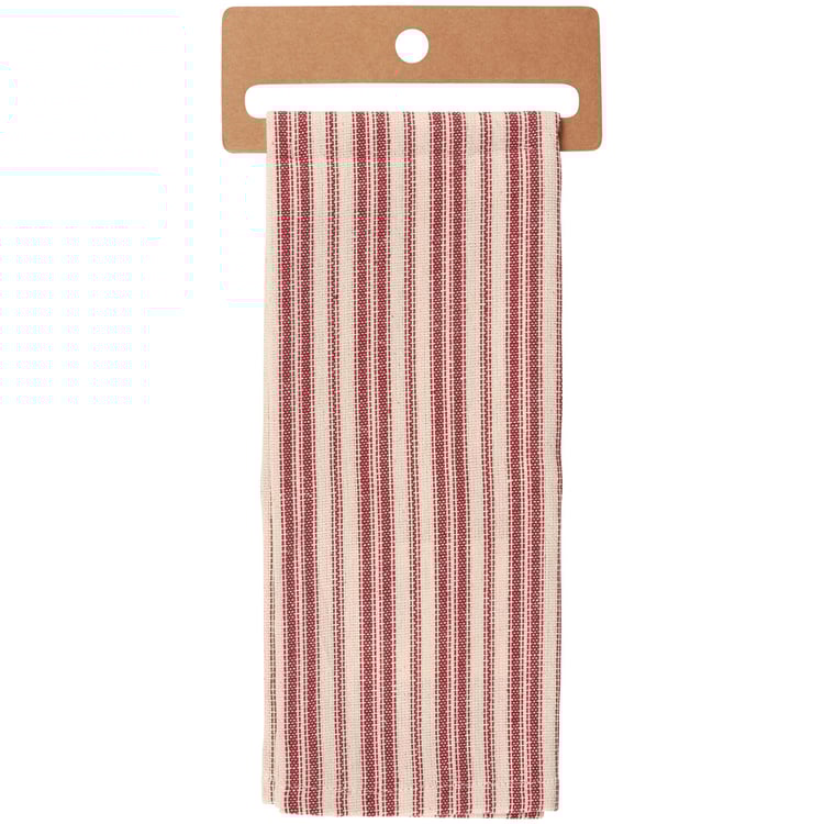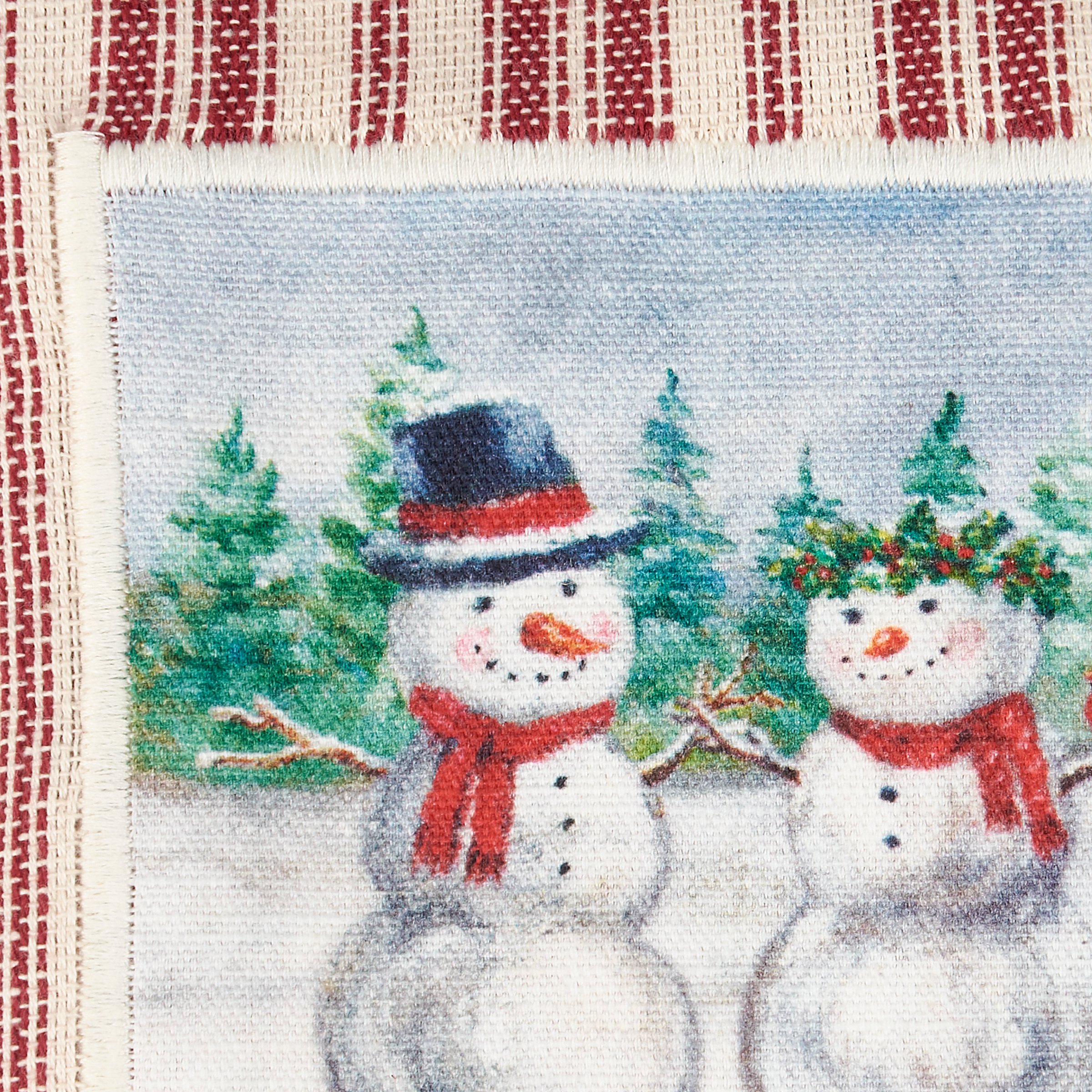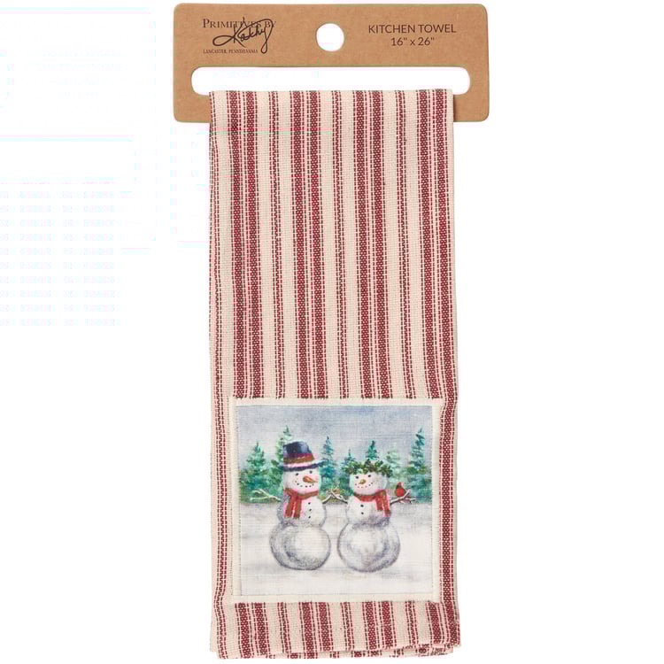 A cotton kitchen towel from our Christmas Collection featuring a stitched art panel with Christmas inspired stripe pattern all-over towel. Art panel displays a merry snow family in a winter scene. Design is replicated from original artwork painted onto burlap canvas, giving the art a unique depth and texture. Our Snow Family kitchen towel is conveniently machine-washable for easy cleaning. Seasonal kitchen towel is packaged on a cardboard hanger with hole to easily hang on rack. A rustic winter-themed kitchen accessory perfect for seasonal use.