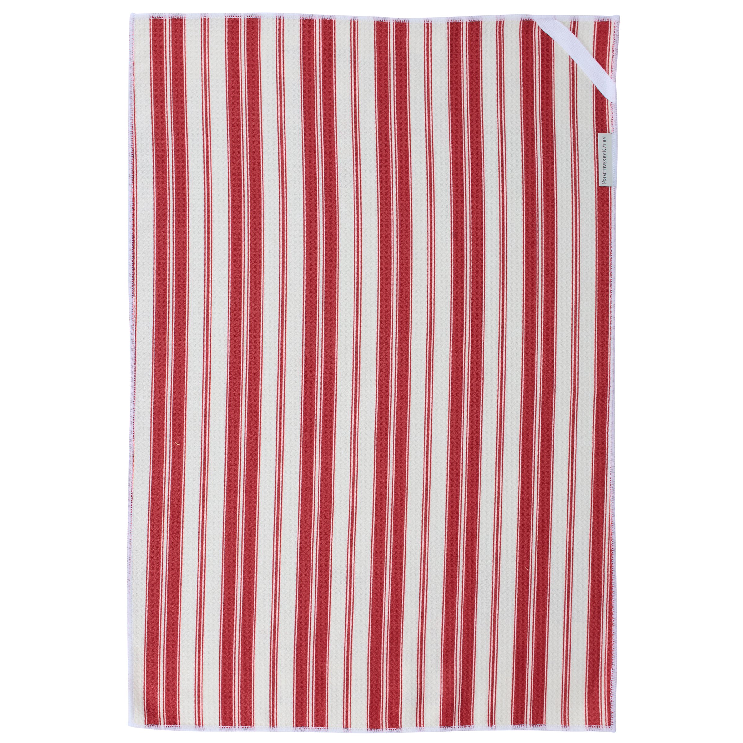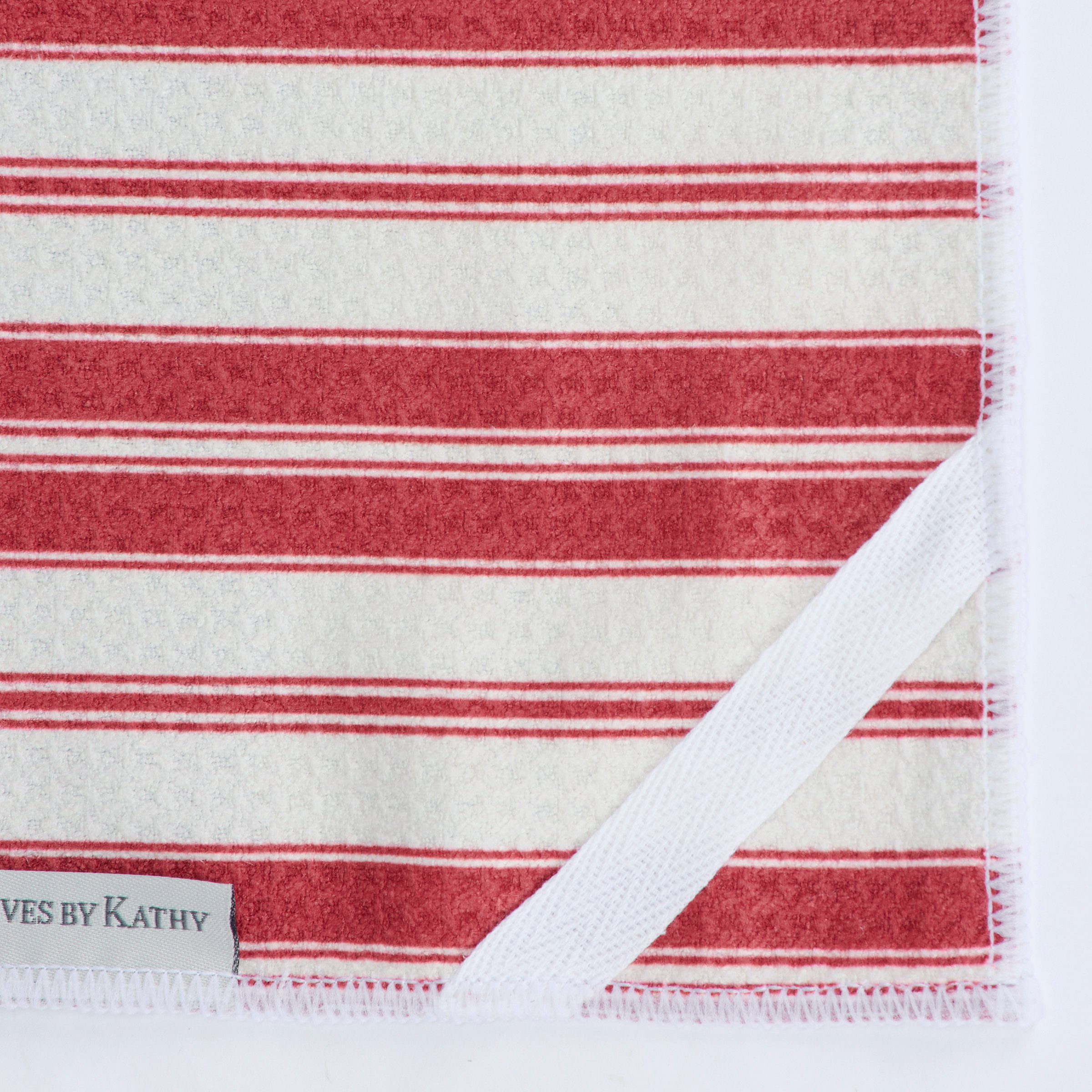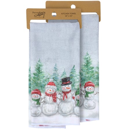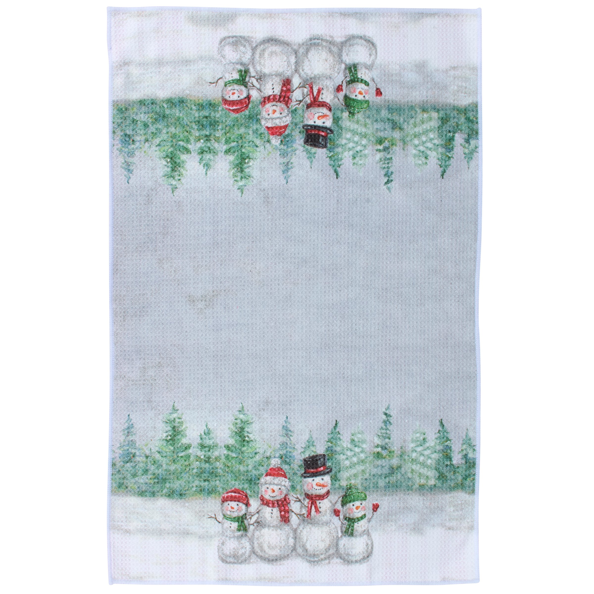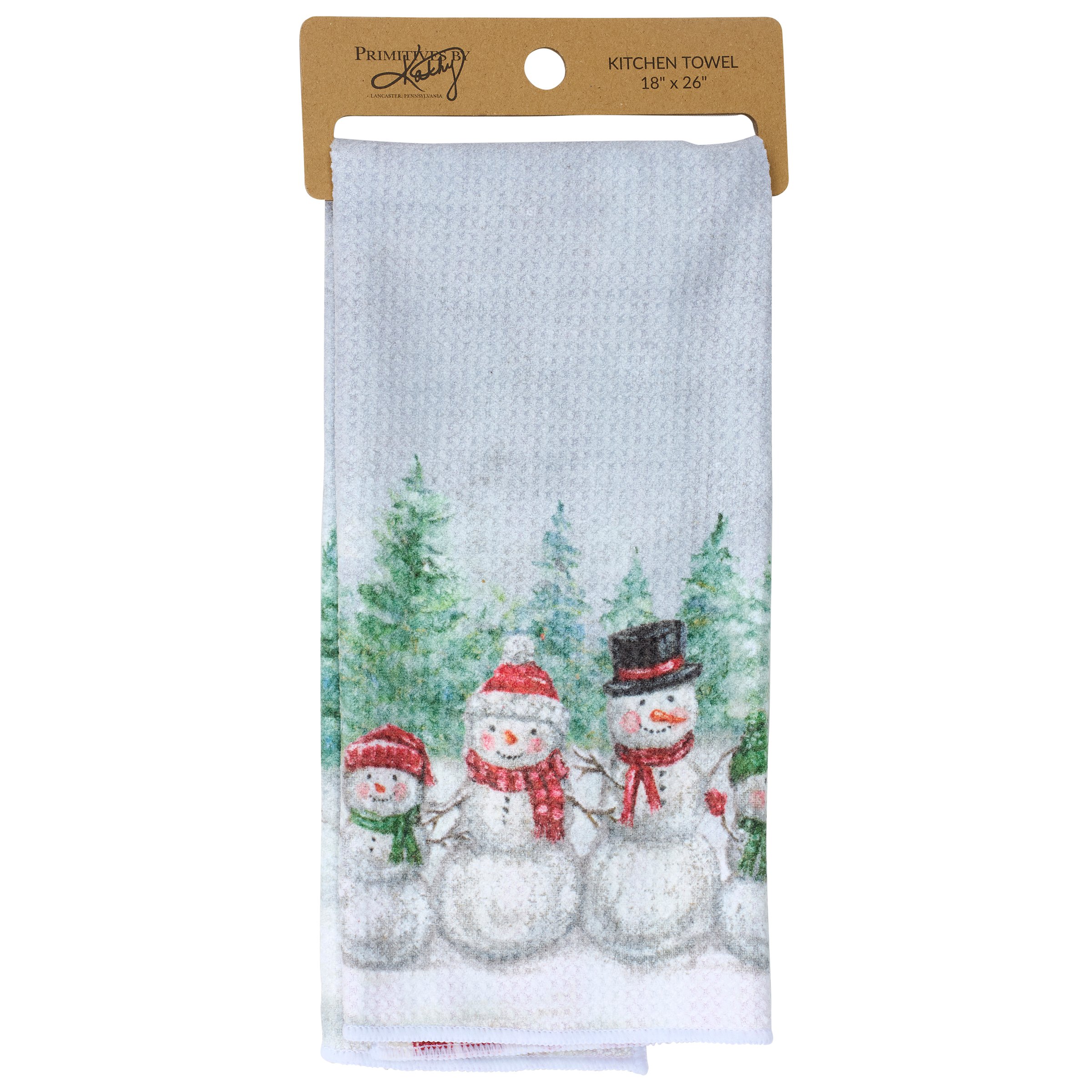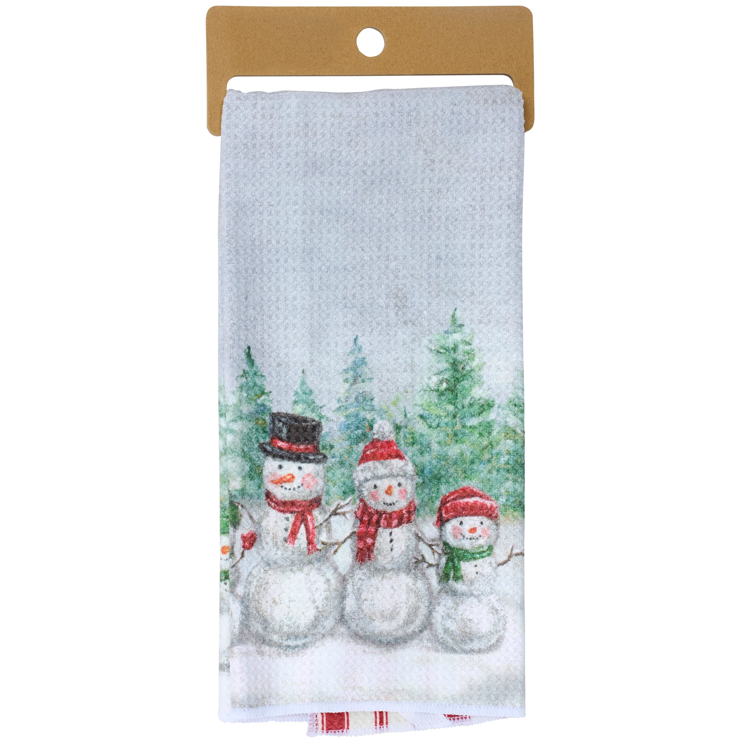 A microfiber kitchen towel from our Christmas Collection featuring an all-over design displaying a charming winter scene of a snowman family on the front and candy cane stripes on the back with a cotton tape hanger in the corner. Snowman family design is replicated from original artwork painted onto burlap canvas, giving the art a unique depth and texture. Our Snowman Family kitchen towel is conveniently machine washable for easy cleaning. Seasonal kitchen towel is packaged on a cardboard hanger with hole to easily display on rack. A rustic Christmas kitchen accessory perfect for adding seasonal style to any kitchen.
