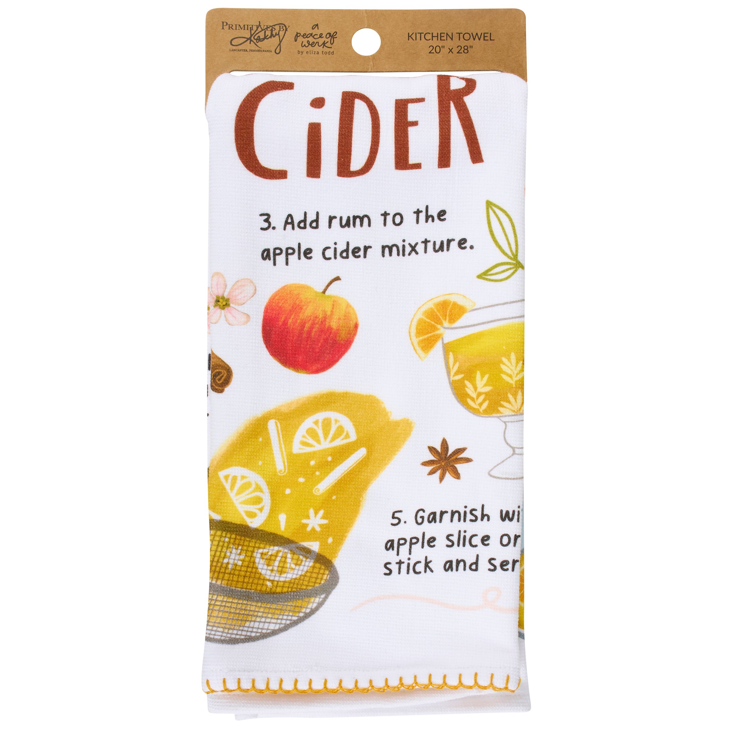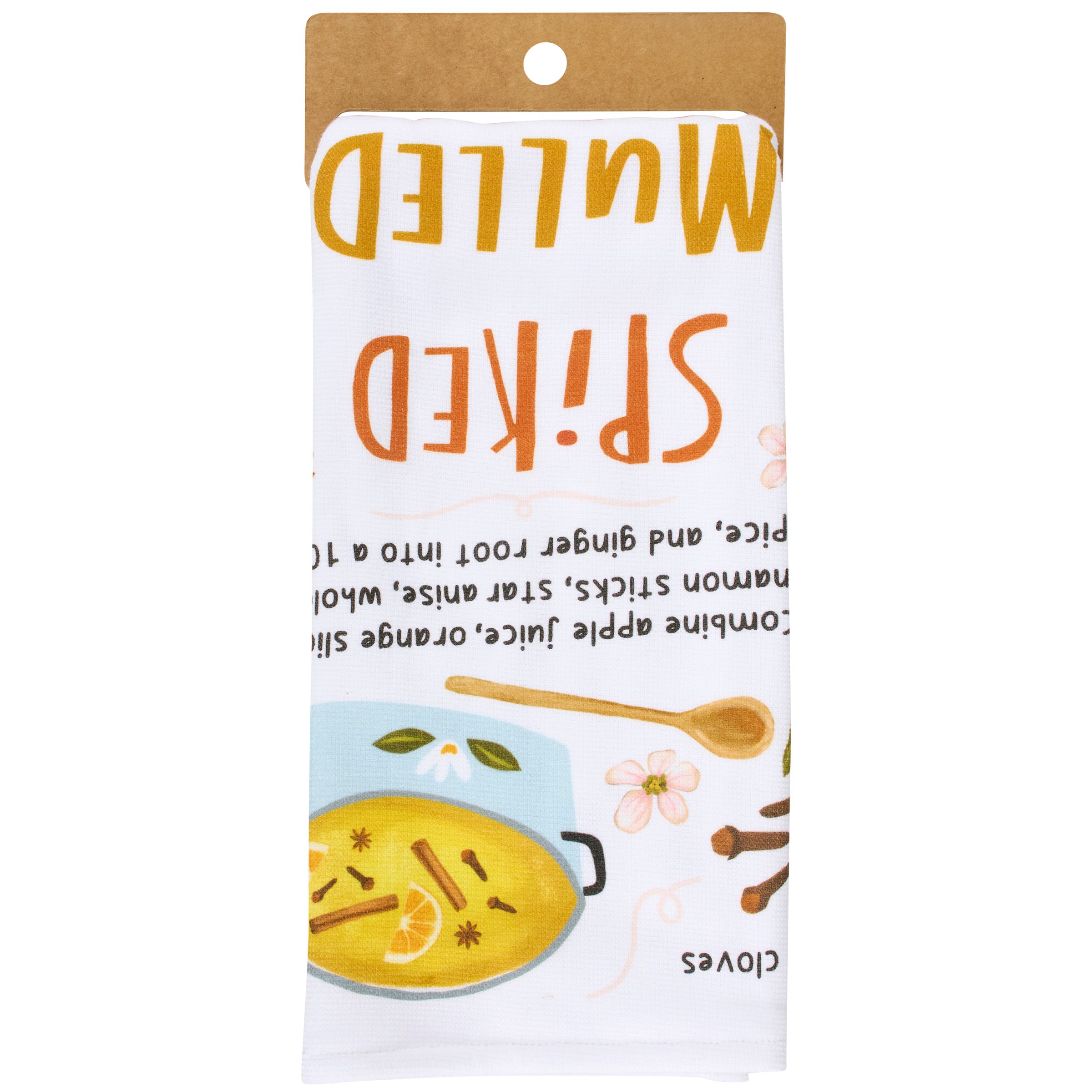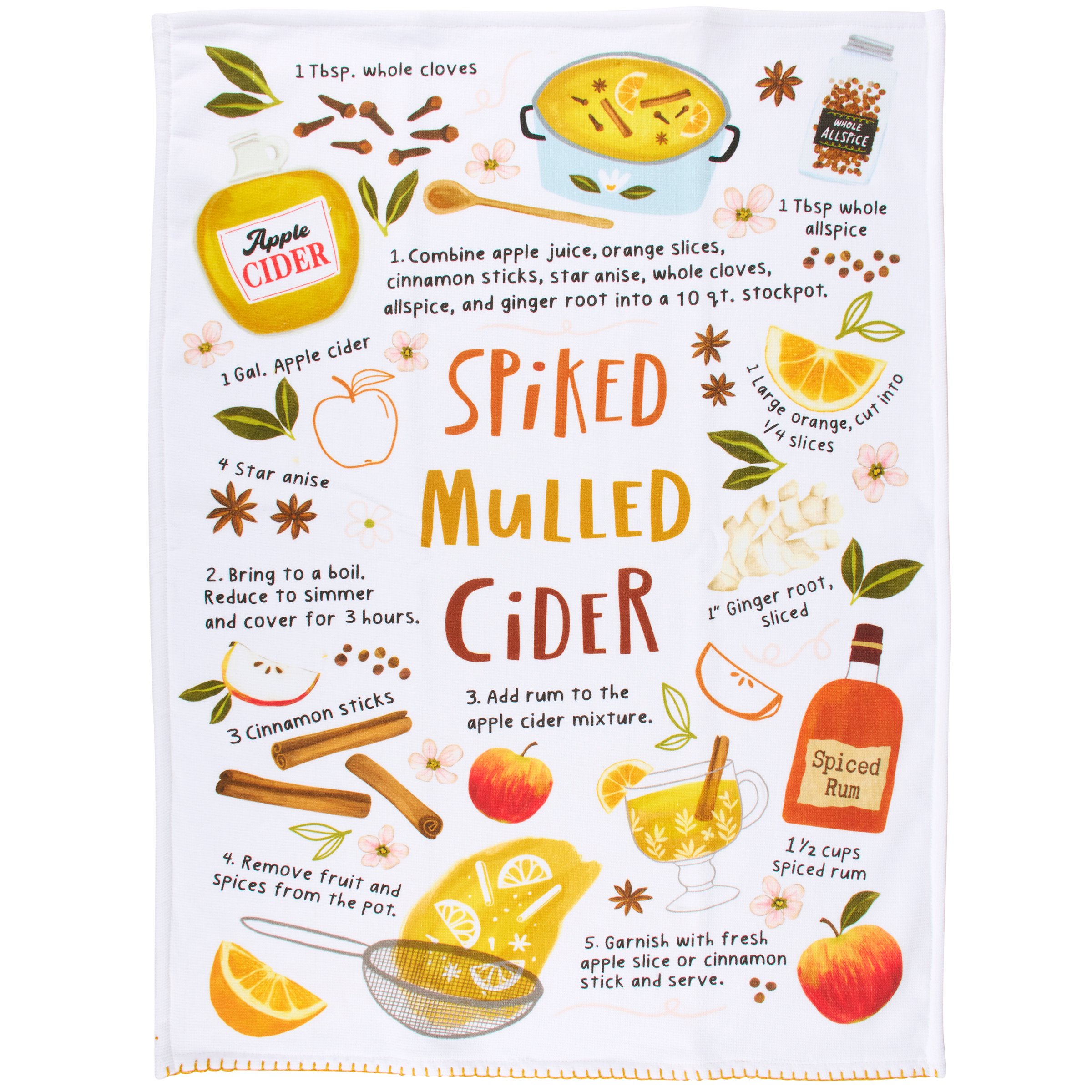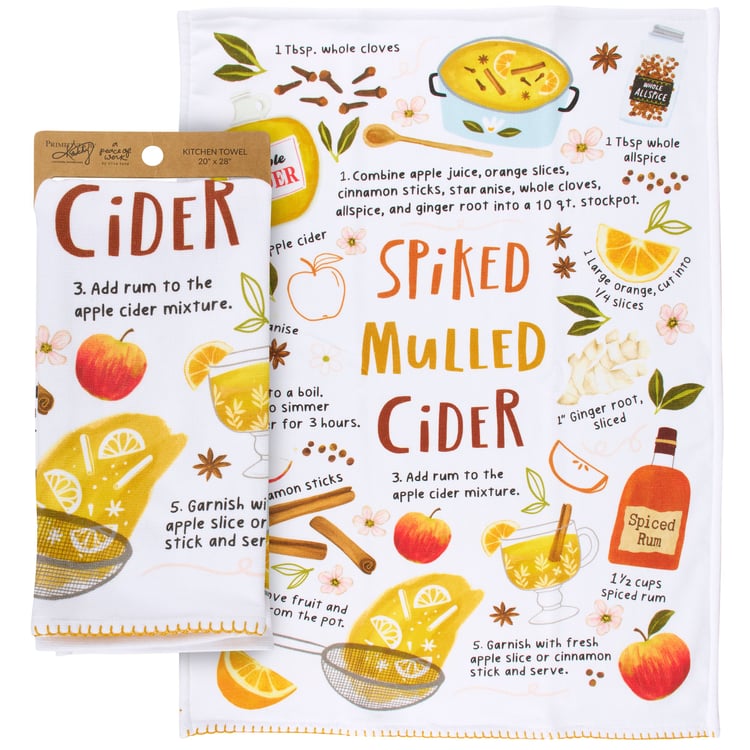 A cotton kitchen towel from our Fall & Harvest Collection featuring an all-over design displaying fun recipe inspired art replicated from original hand illustrated artwork. Homestead fall recipe design features instructions for making homemade spiked mulled cider with coordinating illustrations. Spiked mulled cider recipe is printed on textured slub fabric with a complementing orange hem stitch at the bottom. Fall recipe kitchen towel features a terrycloth layer on the back for added absorbency and corner loop for hanging. Our Spiked Mulled Cider Recipe kitchen towel is conveniently machine washable for easy cleaning. Seasonal kitchen towel is packaged on a cardboard hanger with hole to easily display on rack. A fun fall recipe themed gift perfect for a seasonal kitchen accessory.