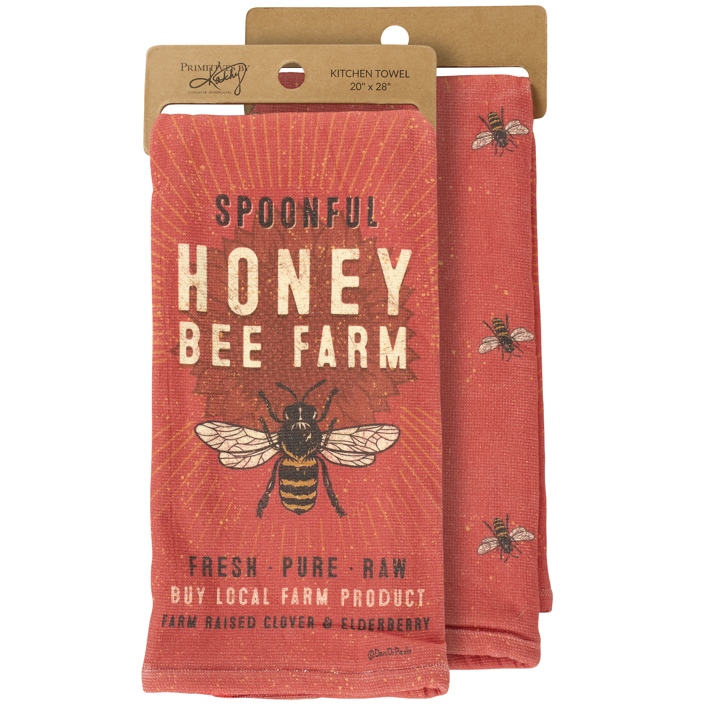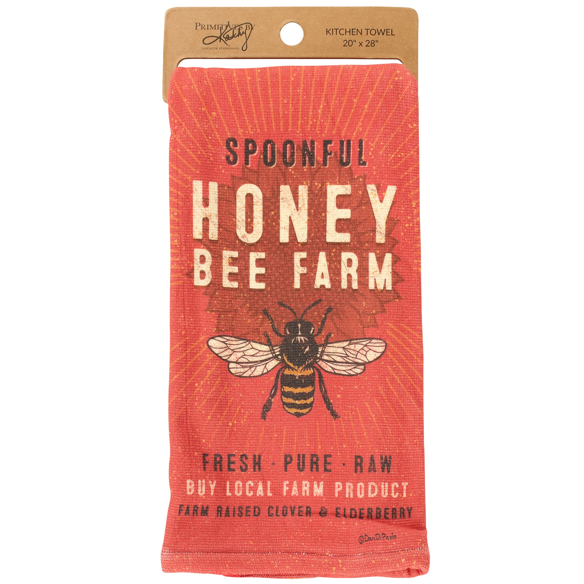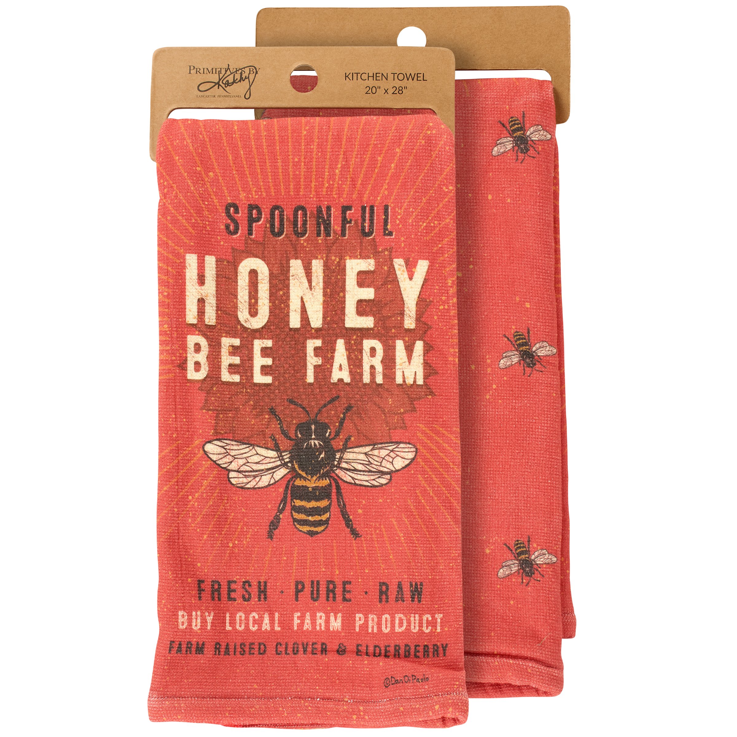 A cotton kitchen towel from ourĀ Homestead Collectiondisplaying a rustic local farm inspired design of a bee and flower with a sentiment that reads "Spoonful Honey Bee Farm - Buy Local Farm Product." Farm kitchen towel also features an all-over design of bees and terrycloth layer on the back for added absorbency. Our Spoonful Honey kitchen towel is conveniently machine-washable for easy cleaning. Rustic towel is packaged on a cardboard hanger with hole to easily display on rack. A rustic farm-themed kitchen accessory perfect for everyday use.