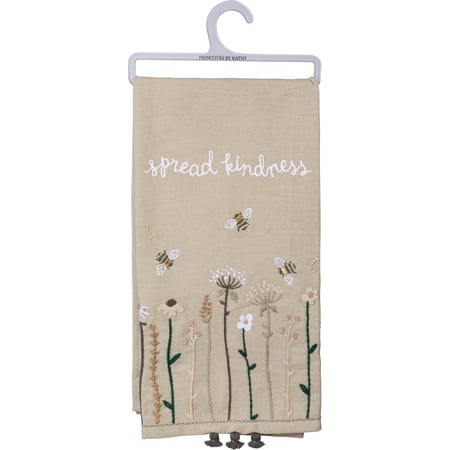 A linen-blend kitchen towel featuring an embroidered "Spread Kindness" sentiment with floral and bumblebee designs, metallic accents, and tassel trim details. Complements well with coordinating pieces in collection for a charming spring display. Machine-washable.